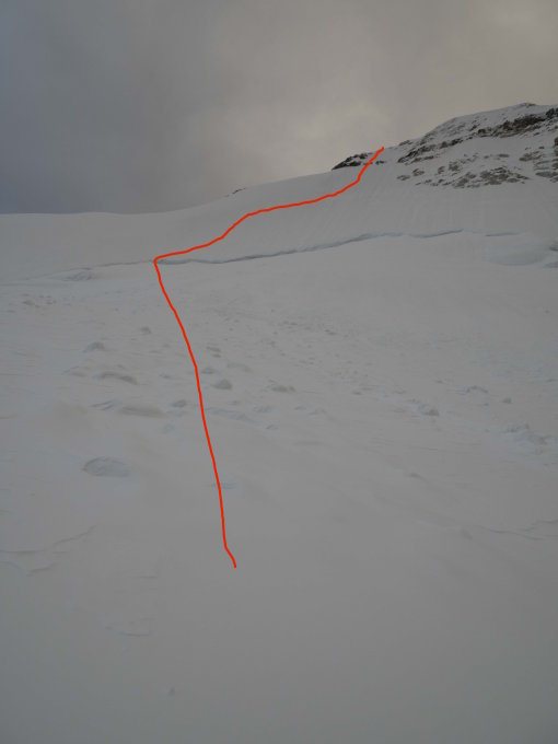 Nordwand: Der Zugang zur Wand wird durch einen relativ grossen Bergschrund versperrt. Es hat an mehreren Stellen aber noch gute Schneebrücken, die ein relativ einfaches und sicheres Passieren erlauben. Im unteren Teil der Wand (ca. 50 – 55 Grad steil) sehr guter Trittschnee, der aktuell noch nicht verfirnt ist. Man kann die Steigeisen aber durchgehend ca. 10cm tief setzen. Im obersten Teil der Wand nur noch sehr dünne Scheeauflage auf dem Eis. Wir sind im linken Drittel der Wand eingestiegen und sind dann immer leicht rechts haltend direkt gegen den Gipfel gestiegen. Die letzten 30m durch 60 Grad steiles Mixed-Gelände, das einen ca. 40m vor dem Gipfel auf den NE-Grad führt. Aufgrund der Kälte und der noch soliden Schneedecke keinerlei Steinschlag.
