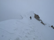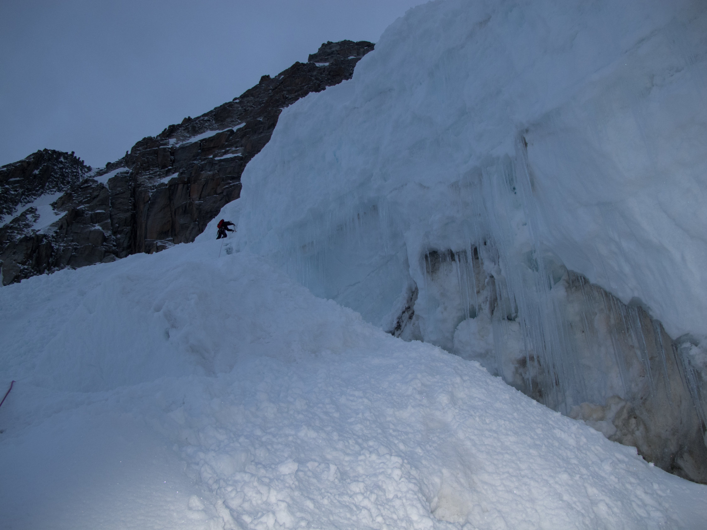 Momentan ausgezeichnet, da der häufig schwierige Bergschrund sogar an zwei Stellen recht einfach an seinem linken Ufer über Lawinenrinnen und die dazugehörigen Kegel überwunden werden kann. Noch schöne Schnee- und Firnauflage, gelegentlich schaut schon drunter das Eis vor. Nach etwa 100 Hm ein bisschen Mixed-Gelände, aber nicht wirklich schwierig. Oben raus tolle Verhältnisse, werden auch noch einige Wochen halten, wenn's nicht zu heiß wird. Der Grat zum Gipfel ist teilweise delikat, und die Spur bedenklich nahe am Wächtenabbruch. Aufpassen! Abseilen über das linke Ufer ds Couloirs mit 60m-Doppelseil schnell möglich, mit 16 Schraubgliedern kommt man wieder bis über den Bergschrund runter.