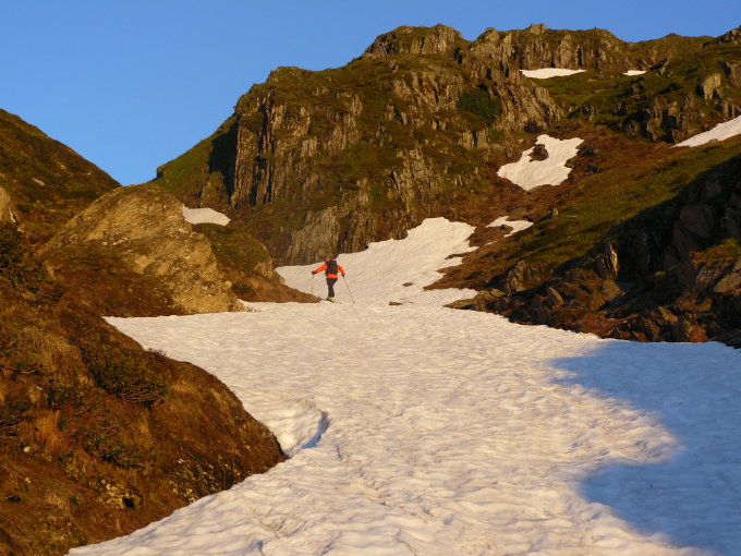 Absolute Topverhältnisse. Start 6.30h an der Nufenen-Passstrasse, 20 Min. Skitragen, dann durchgehende Schneedecke auf der ganzen Tour, Schlussaufstieg auf der italienischen Seite mit Harscheisen, kurzes Steilstück mit Steigeisen, Abfahrt problemlos bei besten Schneeverhältnissen zw. 10 und 11 Uhr. Durch Rinne unterhalb Corno Grieshütte bis 10 Min. oberhalb Startpunkt.