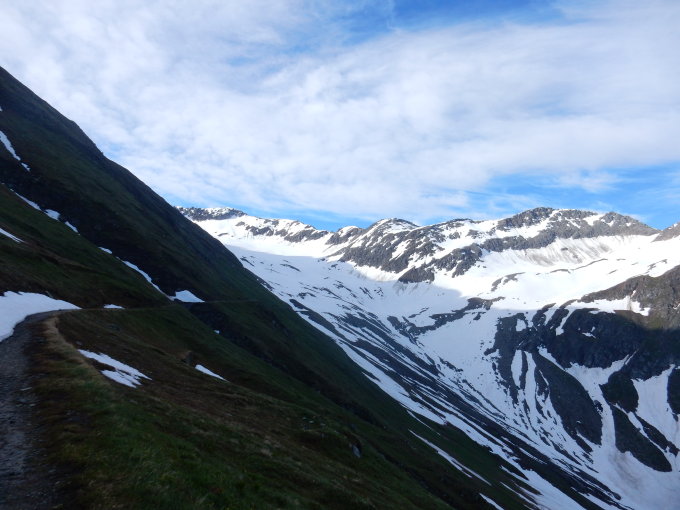 Noch recht gut, Ski können nach ca. 30 minütigem Marsch am Beginn des eigentlichen Anstieges ab Fahrstrasse angezogen werden. Die ersten ca. 200hm noch recht ruppige Oberfläche, ab ca. 2700m dann aber wunderbar "glatt".
