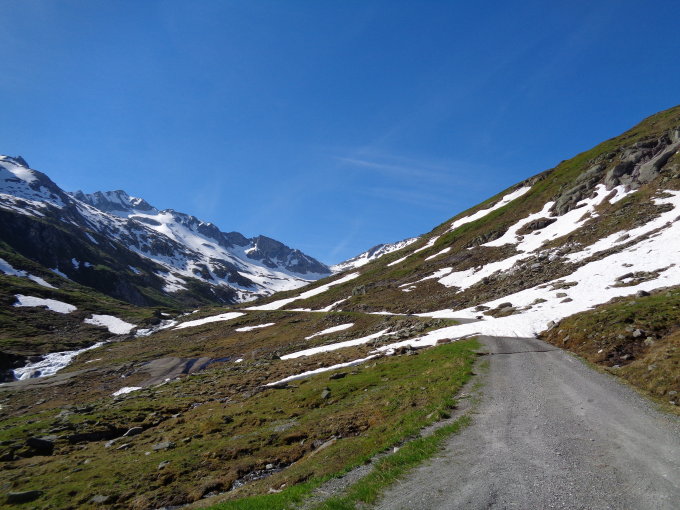 Mit der Fahrbewilligung ins Witenwasserental hinauf bis dort wo der Schnee die Strasse versperrt. Ab hier den Fahrweg und den Wanderweg ca. 20 min. Richtung Rotondohütte. Skier anschnallen und durchgehend bis zum Skidepot schieben. Unten Büsserschnee vom feinsten, auf dem "Gletscher" oben eine schöne Firnauflage.