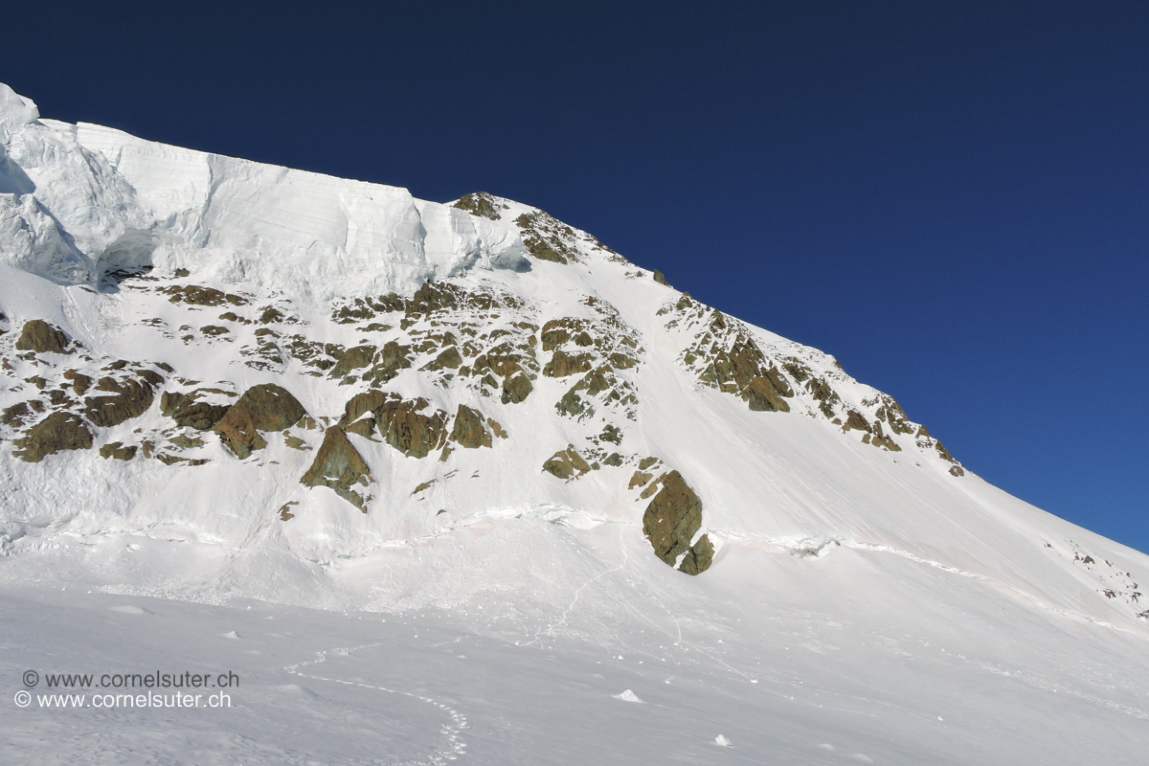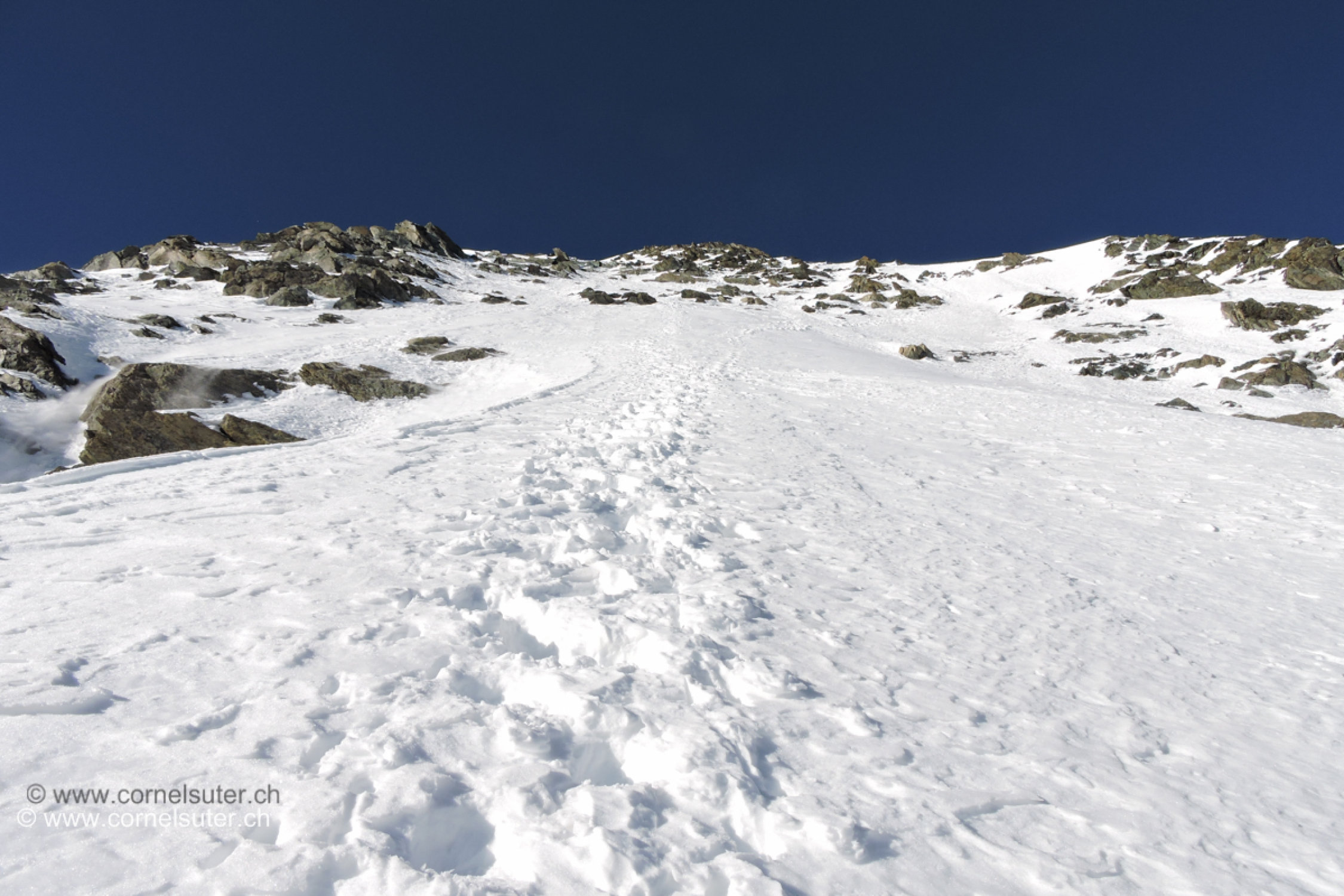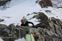 Der Einstieg zur Schlusswand verläuft etwas links (östlich) an einem Felsen entlang. Die Überquerung des Bergschrundes geht momentan noch gut, könnte sich aber ändern….. später quert man etwas weiter oben in die Wand hinein. In der Wand gute Verhältnisse, schöne Tritte, einzig an einer Stelle etwas wenig Schnee auf Eis. Die weitere Route hinauf über die Gipfelfelsen die sind noch gut mit Schnee bedeckt, teilweise verfirnt, nach dem letzten Felsriegel unterhalb des Gipfels da ist der Schnee nicht verfirnt sondern Schuh tief unverfestigt…..