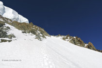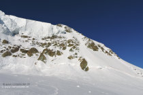 Beim Anstieg zum östlichen Triftjigletscher muss man über eine ältere Eislawine steigen, der weitere Aufstieg durch die Flanke geht sehr gut, auch da hart und gefroren. Entweder alles in dieser Flanke hinauf steigen bis zum Felsriegel, oder schon etwas weiter unten auf den Grat/Felsen wechseln und hinauf zum Felsriegel, weiter auf einem schönen kurzen Firngrat zu einem Gletscherplateau auf ca 3600m, angekommen um 6 Uhr.
