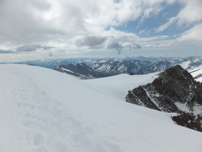 Start ab Umpol. Aufstieg auf dem Sommerweg bis oberhalb 1. Gletscherbruch. Mit Ski zum 2. Gletscherbruch. Hier an der aperen Stelle die Steigeisen montiert und kurz zu Fuß einige Meter hoch. Mit Ski bis zum Gipfel.