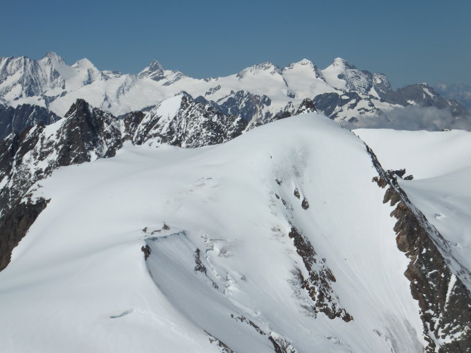 Wegen des kalten Windes nicht aufgefirnt. Abfahrt vom Gipfel über den harten Westhang. Auf der Gletscherebene etwas weicher. Gute Verhältnisse (hart und sulzig) zum 2. Gletscherbruch. Wie gestern mit einer Querung abgefahren.