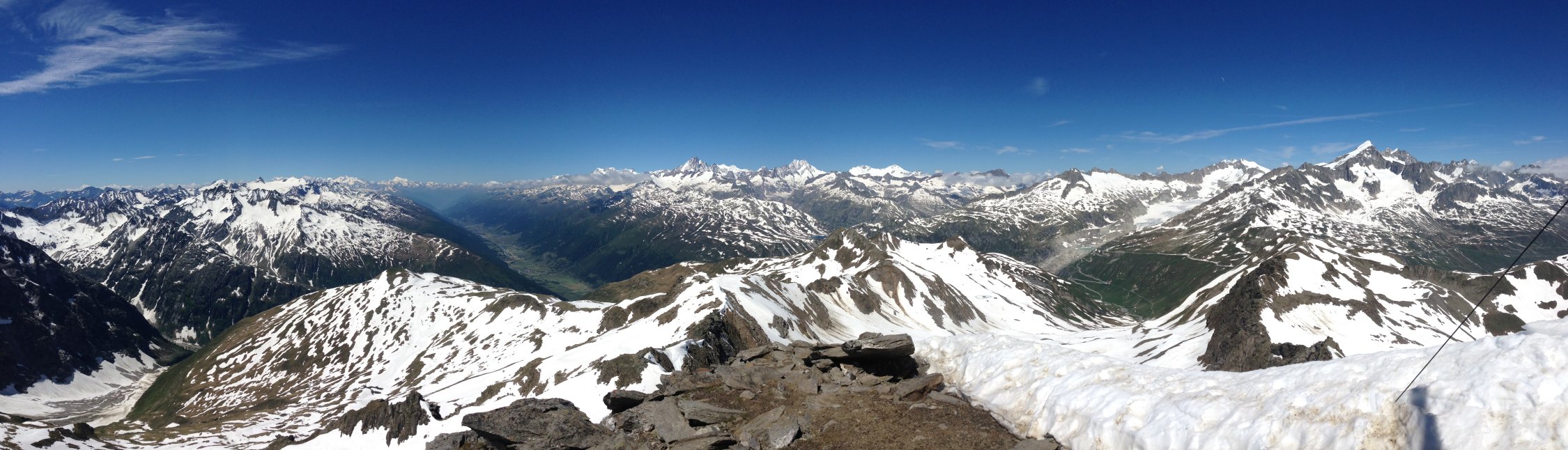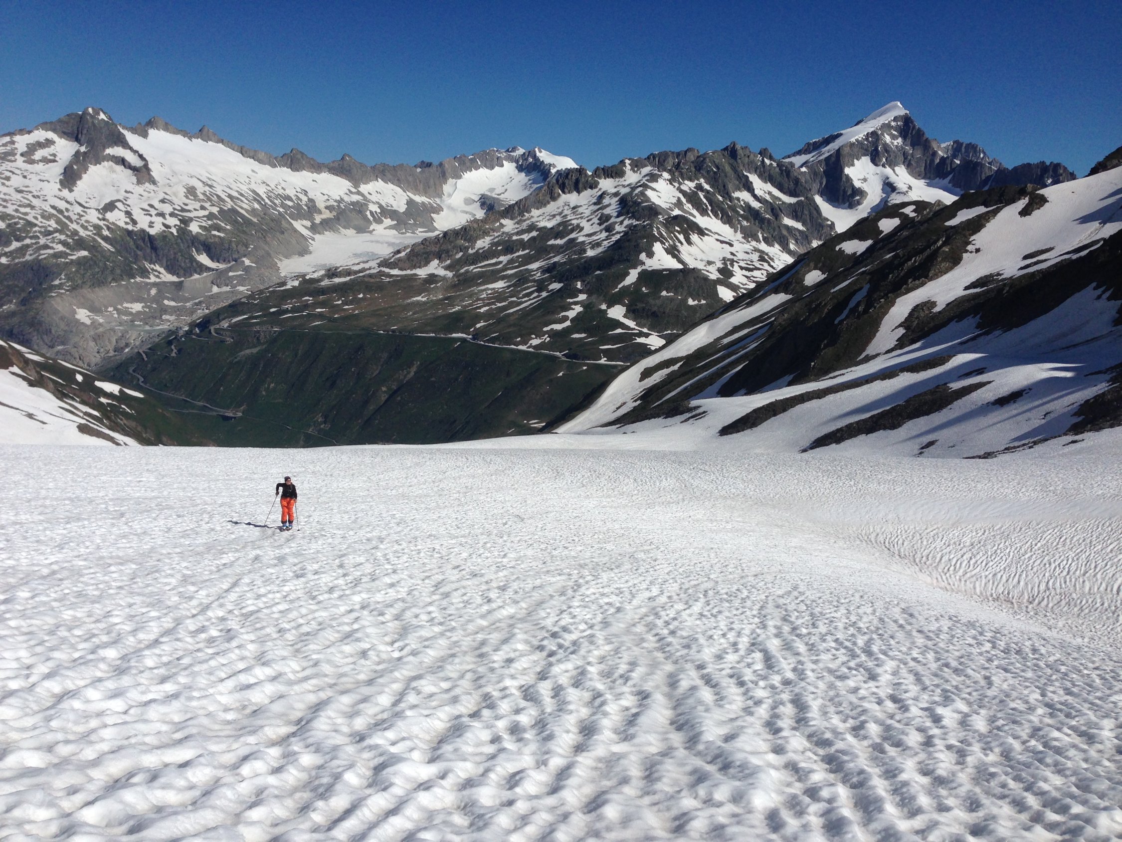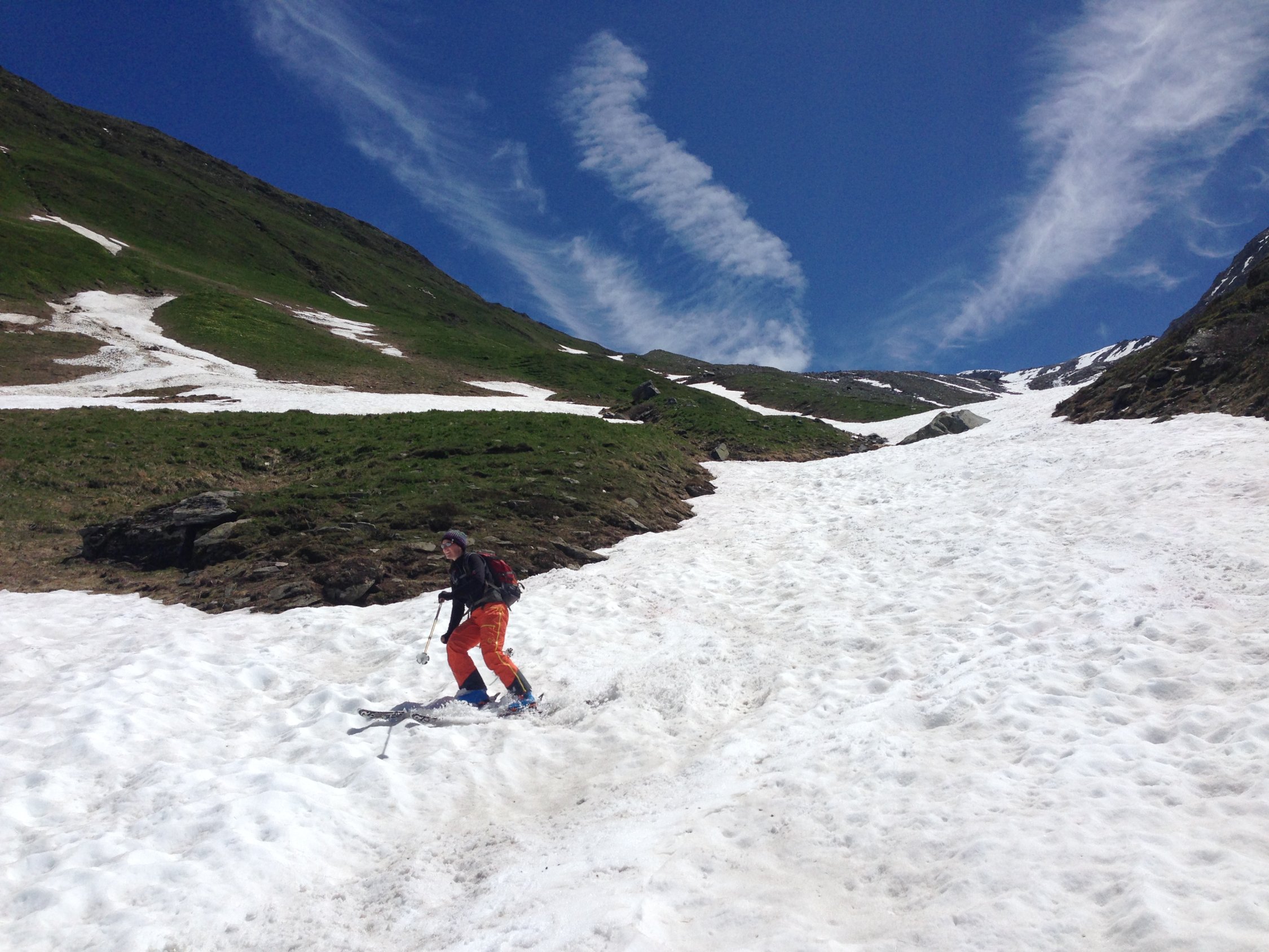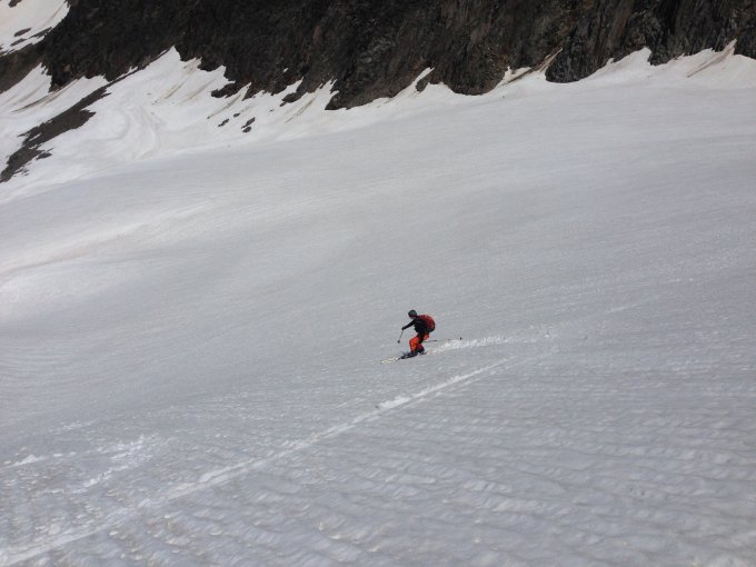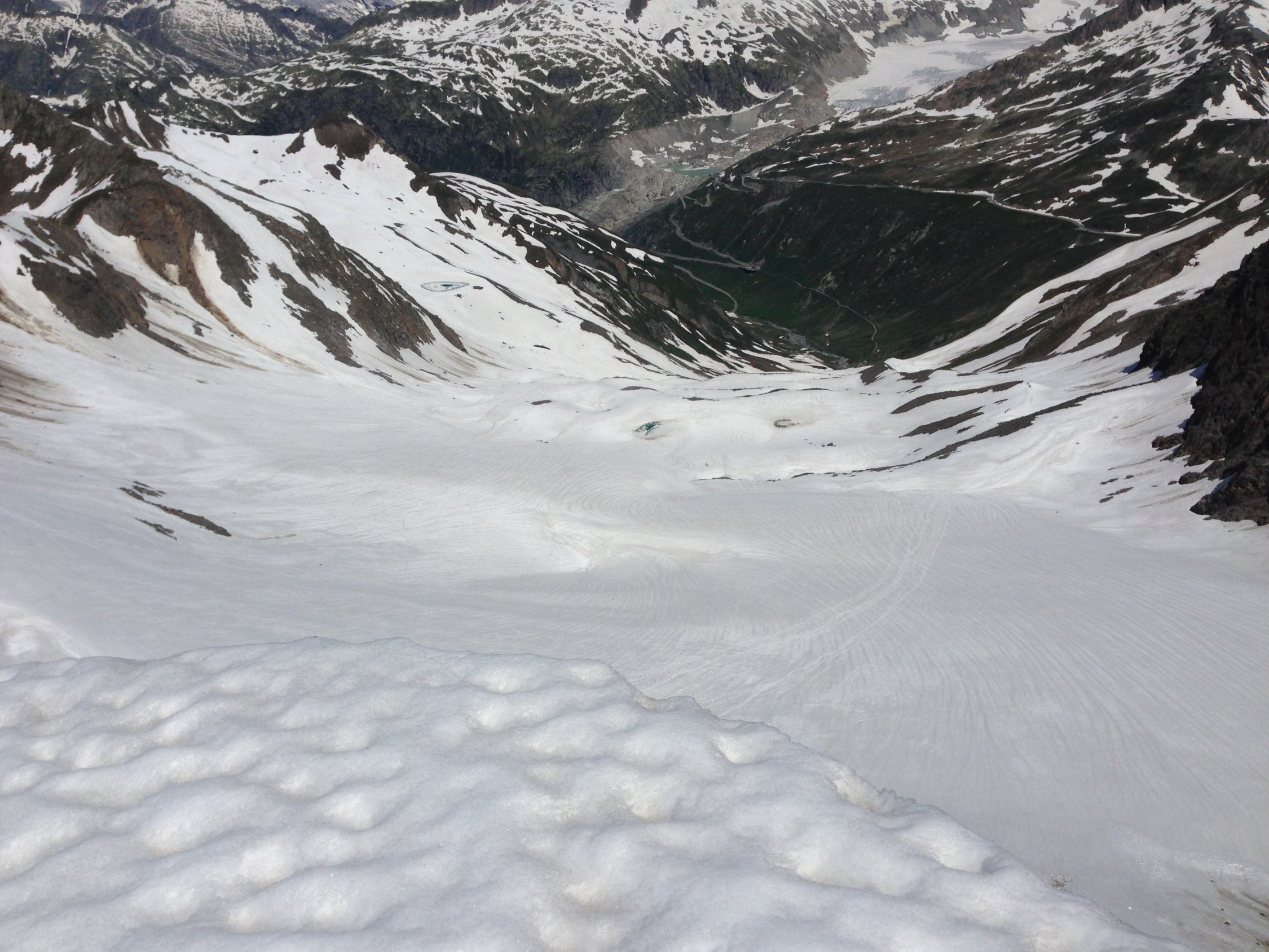 Wir können die Einträge der letzten Tage nur noch einmal bestätigen - es herrschen traumhafte Verhältnisse für Ende Juni. Immer noch ist der Start ab Station Muttbach-Belvedere an den Bahngleisen möglich. Derzeit noch durchgehende Schneedecke. Sommerharter Schnee, der jedoch im unteren Teil in Form extremen Büserschnees aufwartet. Am Morgen war dieser knochenhart. Im oberen Teil gibt es noch viel Schnee und der Gletscher ist gut eingedeckt. Die Steilflanke zum Grat rauf besitzt gute Trittspuren. Der Grat selbst hat eine größere Unterbrechung. Generell ist im oberen Bereich ein Pickel und Steigeisen empfehlenswert. Die Steilflanke kann mit entsprechendem Auffirnen noch gut befahren werden. Am Gipfel hatten wir dann heute eine geniale Sicht und ein wunderbares Panorama bis zum Mont Blanc. Diese Tour haben heute einige genossen, Hochtourer wie Skitürler. Die meisten sind jedoch wohl etwas früh abgefahren und wurden unten in den Schüttelbechern ordentlich durchgeschüttelt. Derzeit heißt es nicht zu früh zu starten und lieber etwas länger das Panorama genießen, was einem bei diesem Berg nicht schwer fallen sollte - je später, desto besser. Wir sind um 13:00Uhr abgefahren und hatten fantastischen Firn im oberen Teil. Selbst der untere Teil hat sich dann gut fahren lassen. Der Büßerschnee war dann soweit aufgefirnt, dass man gut durchpflügen kann. Abfahrt dann direkt bis zur Bahntrasse - was will man mehr im Sommer ;-)) Eine wunderschöne Abschlusstour, wie man sie sich nur wünscht.