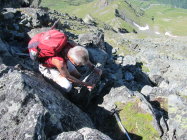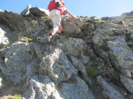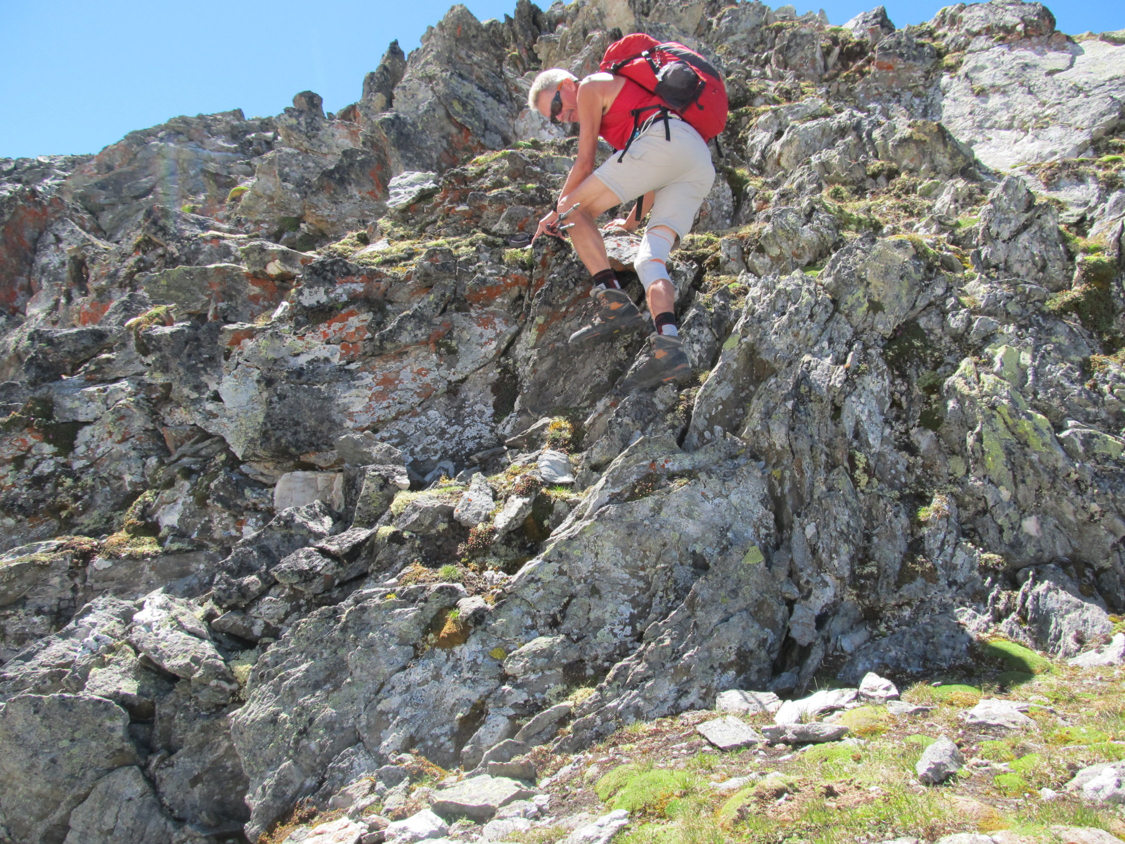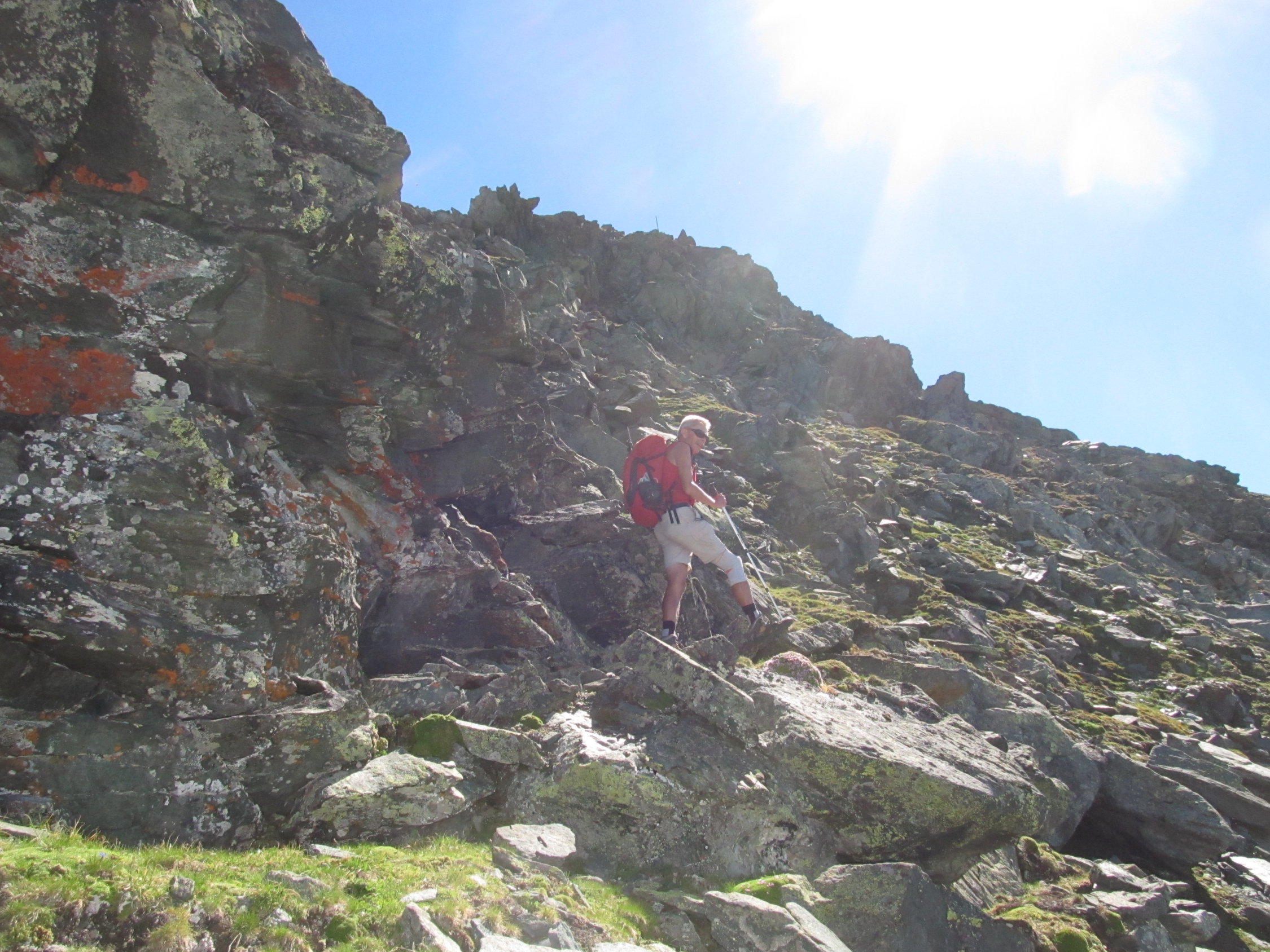 Schwierigkeitsbewertung ein T4+ und maximal ein II zum Klettern. Die Wegfindung nach Gespür.
