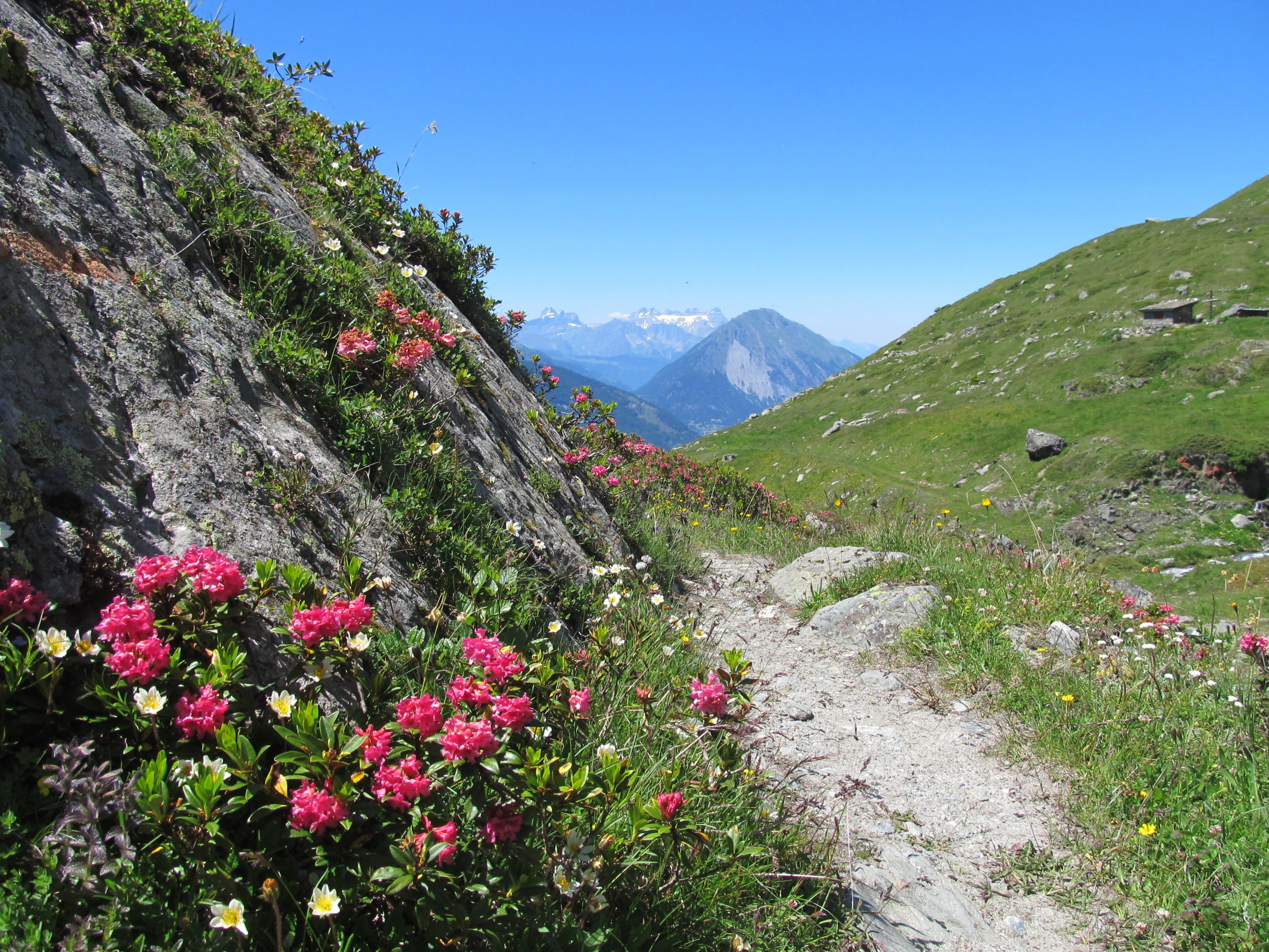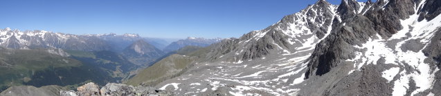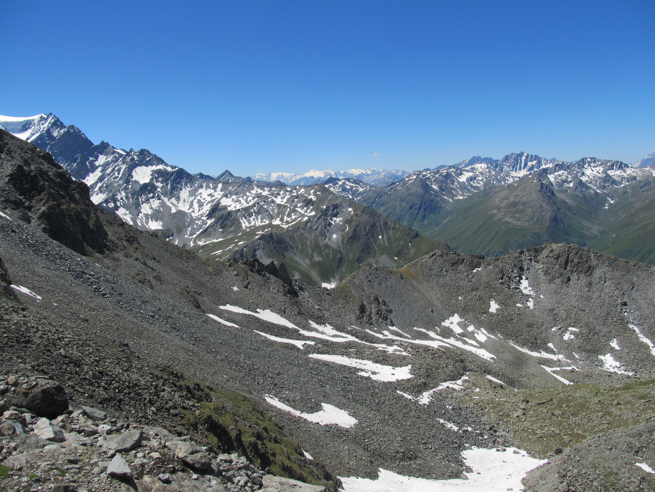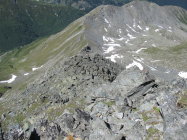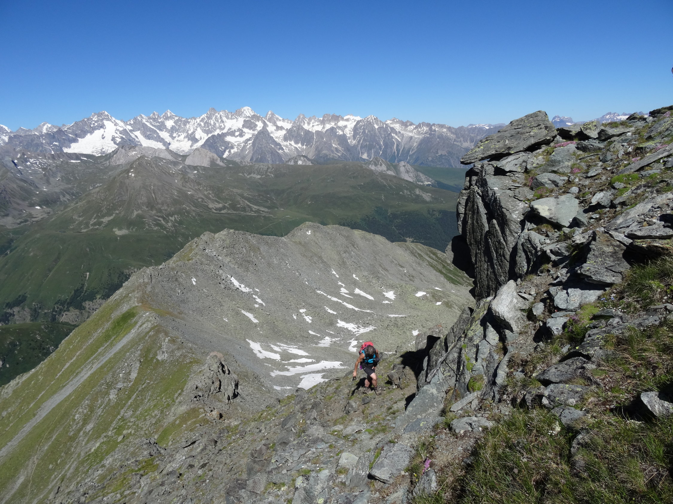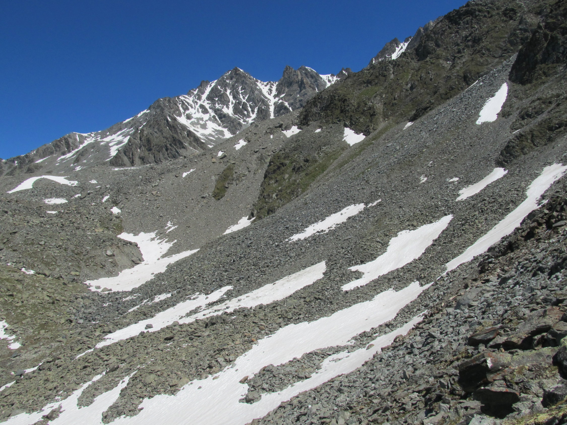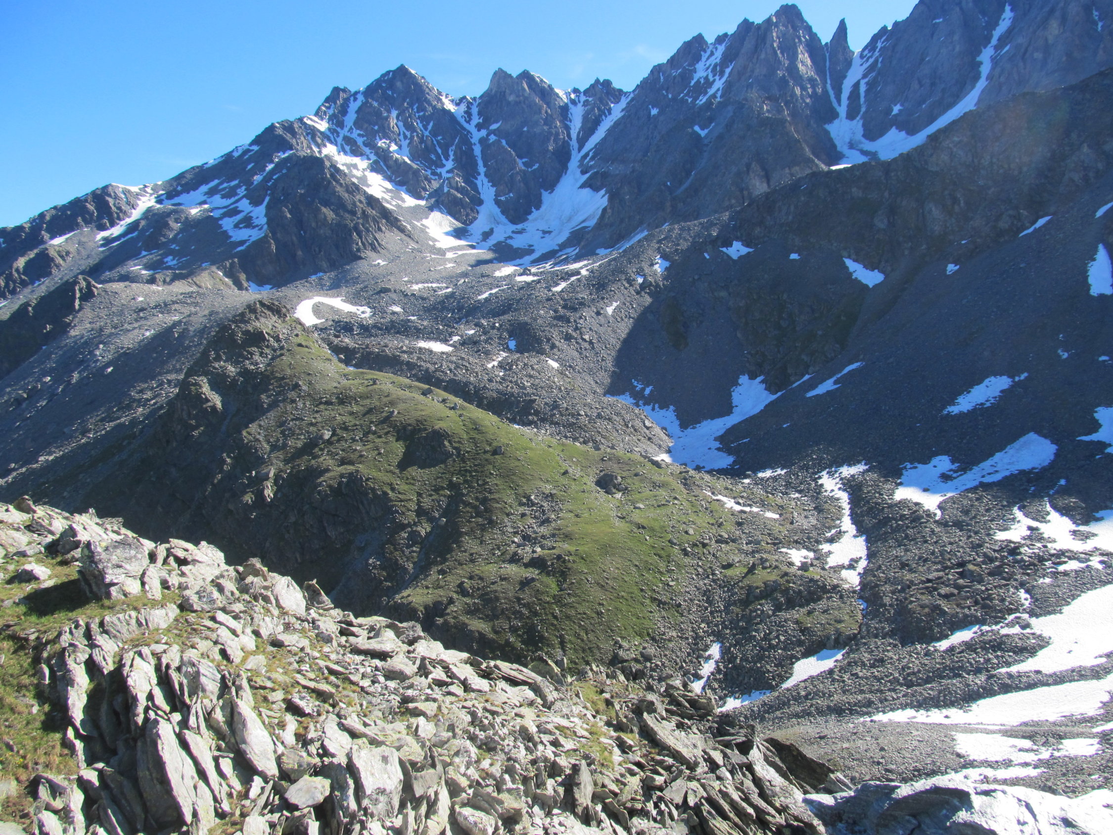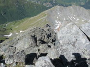 Als Variante haben wir uns für den Nordgrat entschlossen, wobei man besser immer in Gratnähe bleibt, es findet sich immer einen Durchschlupf. Über den Rücken Richtung Six Noir gibt's keine wirklichen Schwierigkeiten, auch der Abstieg zu den Schneefelder nicht - es muss aber immer geachtet werden, dass man nicht auf unstabile Platten tritt. Es gibt etliche davon. Ein gutes Gleichgewichtstraining und Training der Reflexe bietet der Abstieg garantiert.
