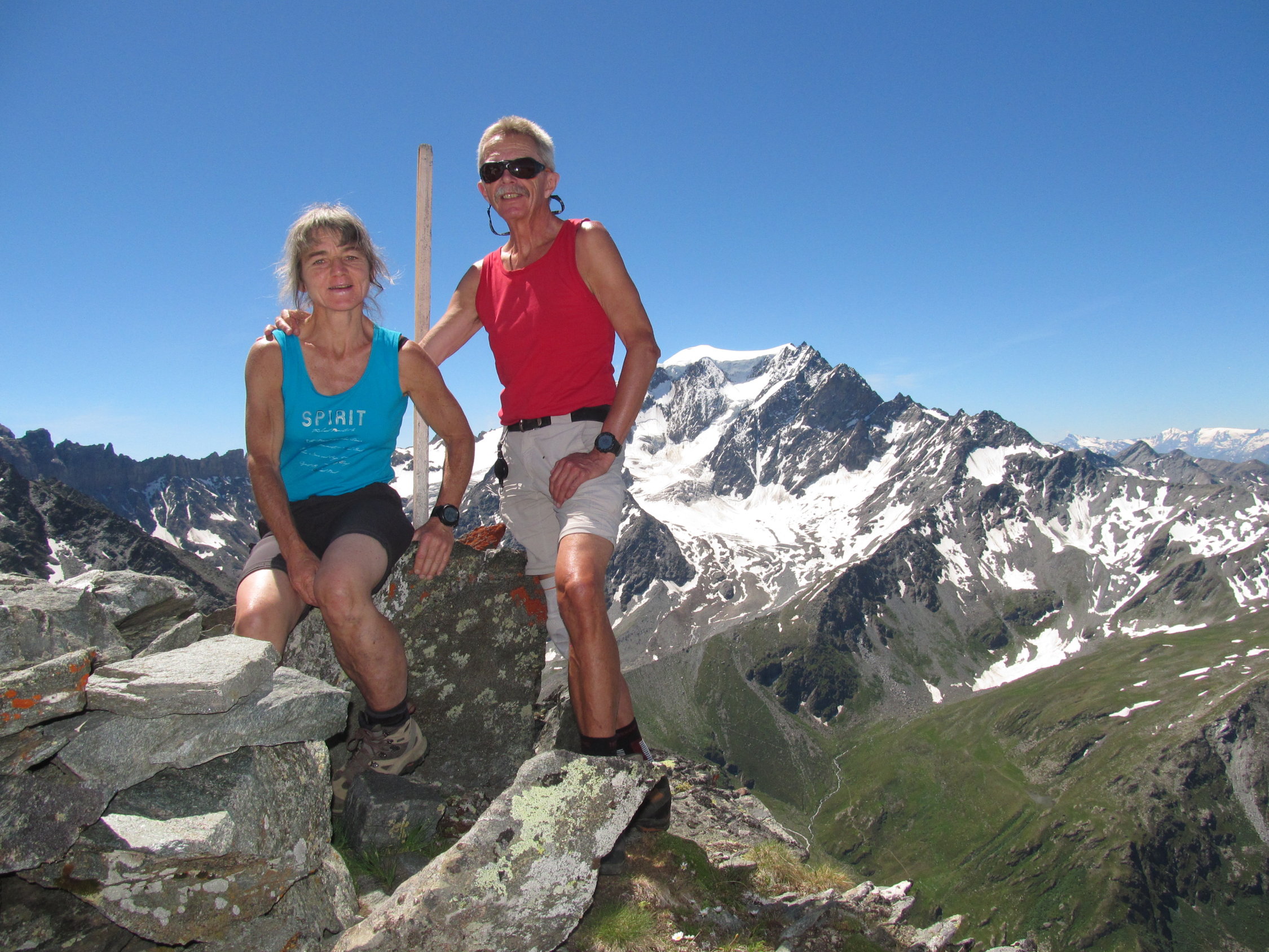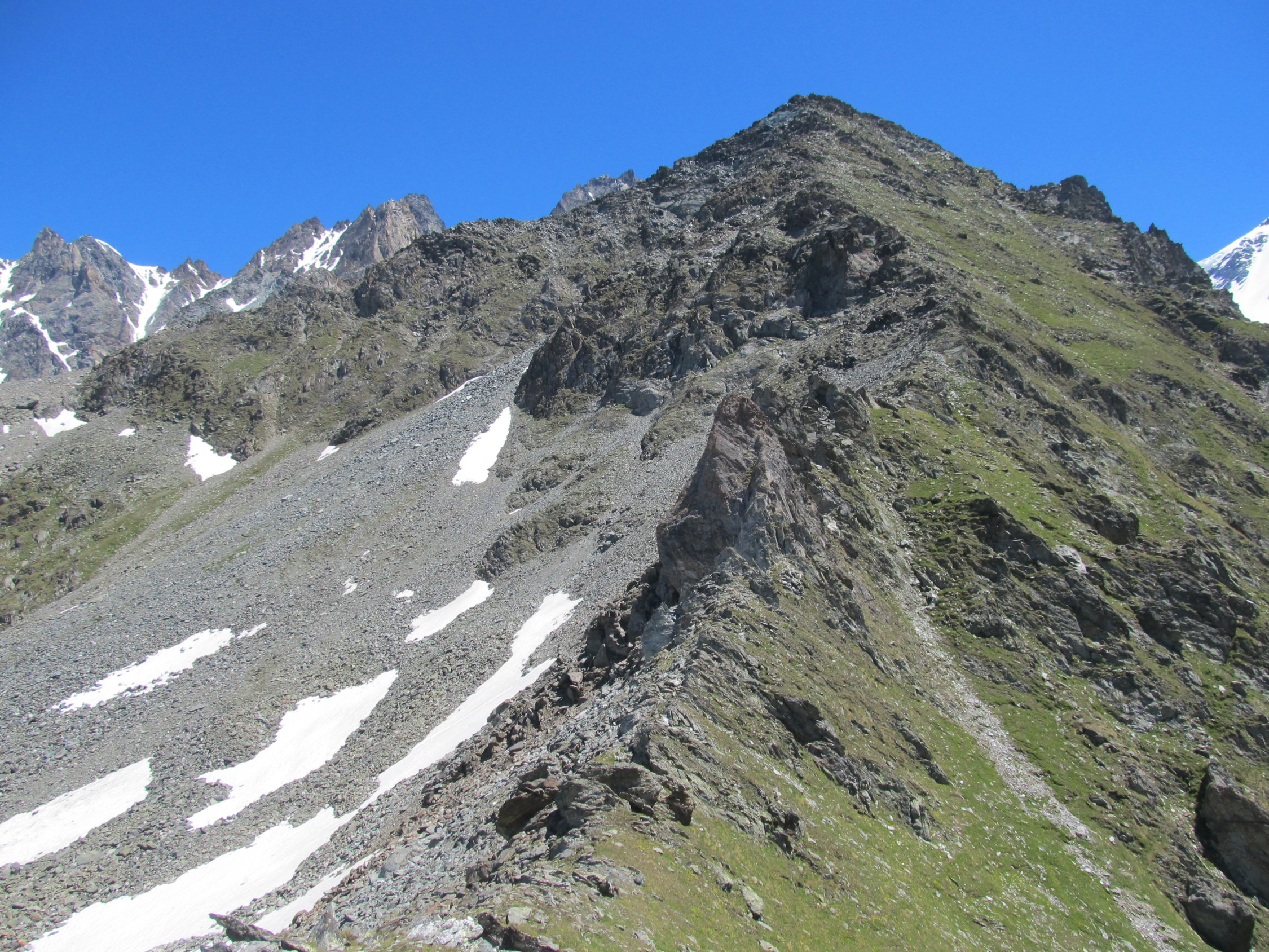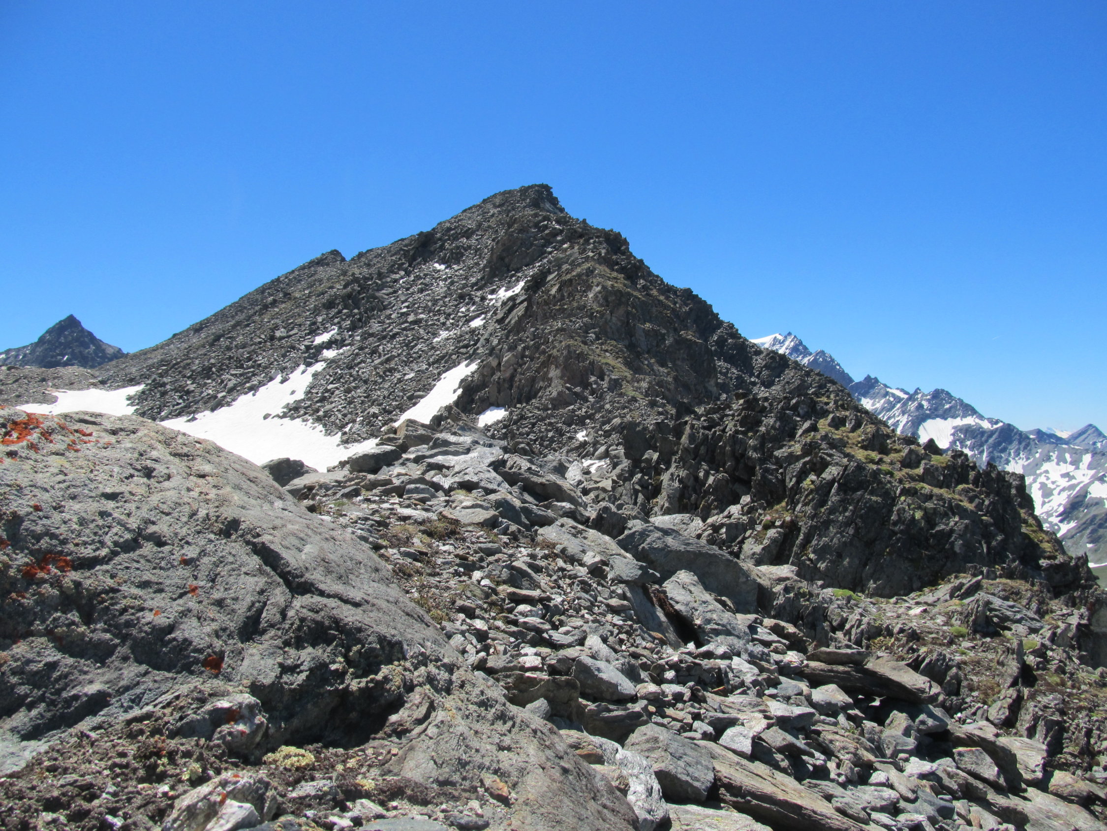 Ein kurzer 3000-er sollte es sein und Toureninfos hatten wir spärlich. West- und Nordgrat seien beide machbar, der Nordgrat etwas weniger steil. Beim Anblick der Geröllwüste schwand uns die Lust auf die Begehung vom Zweitgenannten - hingegen wirkte der Westgrat im Gegenlicht primär etwas abweisend. Bei der gespannten Annäherung war ein eleganter Couloirdurchschlupf rechts der ersten Felsen schnell ersichtlich. Fakultativ konnte in Gratnähe der eine oder andere Aufschwung erklettert, oder allenfalls im dürren moosigen, grasigen oder sandigen Gelände umgangen werden. Weniger Meter nördlich der Gipfelstange braucht es nochmals beide Hände für den Ausstieg zum Gipfel.
