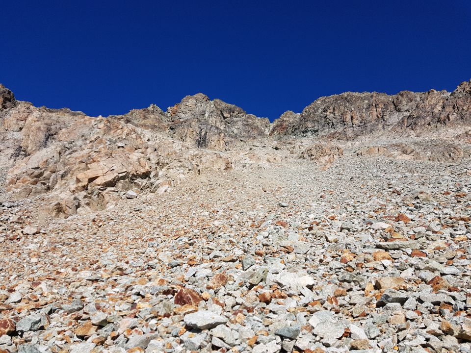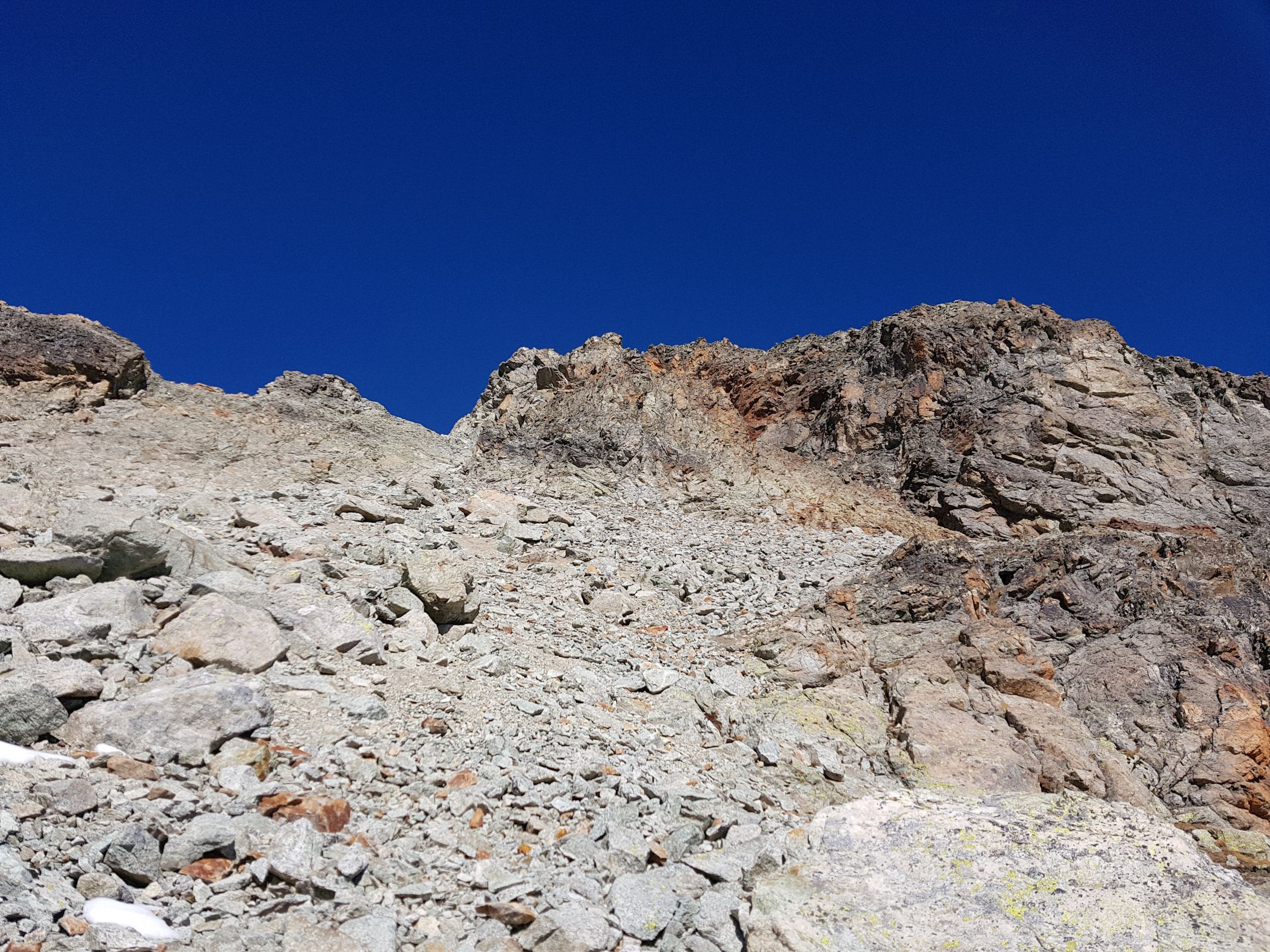 In der Mulde hat es nur noch wenig Schnee drinnen, das jedoch auch problemlos umgangen werden kann. Ab hier kommen nun die Geröllfetischisten auf ihre Kosten. Bis zur oberen S-Wand des Piz Bever komme ich in gutmütigem Geröll effizient weiter. Hier traversiere ich die kurze steile sandige Passage nach Westen und steige auf der anderen Seite nach NW die grosse breite Rinne hoch, die direkt auf dem SW-Grat des Piz Bever endet. Diese ersteigt man entweder mittig in sandigem Kies mit Schutt (besser für den Abstieg) oder auf der westlichen Seite auf die Felsen (besser für den Aufstieg). Der Aufstieg ist nicht ausgesetzt und einfach (T4, I).