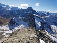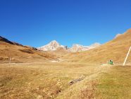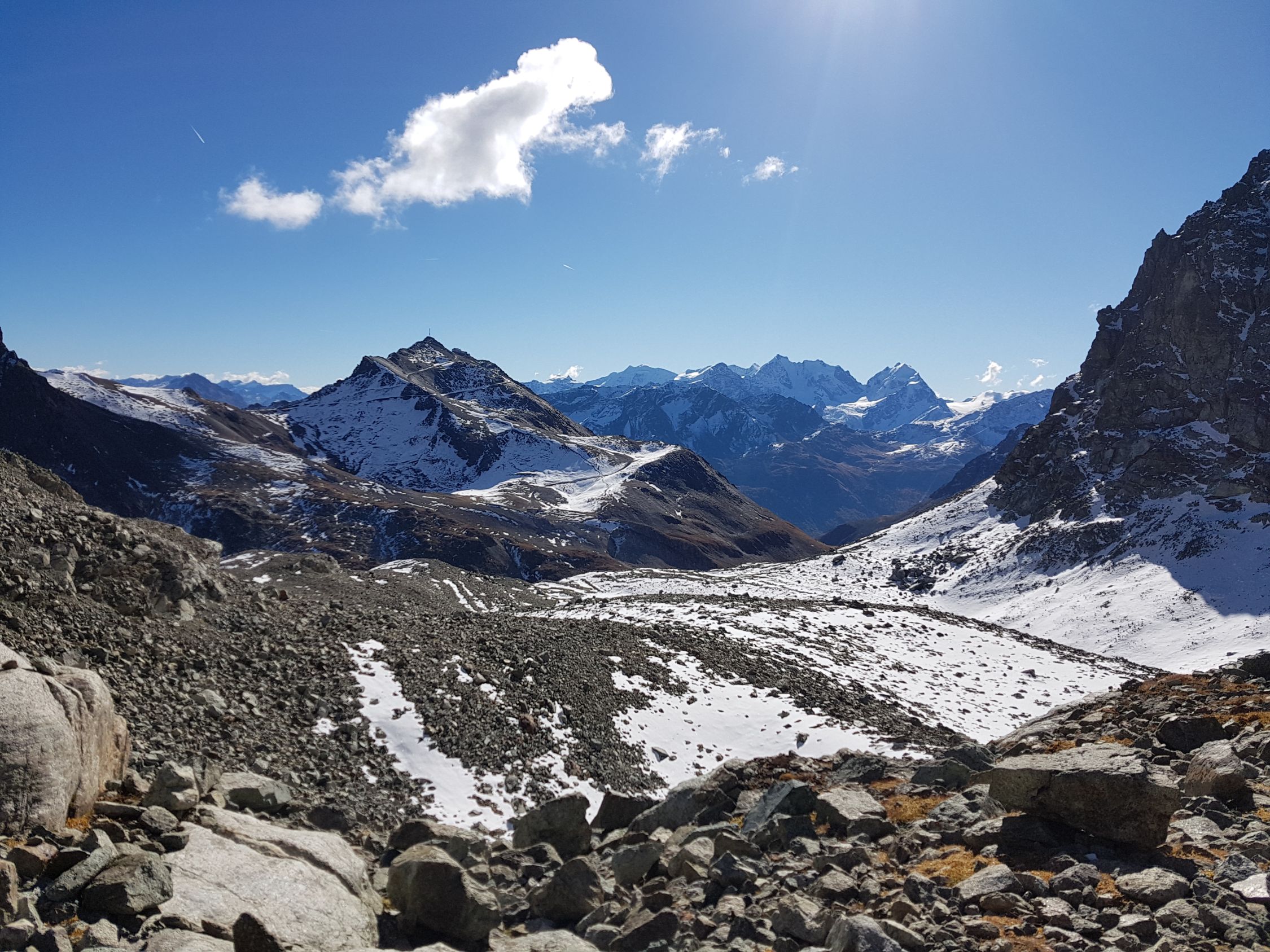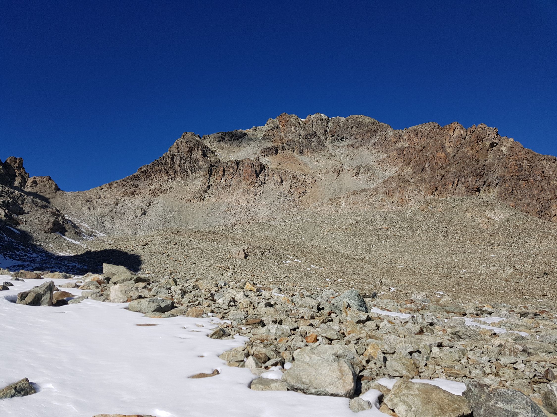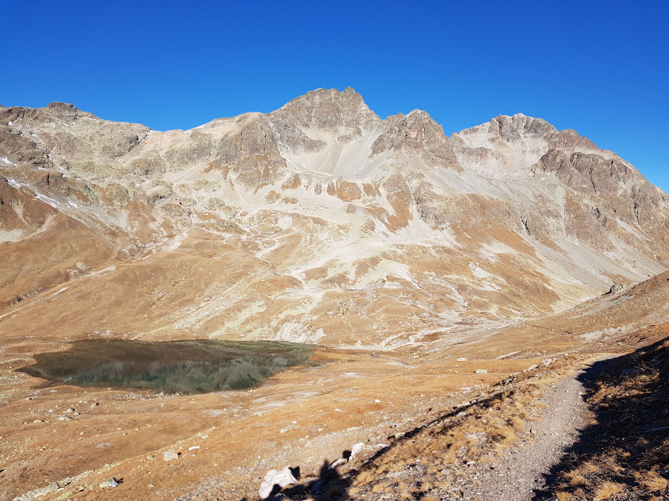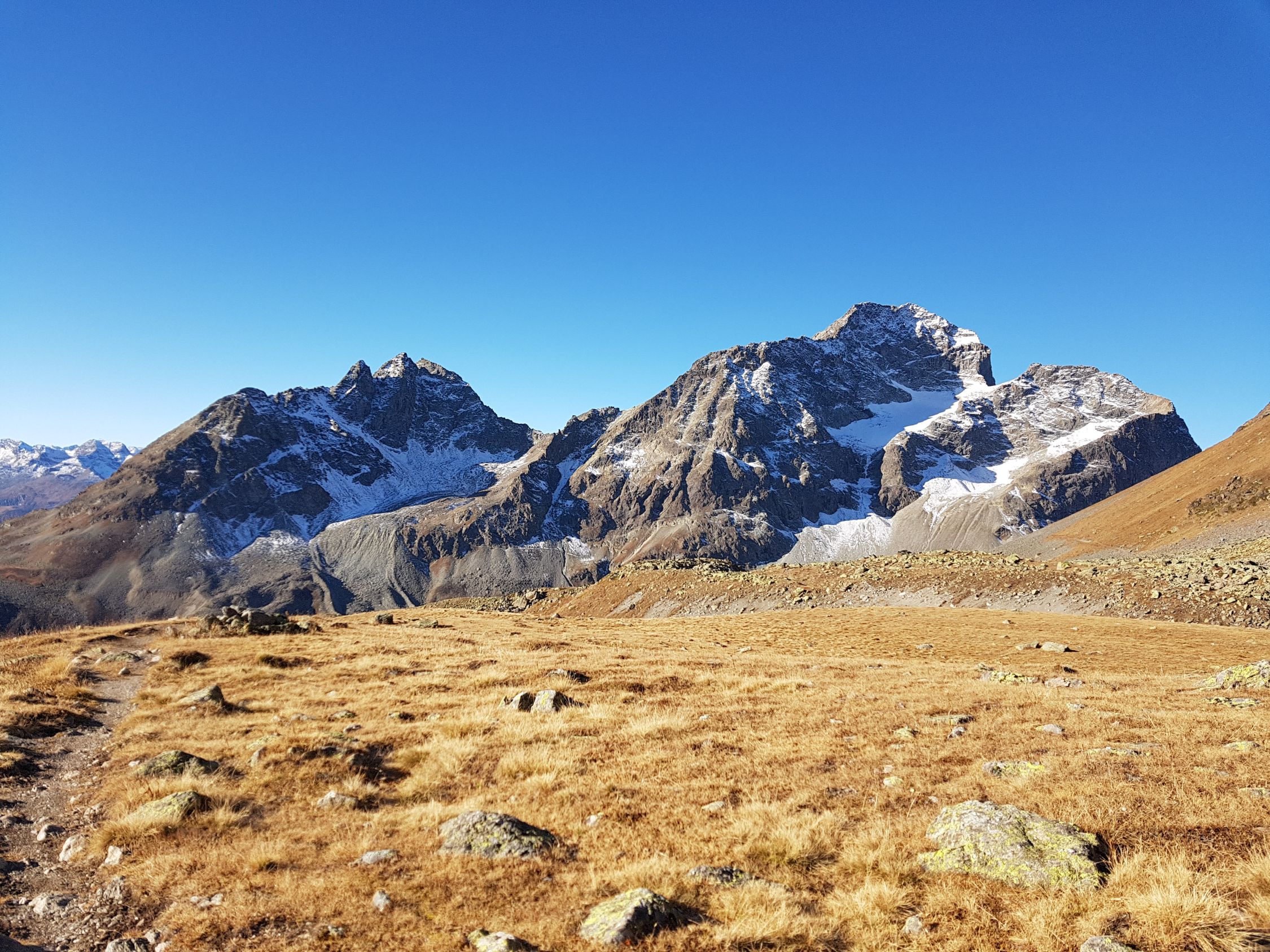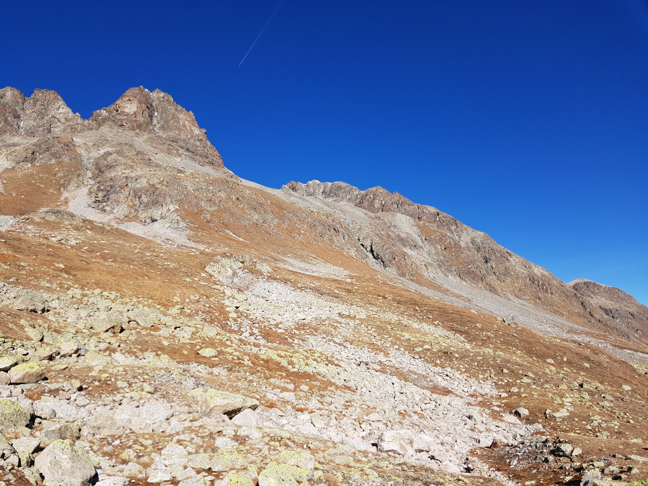 Ab dem Pass Suvretta wandere ich in NW-Richtung zur obigen Ebene der Grevas dal Giaviöl bei P2850Hm. Entweder erreicht man diese südwestlich auf steiler Wiese oder nördlicher gleiches mit leichten Felsen, die zum Kraxeln einladen. Zum Aufwärmen wähle ich für den Aufstieg letzteres.