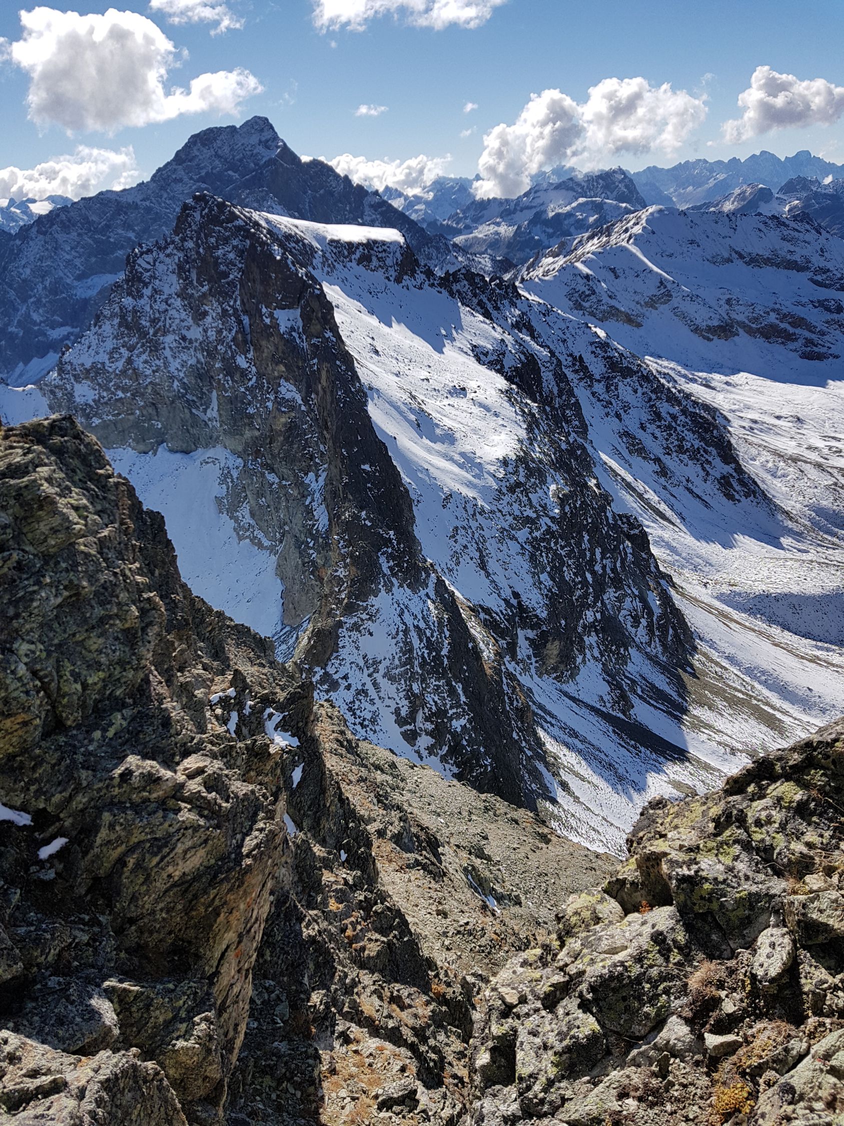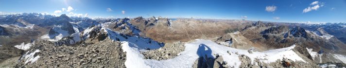 Schon vorher auf dem SW-Grat, wie auch auf dem Piz Bever sehe ich, dass die NW-Flanke des Piz Suvretta stark eingeschneit ist. Meine Überlegung den Piz Suvretta noch anzuschliessen verfliegt deswegen schnell wie im Flug. Hinab westlich unterhalb der Giaviöl da Suvretta (P2974) käme man problemlos, doch danach wäre das eine grosse Plackerei, v.a. ohne Gamaschen…