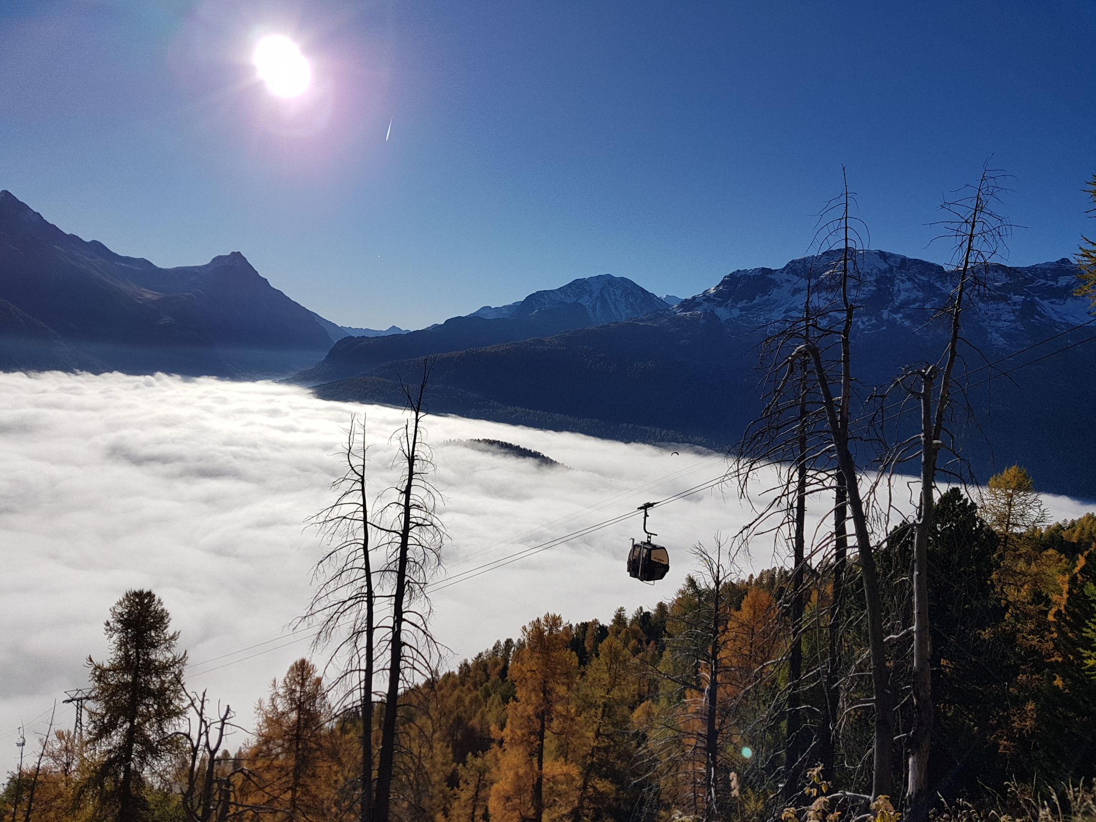 Heute bringt mich die RhB mit dem E-Bike als Zusatzkraft in Celerina aus. Es herrscht kalter und dichter Hochnebel. Verwirrt schaue ich auf die Bahnhofstafel, ob nicht etwa Zürich draufsteht? Im ganzen Engadin herrschte heute Morgen, wie auch schon gestern, Hochnebel, auch bekannt als Engadin Hochnebel.