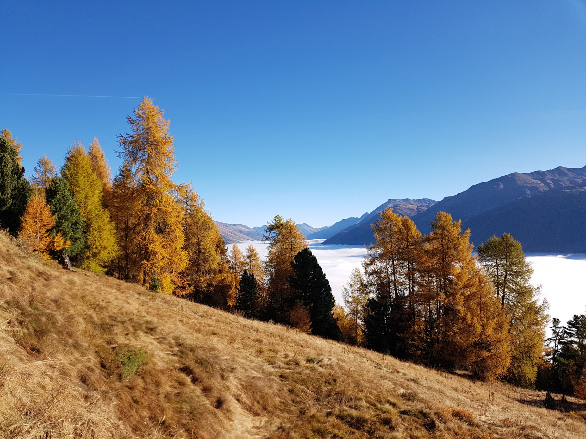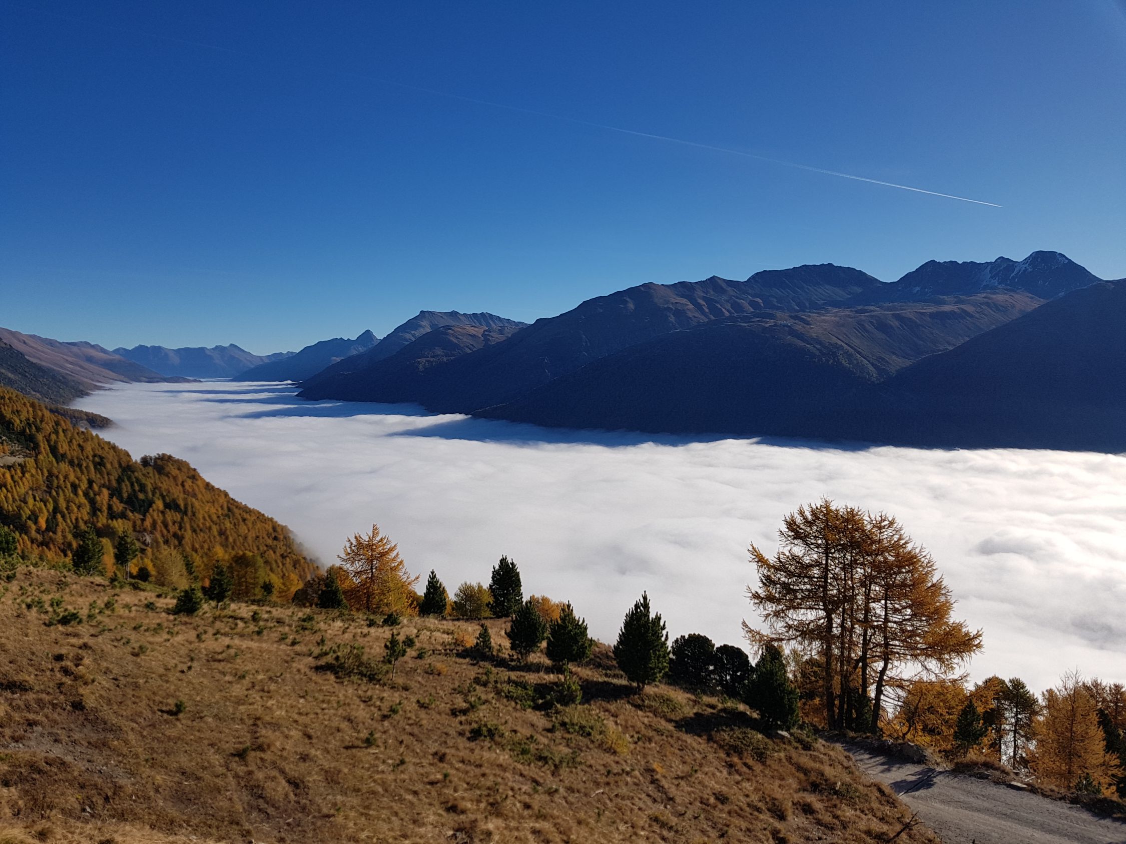Notgedrungen schalte ich mein E-Bike auf Turbo Modus, um möglichst schnell aus dieser Suppe raus zu kommen. Wie ein Pfeil flitze ich den Forstweg hoch nach Marguns und bekomme ab ca. 1900 Hm blauer Himmel mit Sonnenschein! Beruhigt schalte ich den Modus wieder zurück und geniesse die Weiterfahrt in der Wärme und bin froh, dass wir im Val Müstair dieses Phänomen nicht kennen.