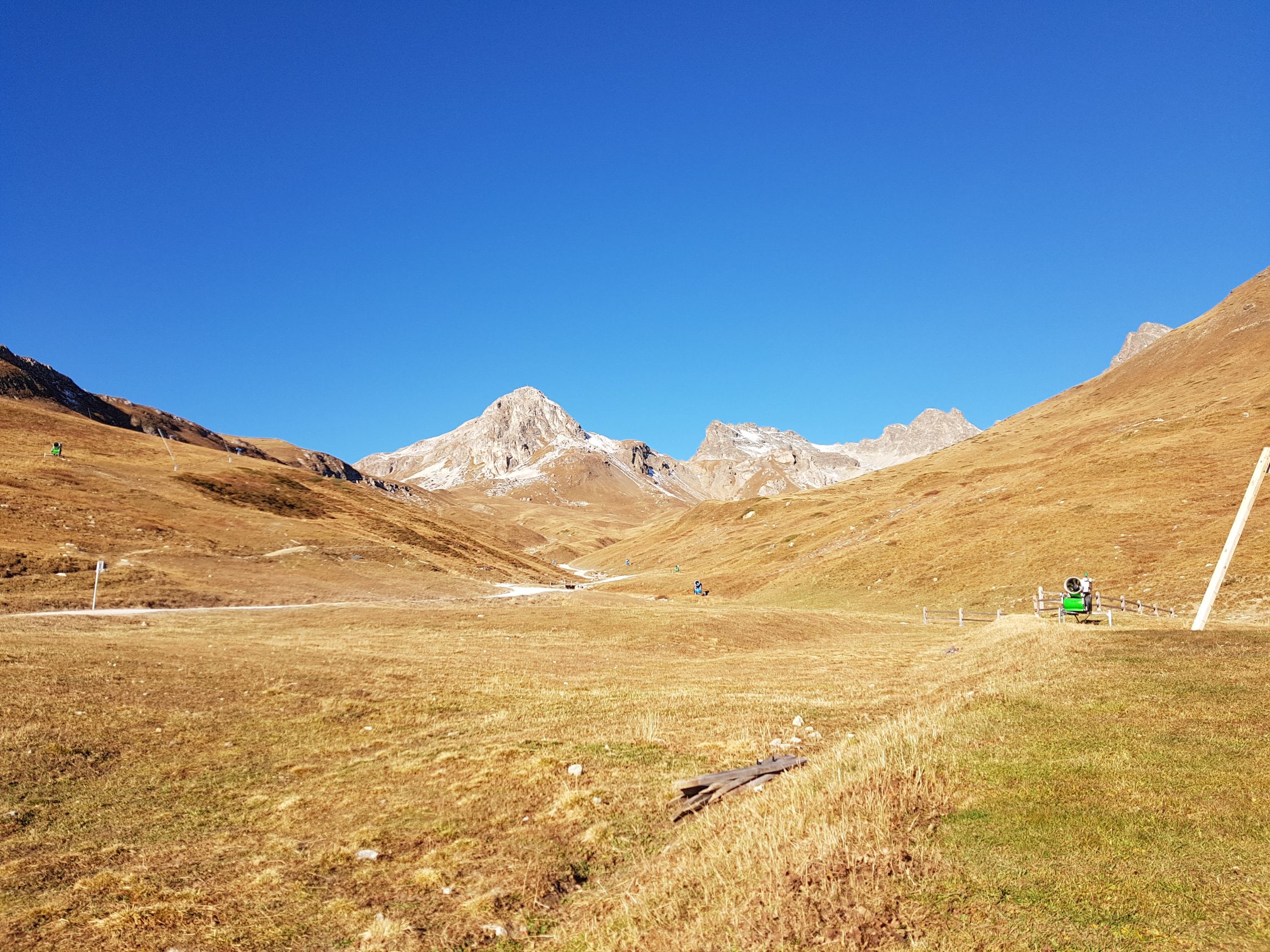 Oben bei Marguns und Corviglia wird eifrig für die Wintersaison vorbereitet. Ich fahre weiter über Munt da San Murezzan hinab zum Pass Suvretta, wo ich nach einer Stunde Fahrt das E-Bike deponiere.