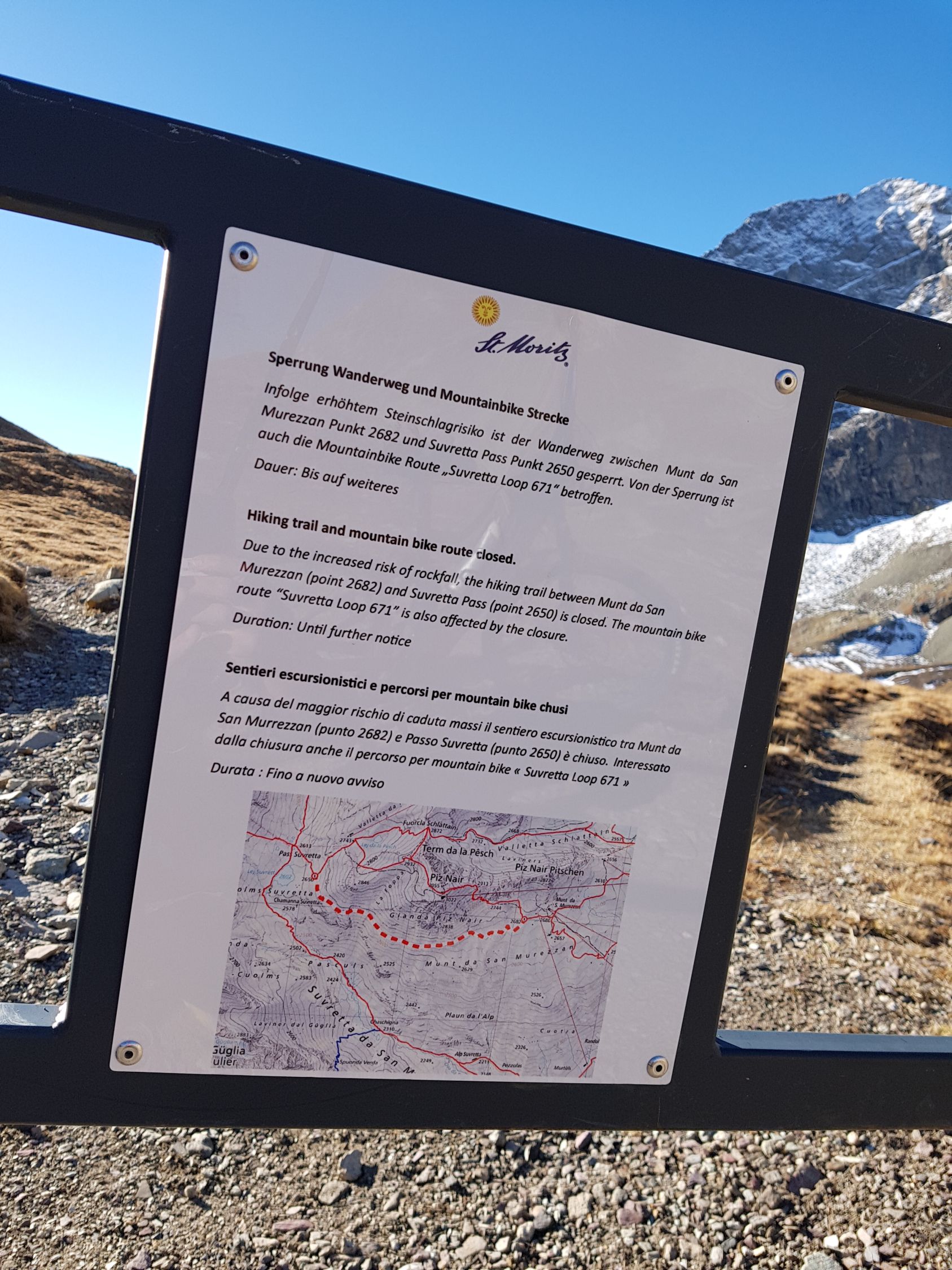 Ich bin erstaunt hier eine Absperrung vorzufinden. Auf dem Zettel steht, dass der Wanderweg inkl. Mountainbike von Munt da San Murezzan P2682 bis Suvretta Pass P2650 infolge erhöhten Steinschlags gesperrt ist. Auf die Idee eine solche Absperrung oben beim Munt da San Murezzan aufzustellen ist wohl niemand eingefallen. Anderseits hätte ich die Absperrung sowieso gewollt übersehen. Doch fürs gute Gewissen war das gut so.