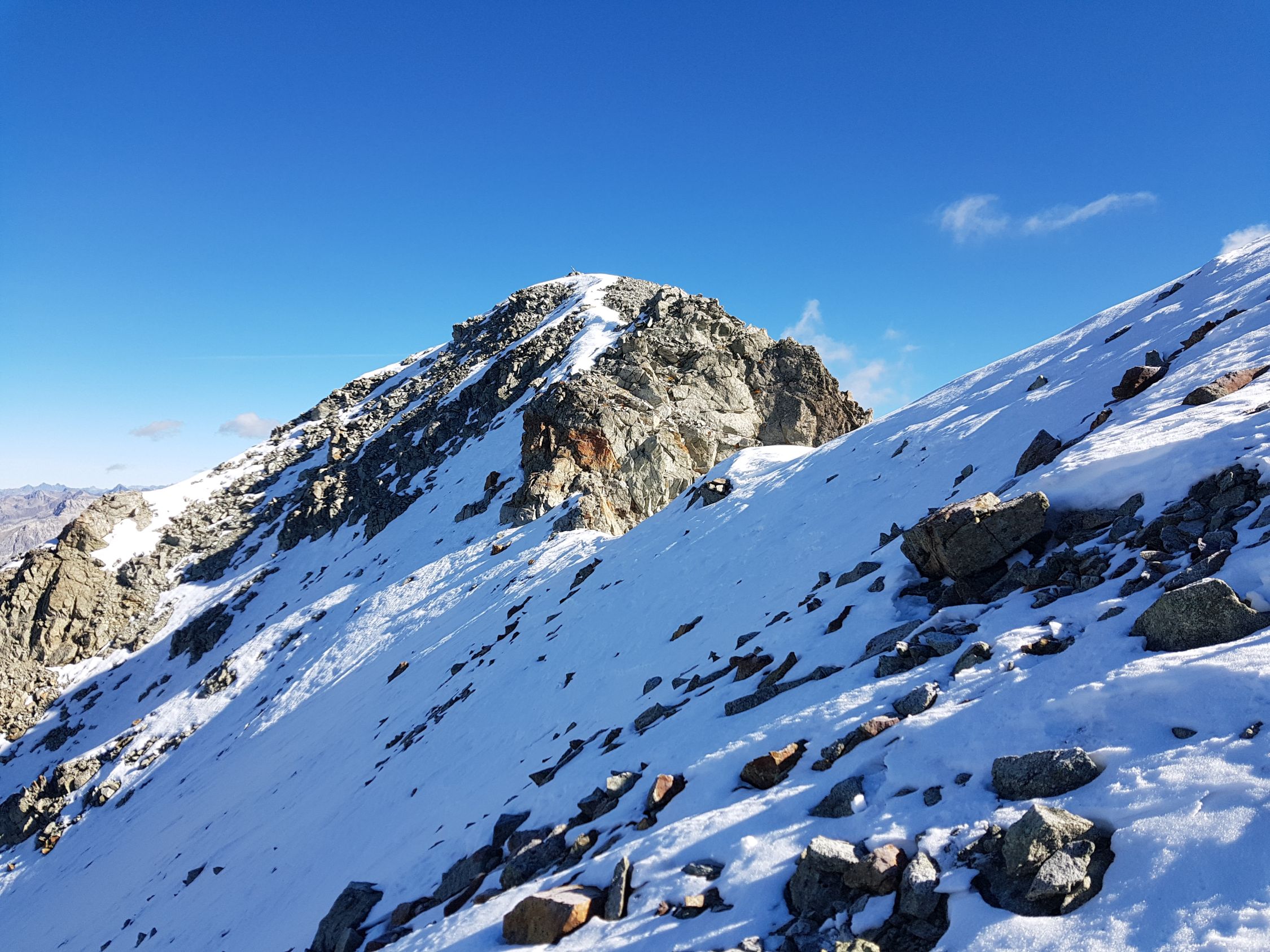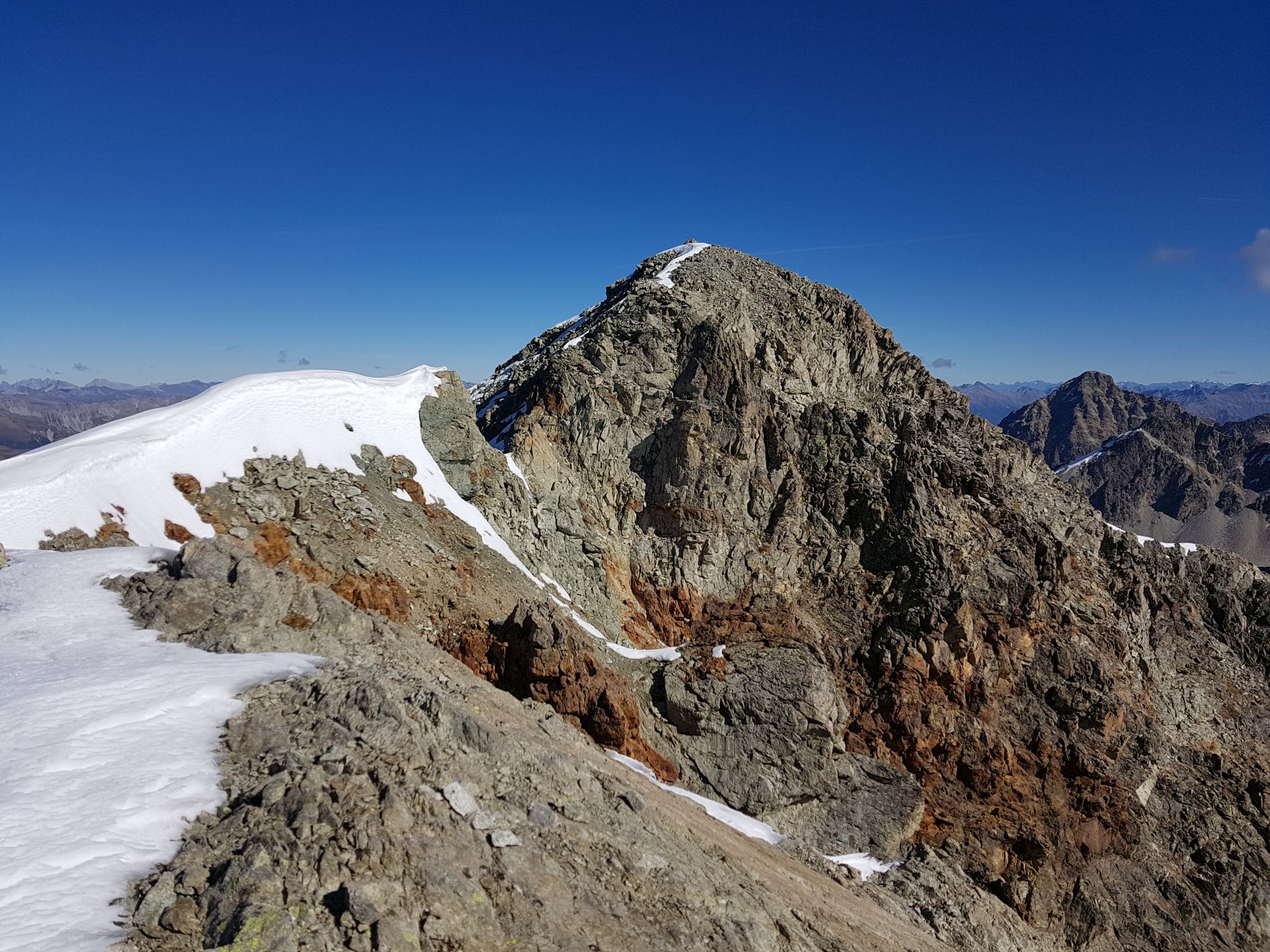 Auf dem Grat spaziere ich zum Verbindungsgrat, der noch immer eingeschneit ist. Zuoberst auf dem Grat sinkt man stark ein und nördlich hat es unbefestigter Bruchharsch. Ich darf deswegen nicht in die steile Nordflanke ausweichen. Auch wenn es nur noch 20 Meter zum Gipfel sind, zwingen mich die Verhältnisse hier Bergschuhe anzuziehen. Direkt auf dem Grat spure ich knietief einsinkend hinüber auf die andere Seite. Auch der letzte Aufschwung kann man hier ohne Schnee leicht nördlich umgehen, heute aber nicht. Somit klettere ich diesen Aufschwung genau auf dem Grat hoch (T5-, II) zum Piz Bever mit Steinmann und Gipfelbuch.