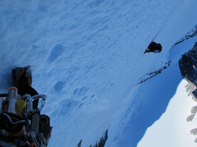 Unteren Teil leicht, guter Trittschnee, dann etwa 400m doch ziemlich blank unt splittrig (dinnerplates), komischerweise war der Ausstieg supereinfach, obwohl 60°