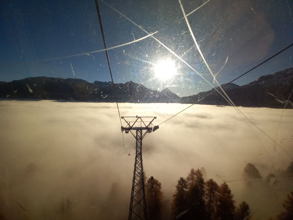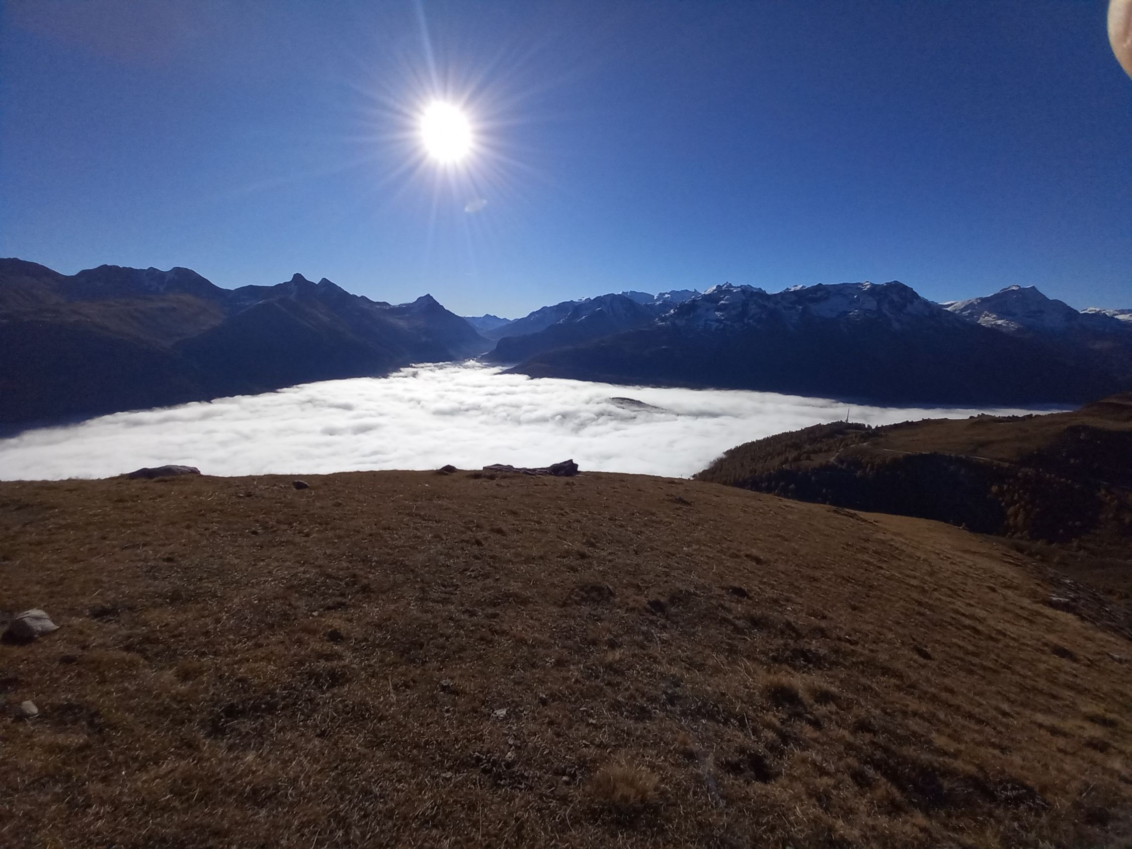 Dem zähen Bodennebel im Oberengadin entflohen, um 9:30 in Marguns gestartet bei eitlem Sonnenschein. Hurtig hoch auf gutem Weg zu Pkt. 2489 und mit guter Aussicht weiter nach Sass Alv. Der Zustieg über den Gipfelrücken ist stellenweise noch schneebedeckt, meist griffiger Trittschnee aber auch zu Vereisung neigend, yours truly fand die mitgebrachten Schneeketten hilfreich und beruhigend, im Abstieg nicht zu unterschätzen!