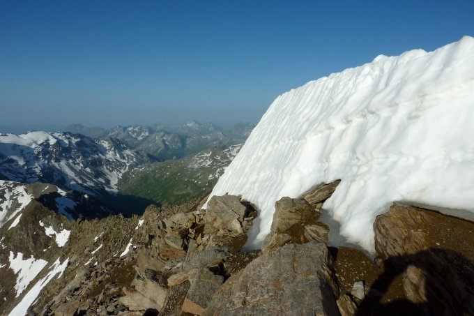 Start 5 Uhr beim Berghaus. 30 min Ski tragen durch herrliche Flora, vorbei an Wasserfällen. Typischer, kompakter Sommerschnee, bricht bei Aufstieg nicht durch. Lattenhornquerung mit 80 m Tragpassage, dann durchgehend Schnee bis Skidepot. Auf trockenem Fels ohne Schneekontakt einfach auf den Gipfel. Aussicht wegen hoher Luftfeuchtigkeit limitiert. Abfahrt für die Jahreszeit einfach genial. Die Schneeräumerin Sonne hat letzte Woche bei hohen Temperaturen ganze Arbeit geleistet. Wegen zunehmenden Tragpassagen dürfte die Tour mit Ski ab nächster Woche kaum mehr lohnend sein.