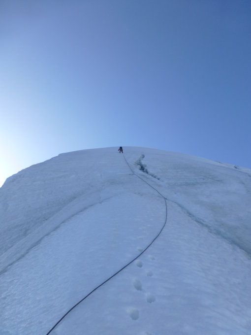 Eine schöne, vielfältige und eher selten begangene Route. Der Einstieg zur Kletterei ist einfach zu finden und nach einem eher brüchigen Start geht es in schönem Fels bis zur Eisnase. Die Stände sind mit solide Bohrhaken ausgerüstet, zudem stecken ein paar Zwischensicherungen die mit Schlingen und Keilen ergänzt werden können. In der Eisnase haben wir 2 Schrauben gesetzt um die Passage mit hartem, splittrigen Eis zu entschärfen. Anschliessend hiess es kräfteraubendes Spuren im Bruchharsch bis auf den Gipfelgrat und eine kurze Kraxelei auf der Südseit um auf den Gipfel zu gelangen. Während bis hierher noch vereinzelte Steigeisenkratzer den Weg wiesen wird es auf dem Verbindungsgrat zum Bernina einsamer und wilder. Scharfe Firnschneiden und Felsinseln wechseln sich ab. Die Kletterei folgt durchgehend der Gratschneide, ist nie besonders schwierig, fordert jedoch immer volle Konzentration. Wir haben am grossen Turm 3x25m und am letzten Turm nochmals 2x25m nach Süden abgeseilt. Die Abseilstellen waren ok (nach Verstärkung mit 1 Keil + 2 Schlingen), sollten jedoch vor Benutzung kritisch beurteilt werden. Nach mehreren Stunden auf dem Grat stand nur noch der Schlussaufstig zur Spedla (+ Abstieg) zwischen uns und dem Bier auf der Marco e Rosa. Hier haben wir den richtigen Weg wohl nicht gefunden: Am Ende der Firnschneide gerade hoch und dann leicht links haltend in eine seichte (und brüchige) Rinne. Über loses Gerümpel bis an den abschliessenden Überhang, hier nach rechts querend bis durch eine Schwachstelle auf den Grat aufgestigen werden kann. Nicht besonders schön, aber einfacher als über den sehr steilen und abweisenden Rücken. Endlich auf der Spedla ging es dann dem Normalweg folgend zum hervorragend bewirteten Refugio Marco e Rosa.