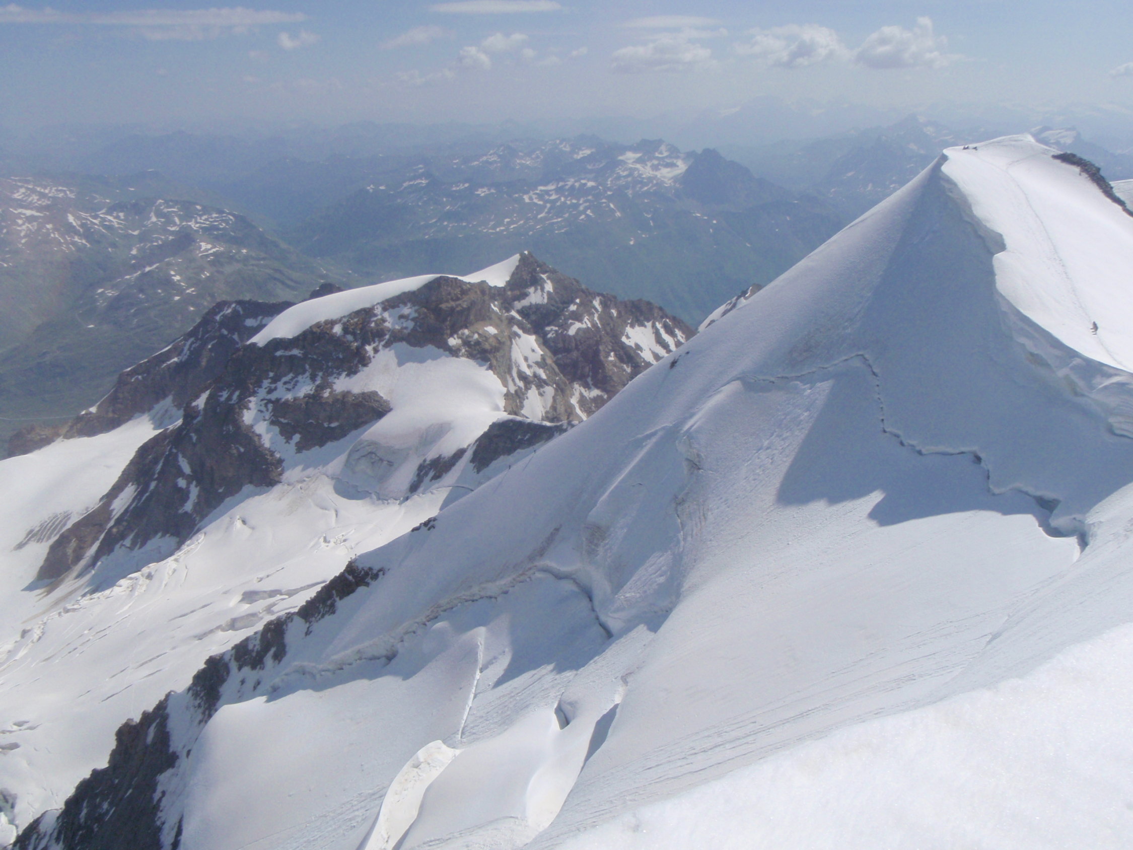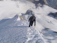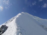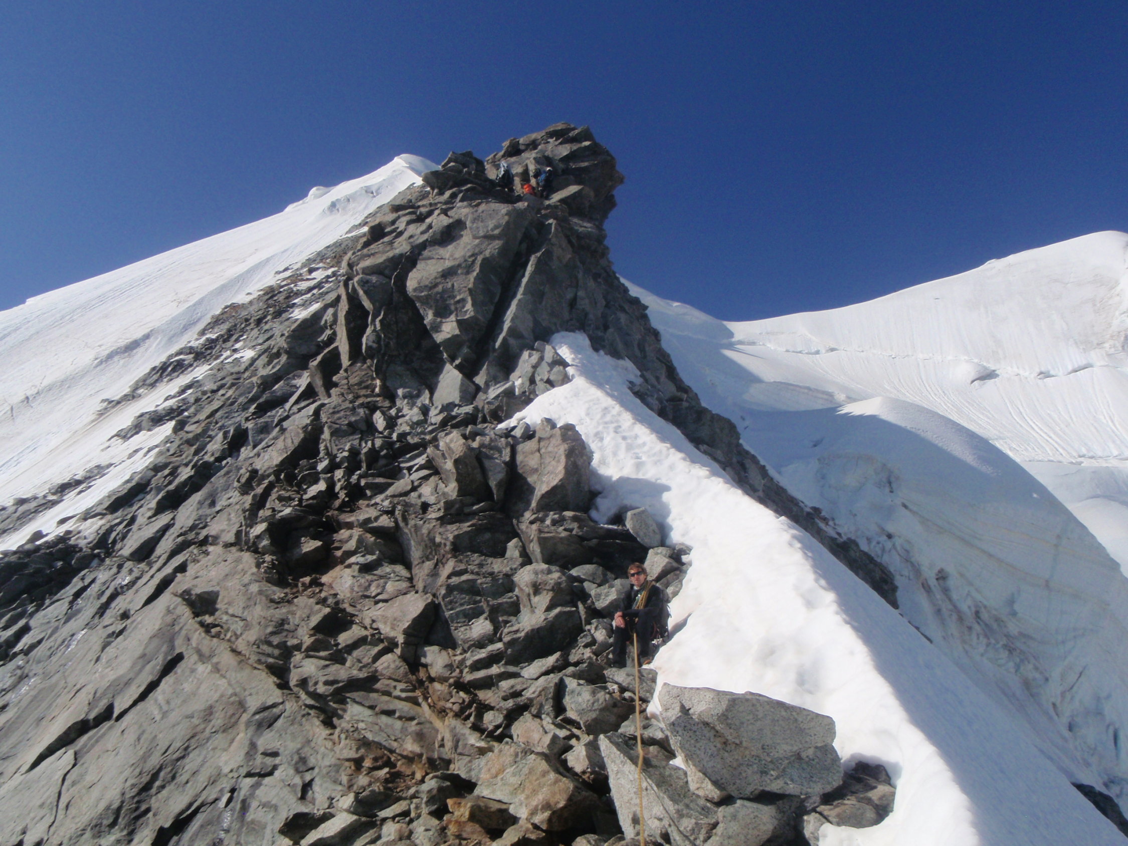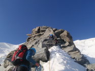 Perfekte Verhältnisse. Der Fels-Teil ist komplett schneefrei und der Firngrat hat noch eine dicke Firndecke mit ausgezeichneten Trittstufen. Der einzige Nachteil bei diesen Verhältnissen ist, dass man nicht alleine ist. Bestimmt 40 Bergsteiger waren an diesem Morgen am Pfeiler unterwegs. Für diese Anzahl und die überschaubaren Überhol-Möglichkeiten gings eh recht gut. Aber da kommts natürlich immer drauf an, auf wen man so trifft.
