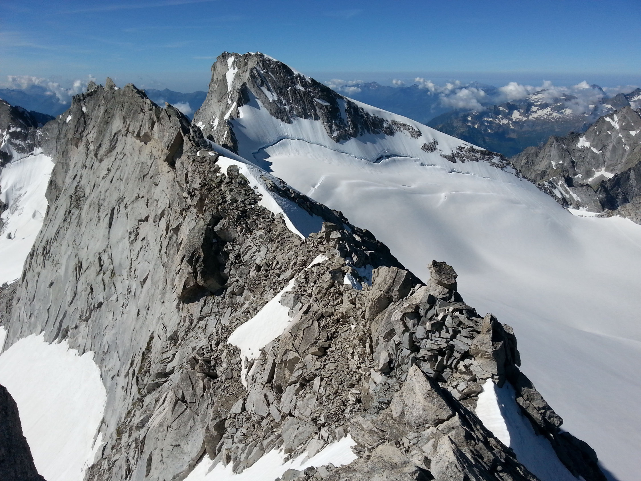 Schnee in Firnflanke des Cantun morsch, schon am frühen Morgen. Auf Gipfelgrat weicher Schnee, Blockgrat gut kletterbar, da nur noch einzelne Schneefelder. Abstieg über Gletscher im nachmittäglichen "Sumpf".