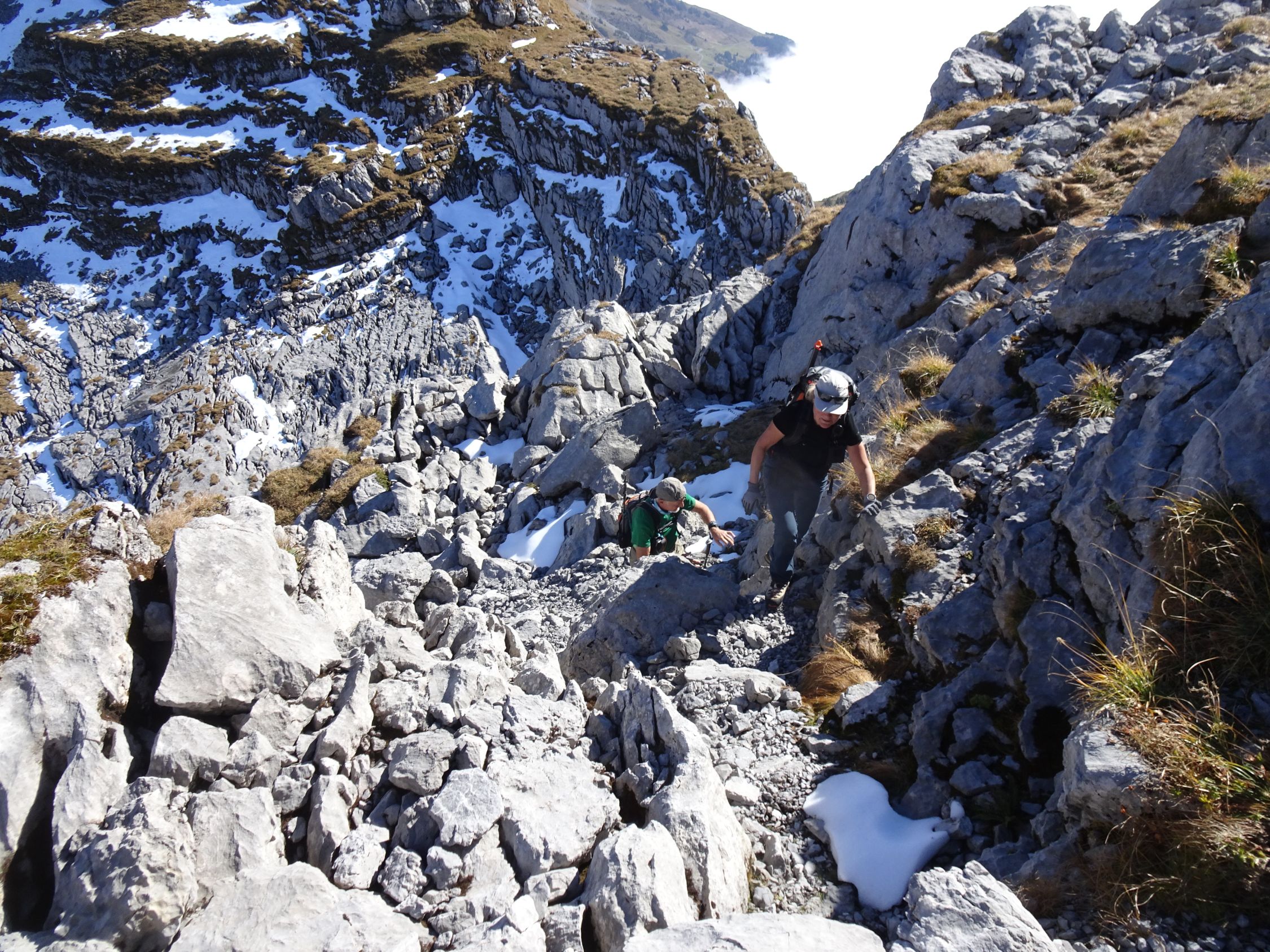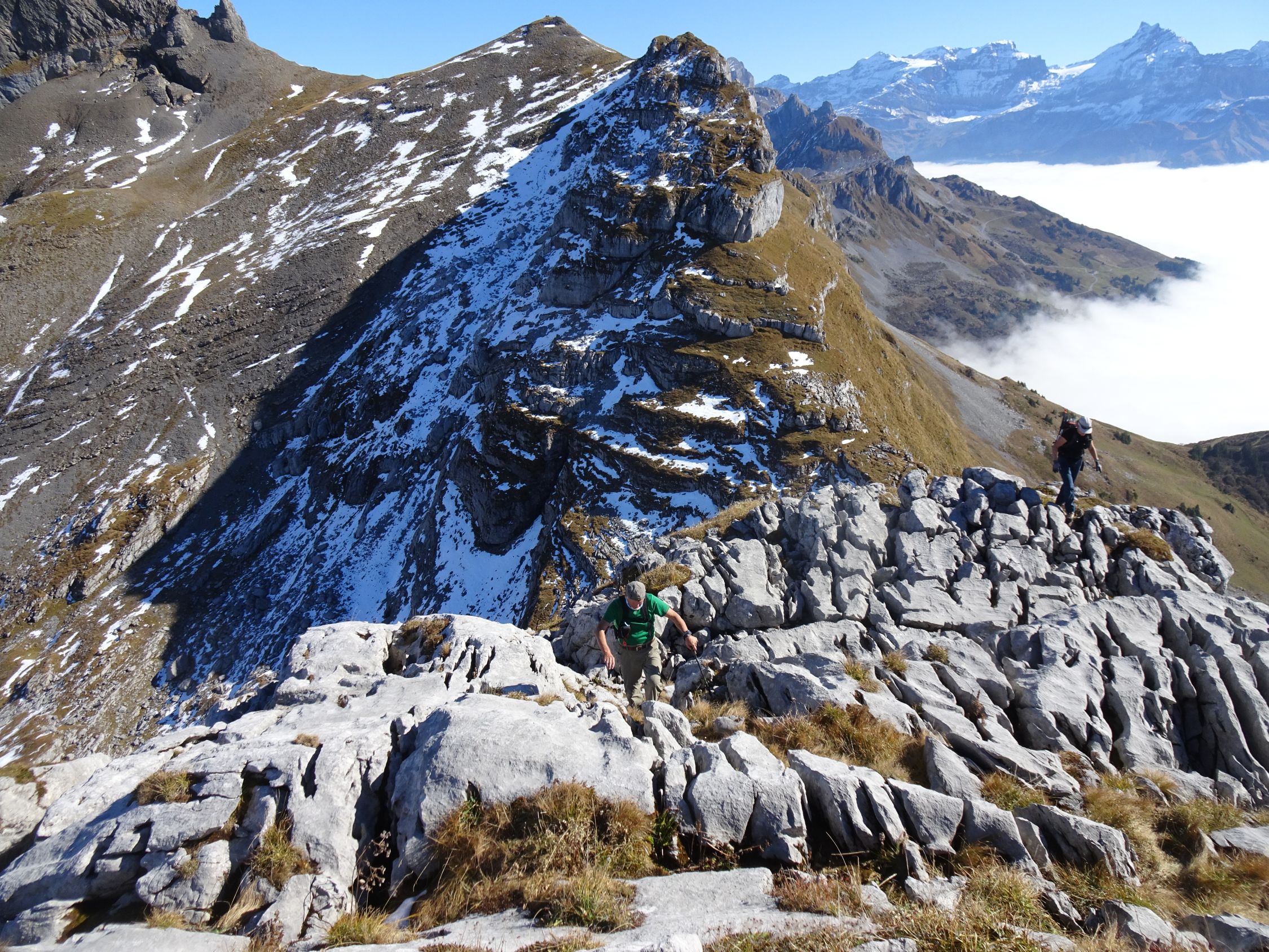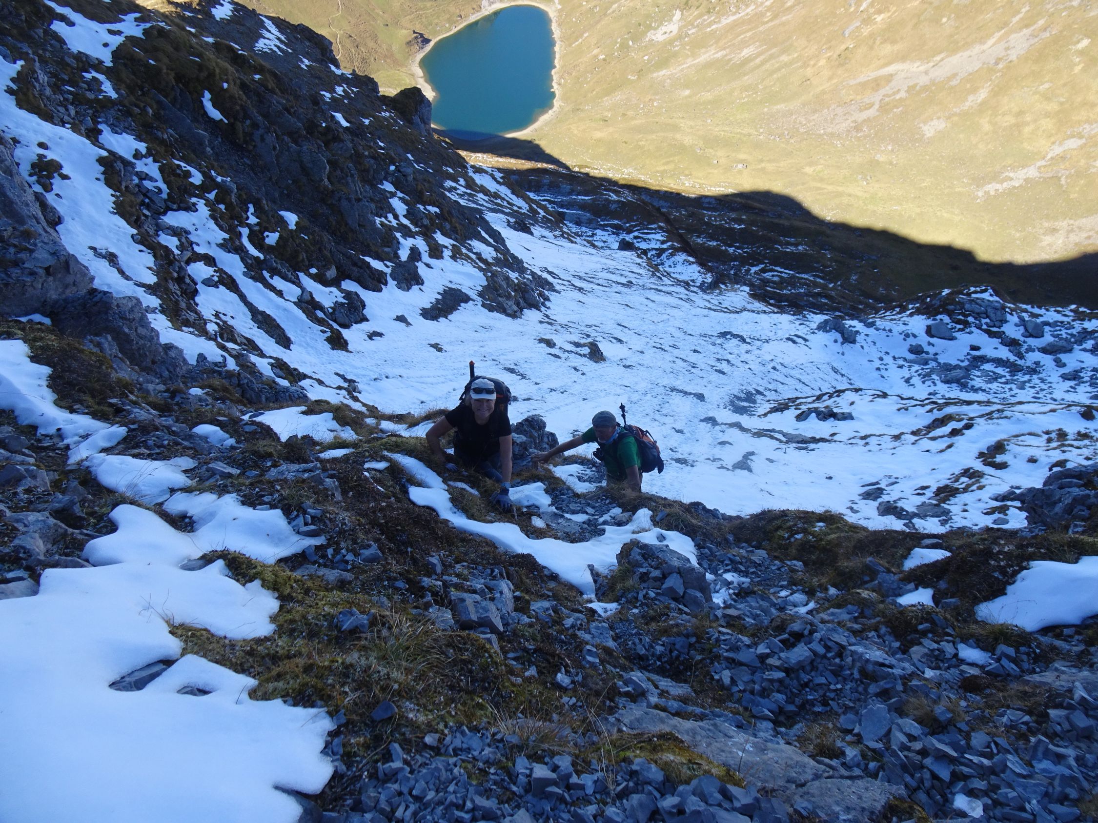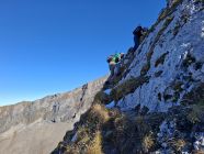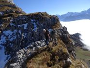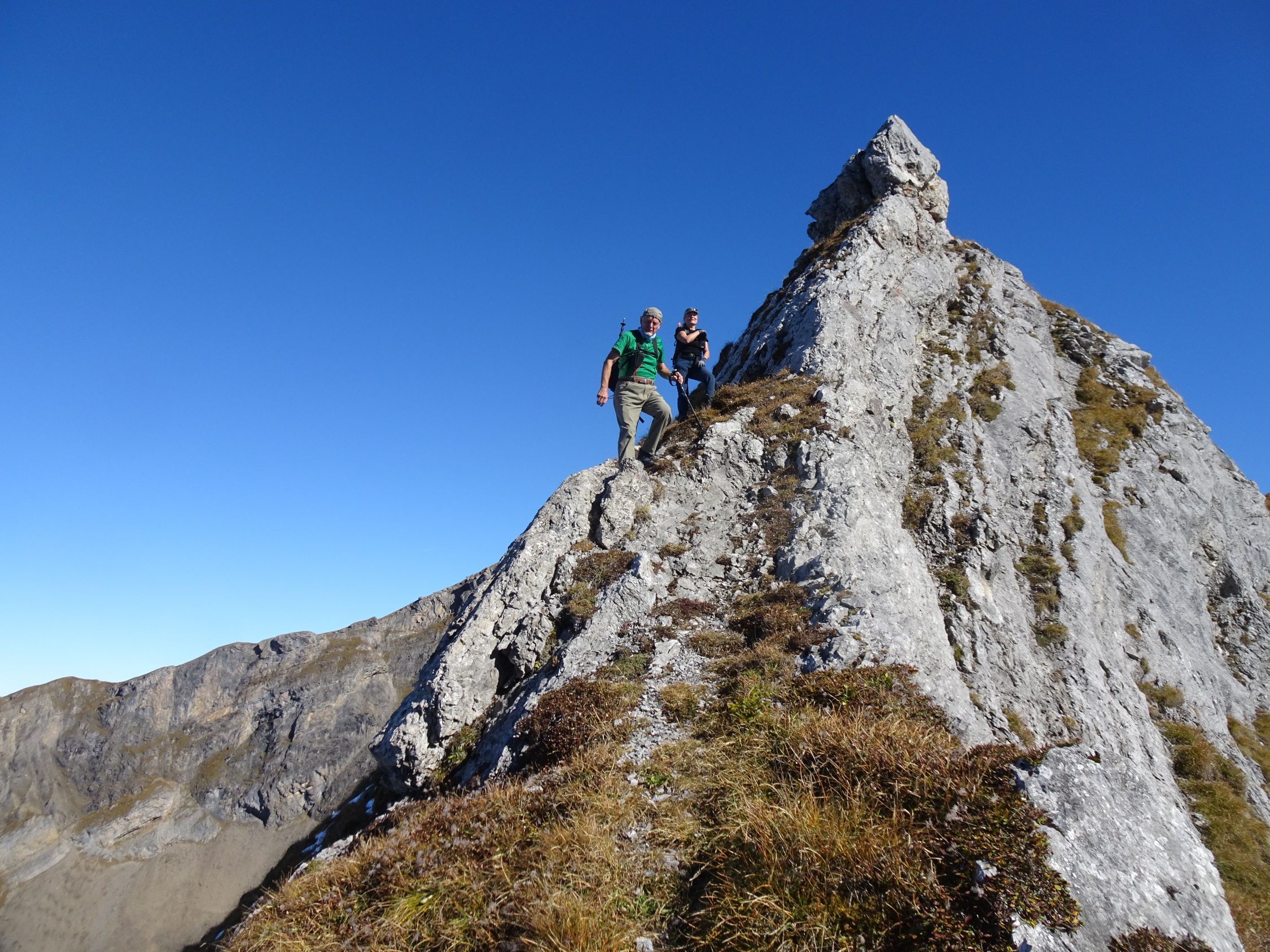 eine herrliche Route, die sicheres Gehen auf Graten und in steilem Gelände und Klettererfahrung bis zum 2ten erfordert.