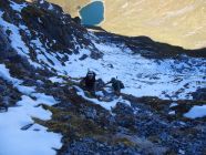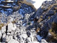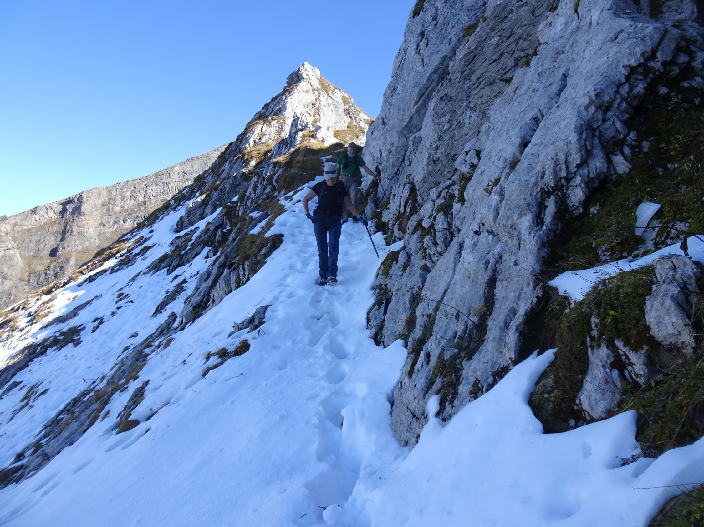 die Wege und die Felsen waren trocken. In der Nordflanke des Grates und des Spilauer Stocks, lag teilweise harter Schnee. Ein Pickel erfüllte einen guten Zweck. Die Route, über den Grat, ist nicht markiert und Spuren sind nicht vorhanden.