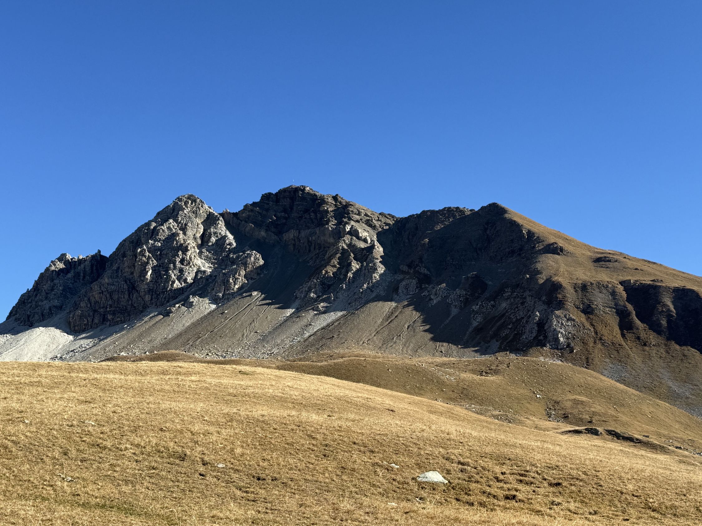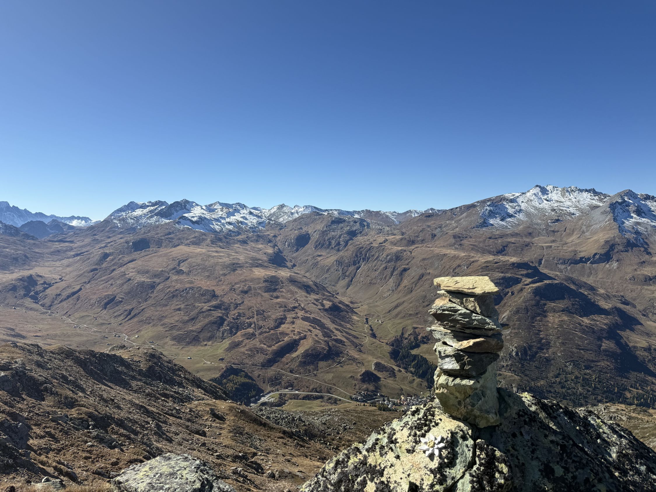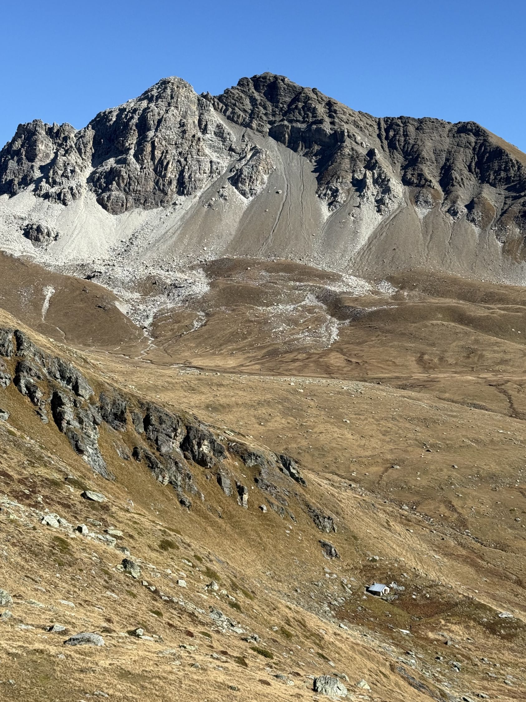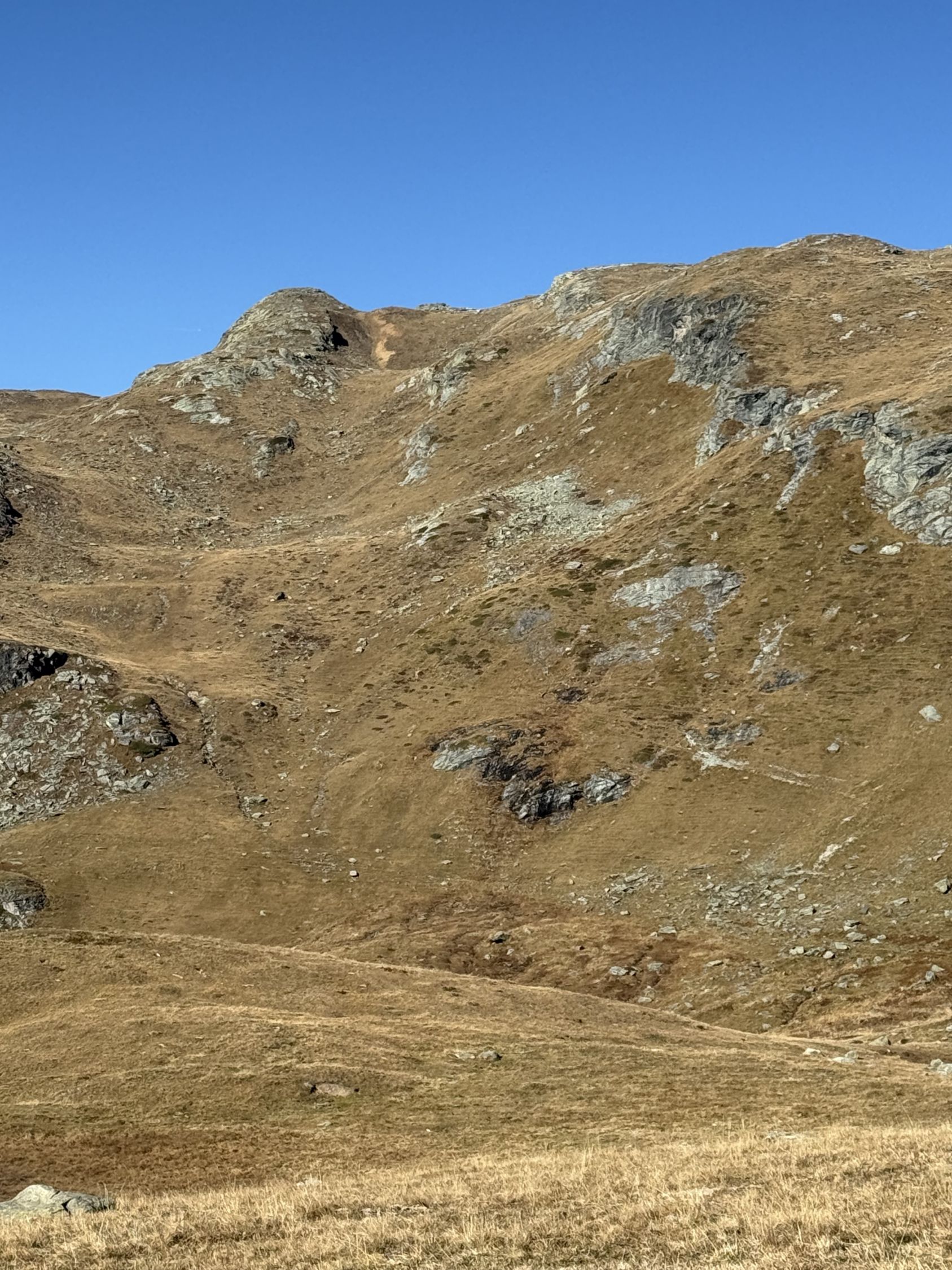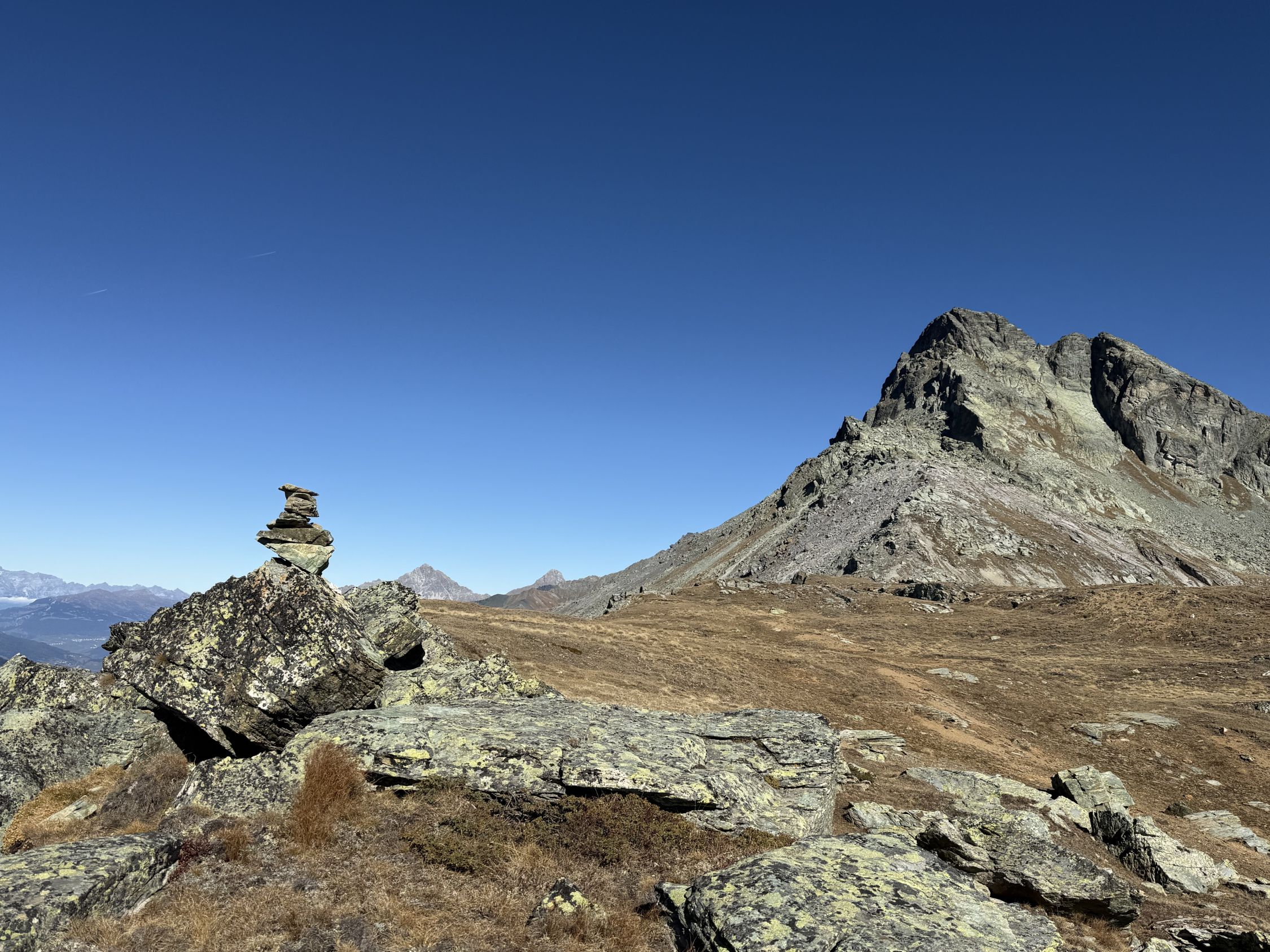 Einsame Herbsttour auf den Aussichtsgipfel oberhalb Bivio unterhalb Piz Neir 2909, T4-. Start Alpgebäude Sur Gonda, 9 Uhr, 1 Grad, windstill, Prachtswetter. Die an zwei Stellen etwas ausgesetzte Traverse bis Höhe 2275 m, dann weglos hoch zur grossen Ebene Vairana, über den Bach und weiter zum kleinen Alphüttchen. Dann weglos die Ostflanke hoch bis zum Gipfel. Abstieg wie Aufstieg.