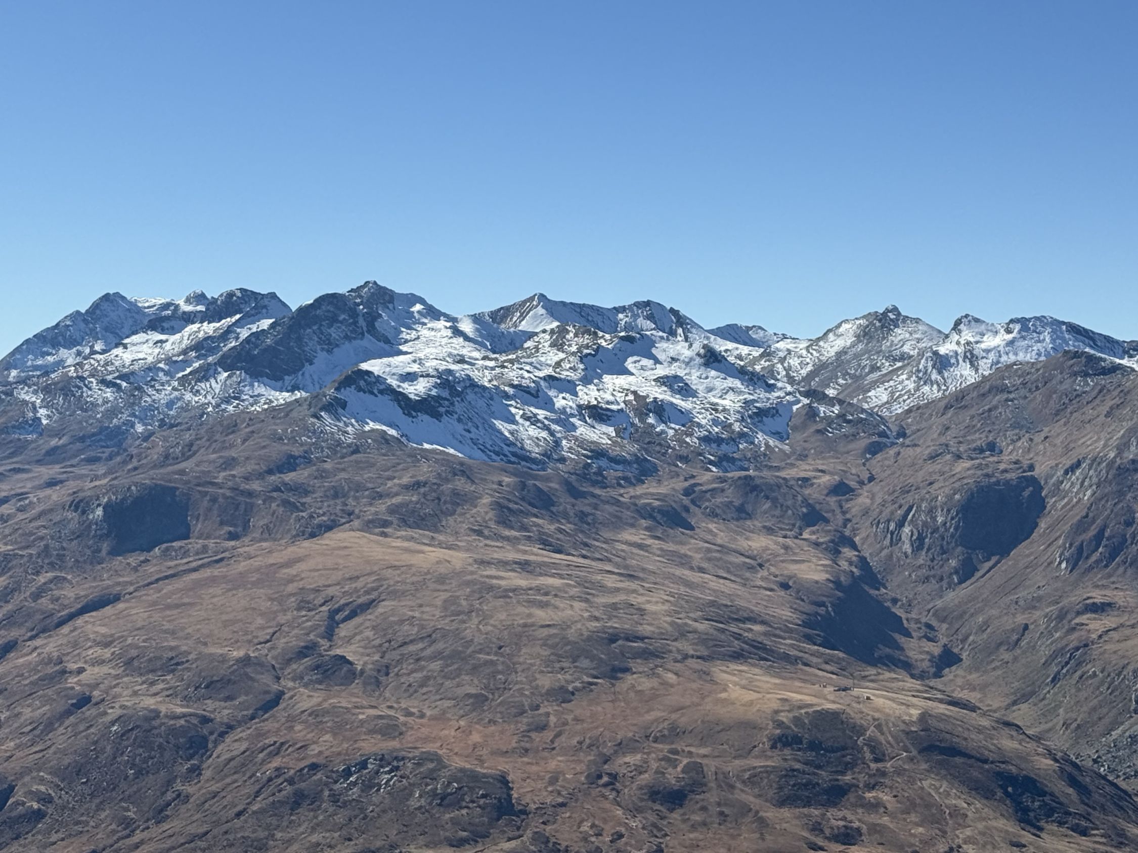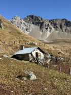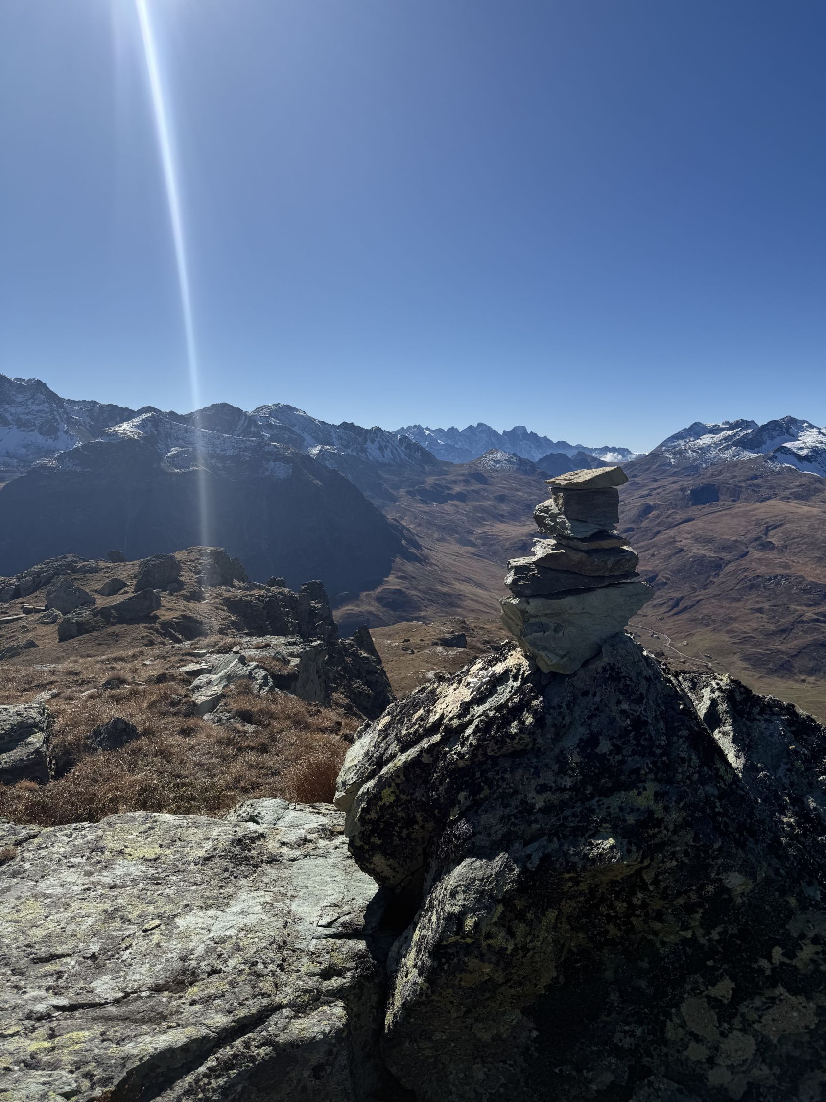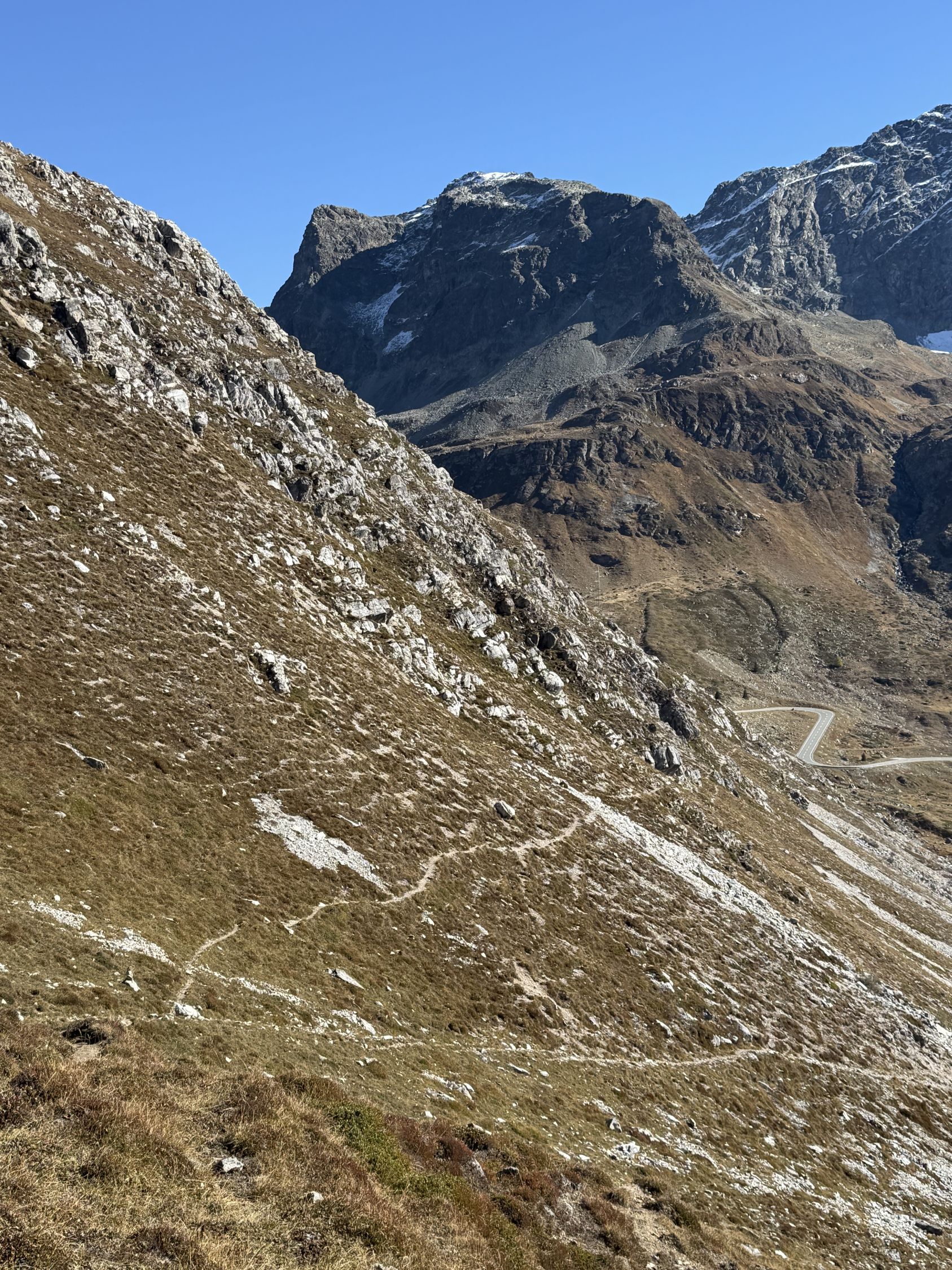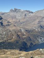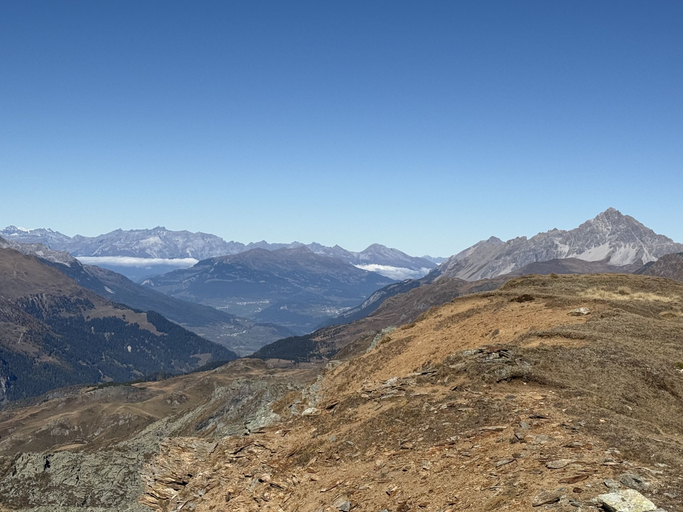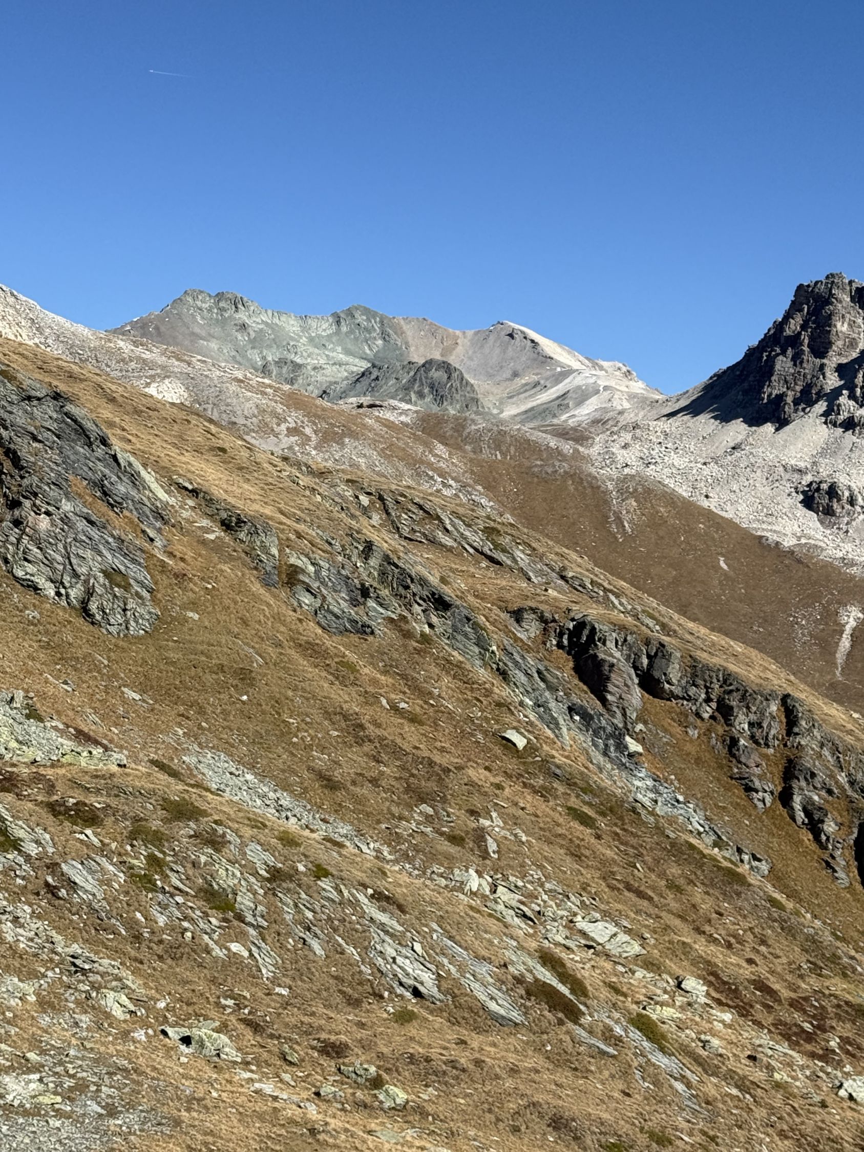 Einsame Herbsttour auf den Aussichtsgipfel oberhalb Bivio unterhalb Piz Neir 2909, T4-. Start Alpgebäude Sur Gonda, 9 Uhr, 1 Grad, windstill, Prachtswetter. Die an zwei Stellen etwas ausgesetzte Traverse bis Höhe 2275 m, dann weglos hoch zur grossen Ebene Vairana, über den Bach und weiter zum kleinen Alphüttchen. Dann weglos die Ostflanke hoch bis zum Gipfel. Abstieg wie Aufstieg.
