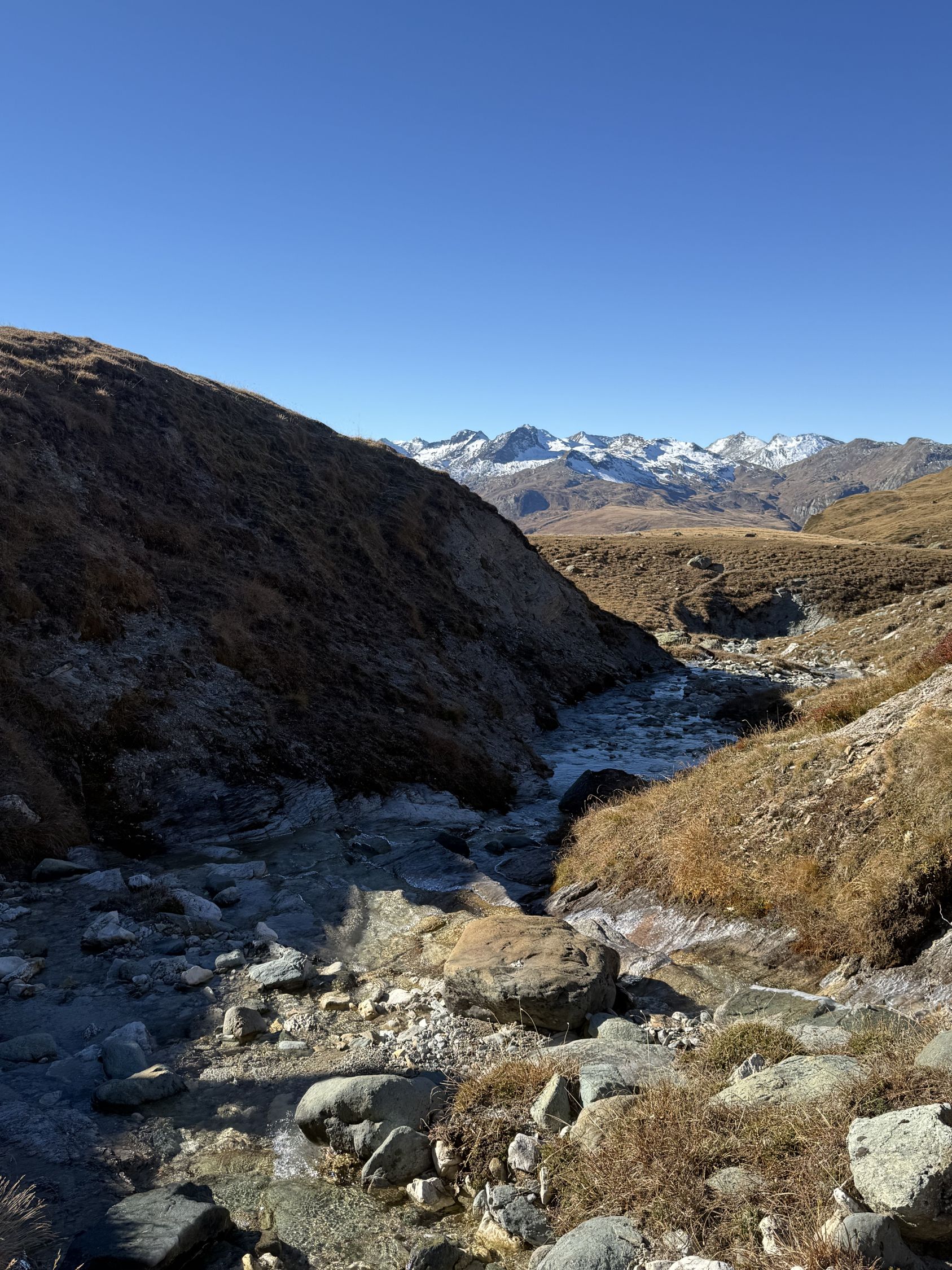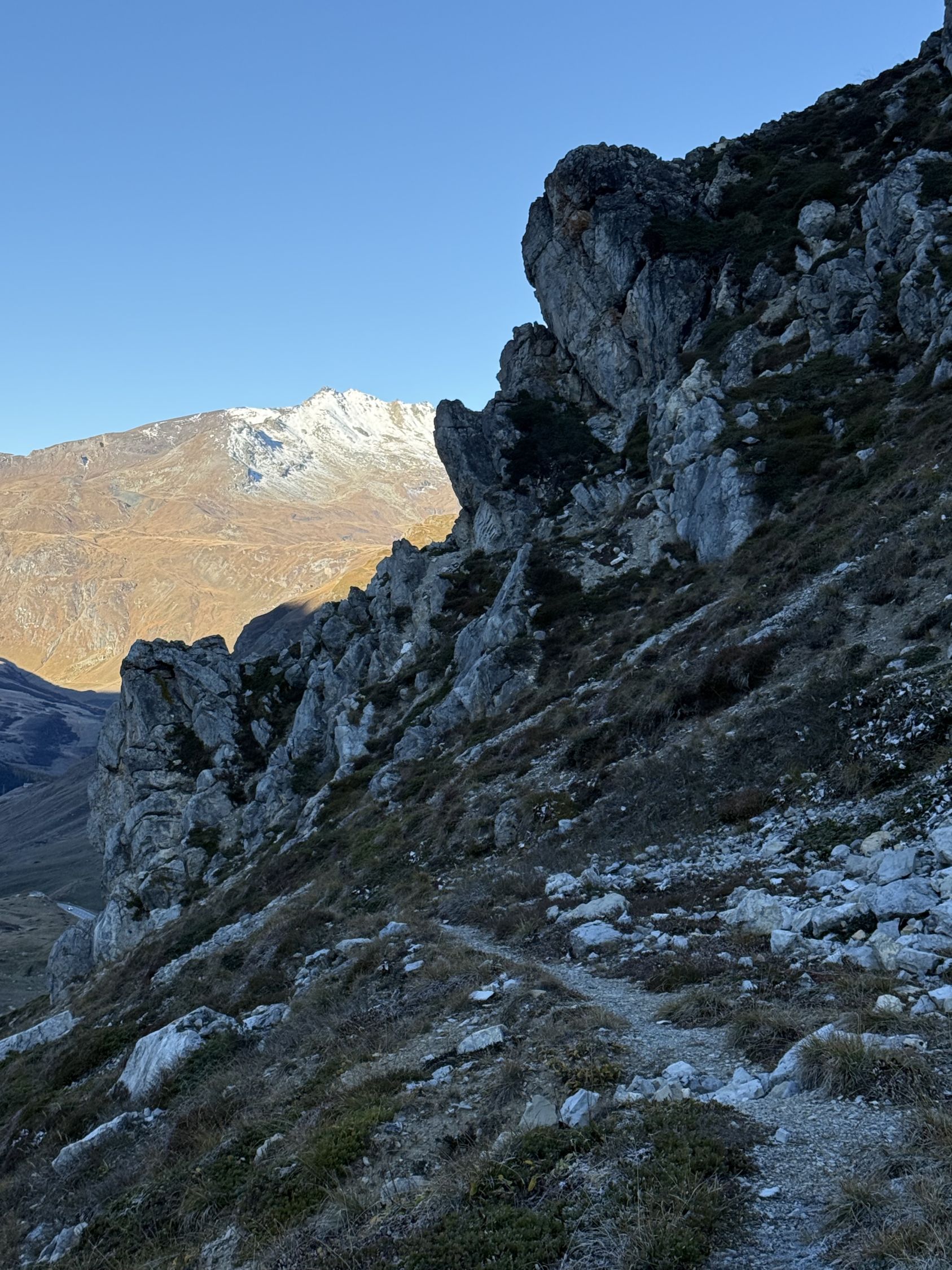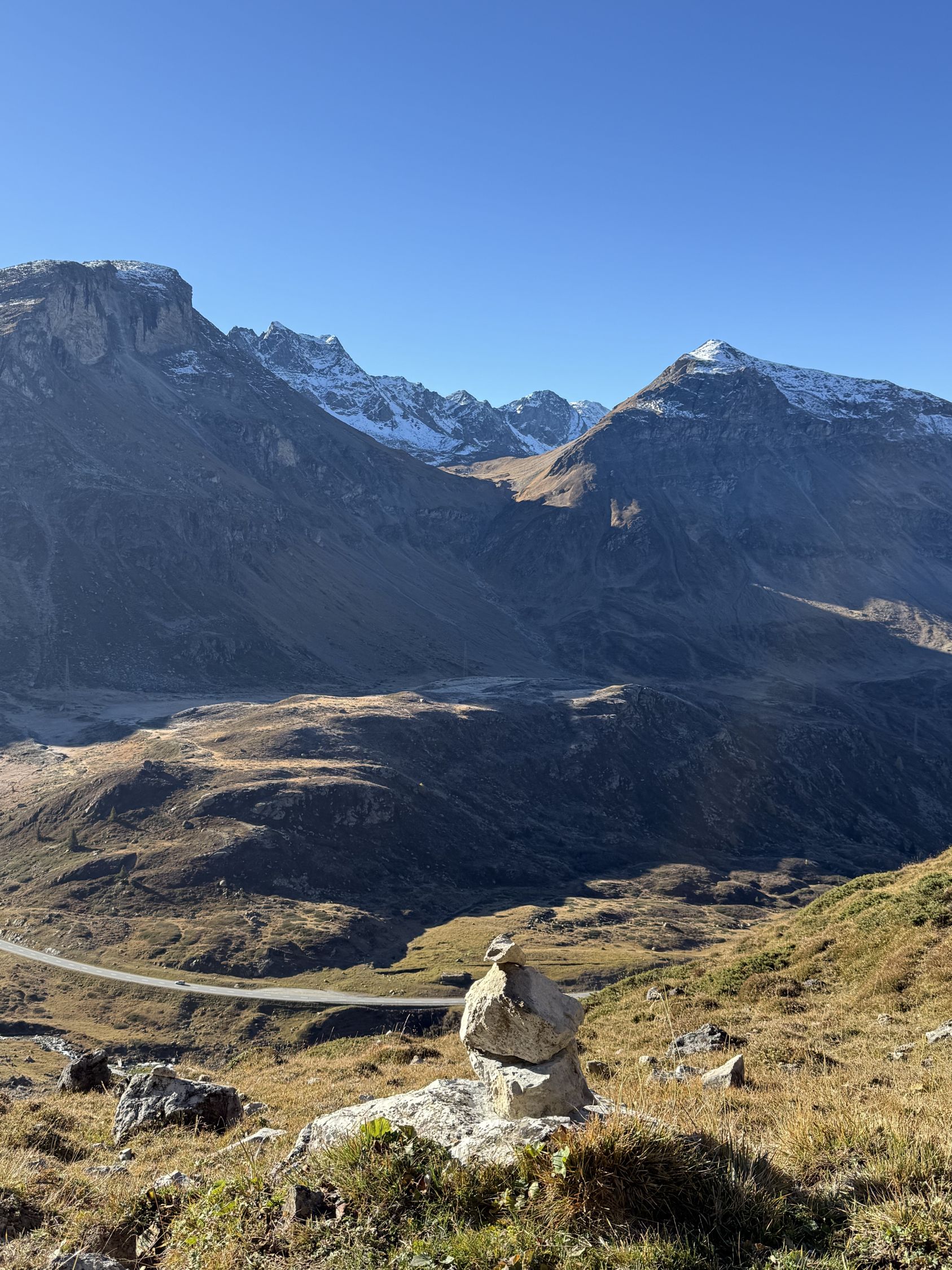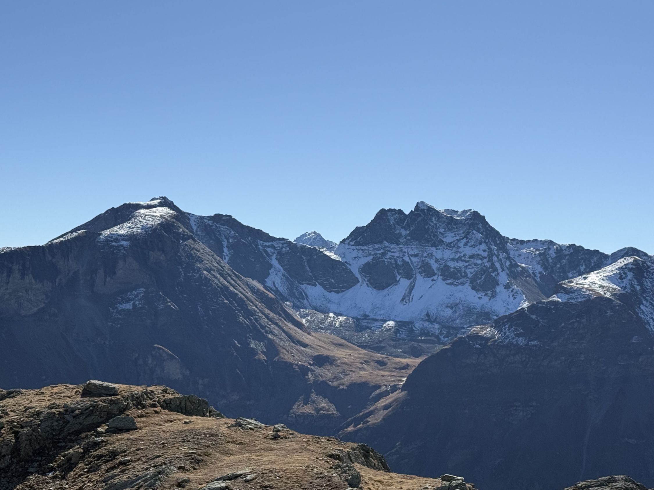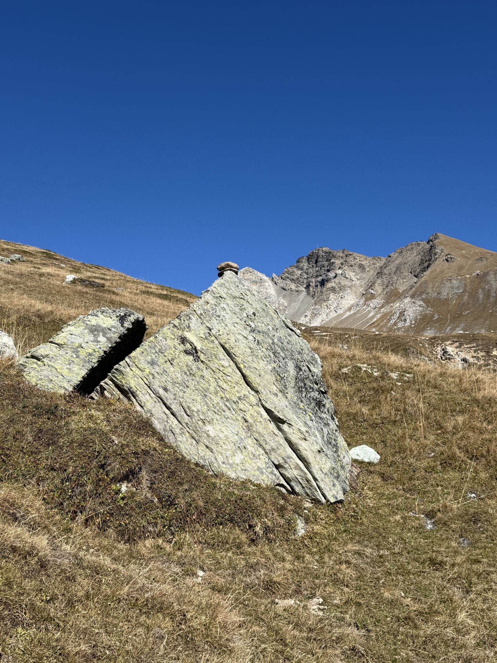 Einsame Herbsttour auf den Aussichtsgipfel oberhalb Bivio unterhalb Piz Neir 2909, T4-. Start Alpgebäude Sur Gonda, 9 Uhr, 1 Grad, windstill, Prachtswetter. Die an zwei Stellen etwas ausgesetzte Traverse bis Höhe 2275 m, dann weglos hoch zur grossen Ebene Vairana, über den Bach und weiter zum kleinen Alphüttchen. Dann weglos die Ostflanke hoch bis zum Gipfel. Abstieg wie Aufstieg.