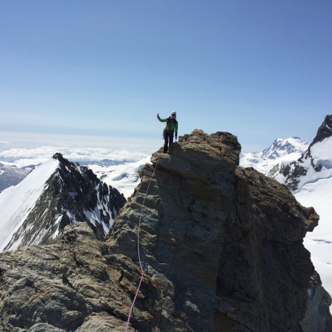 Vielen Dank an Axel für die super Tour. Erstmalig in dieser Combo unterwegs und gleich perfektes Zusammenspiel. Die Zeitangabe für den ENE grat zur Lenzspitze ist mit 4-5 h ok, die 2 h für den Verbindungsgrat zum Nadelgrat sind eher sportlich. Wir selbst sind zügig gegangen, durchgehend am laufenden Seil mit reichlich Zwischensicherungen, und benötigten ca. 2:30 h.