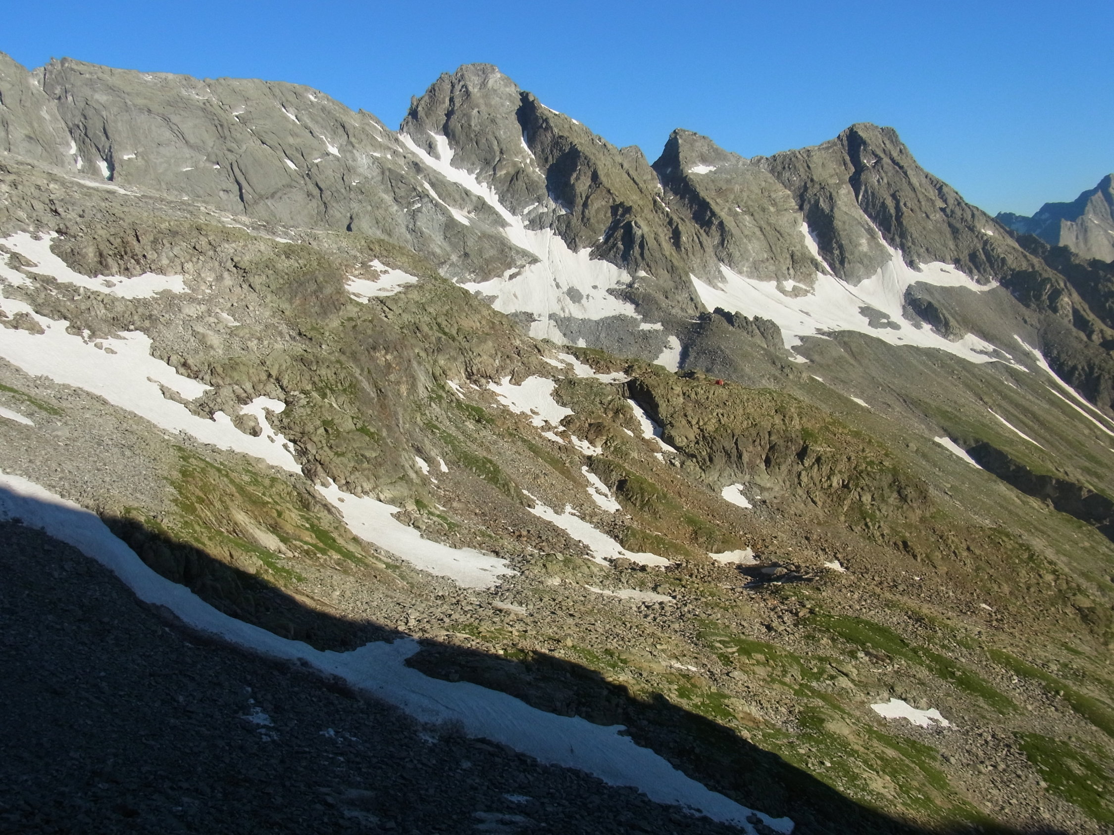 Zustieg von Parkplatz Laret: ca. 1,5 h bis zur Biwakstelle (ca. 150 Hm von der Hütte).