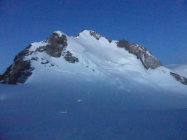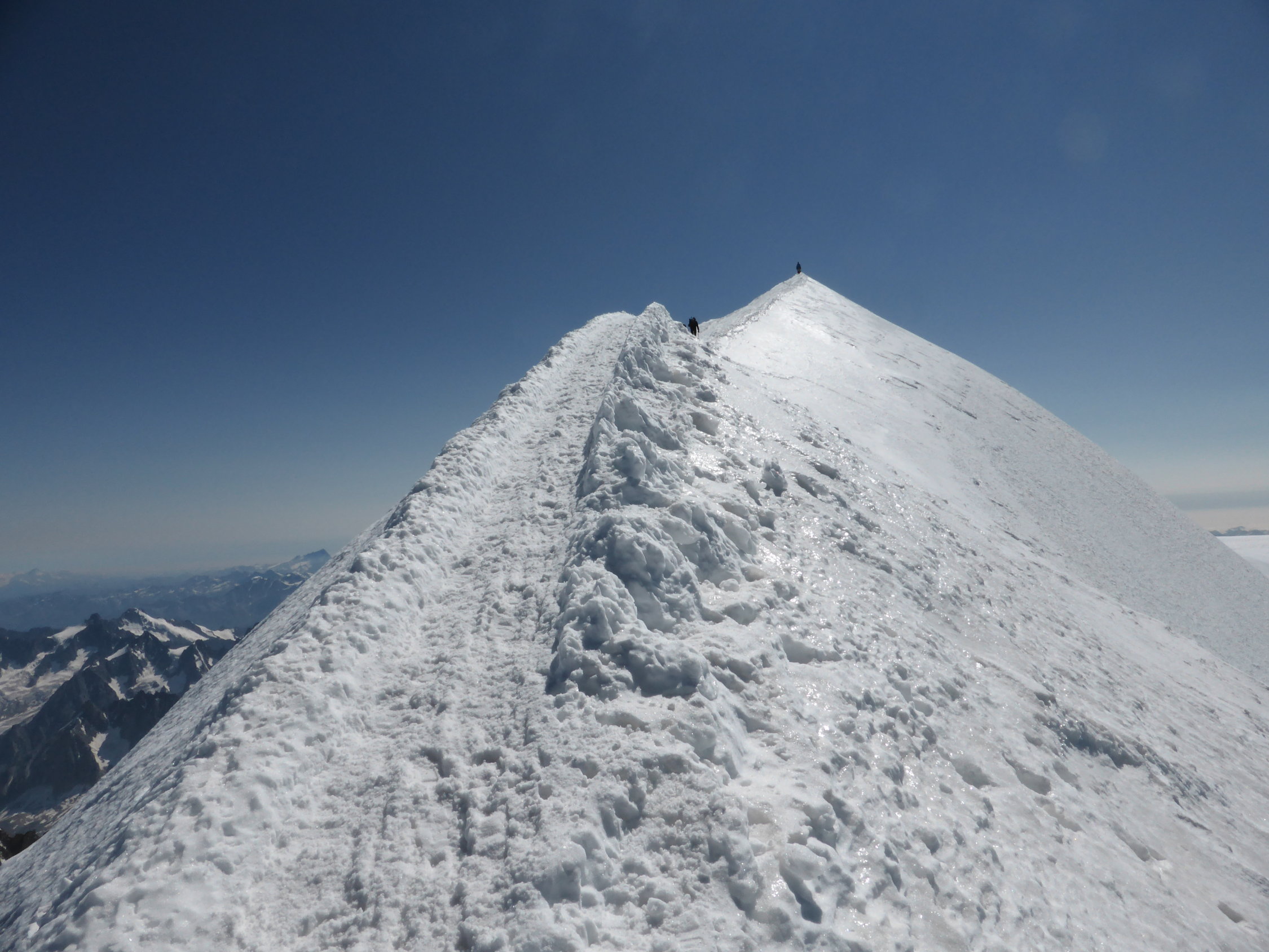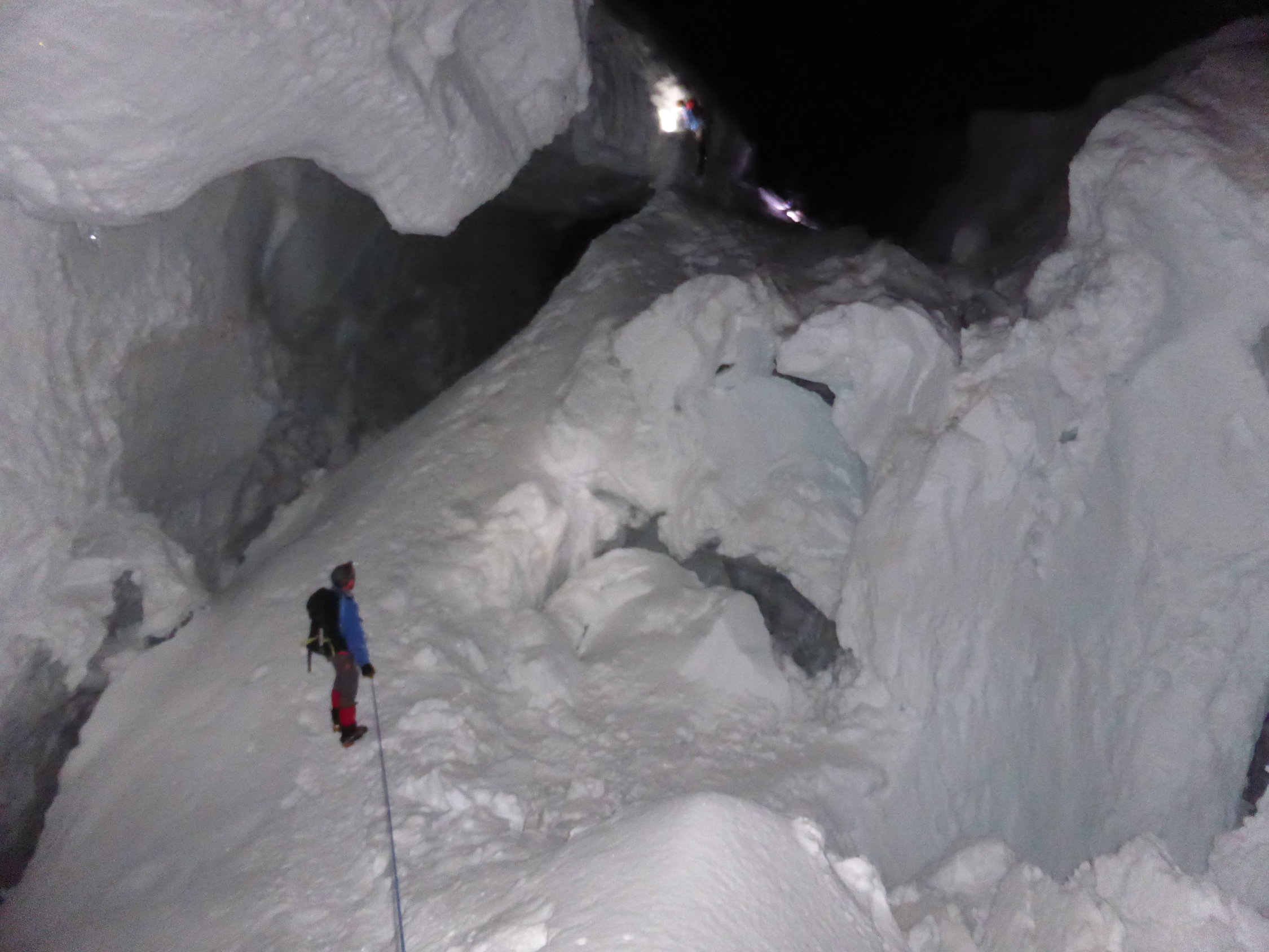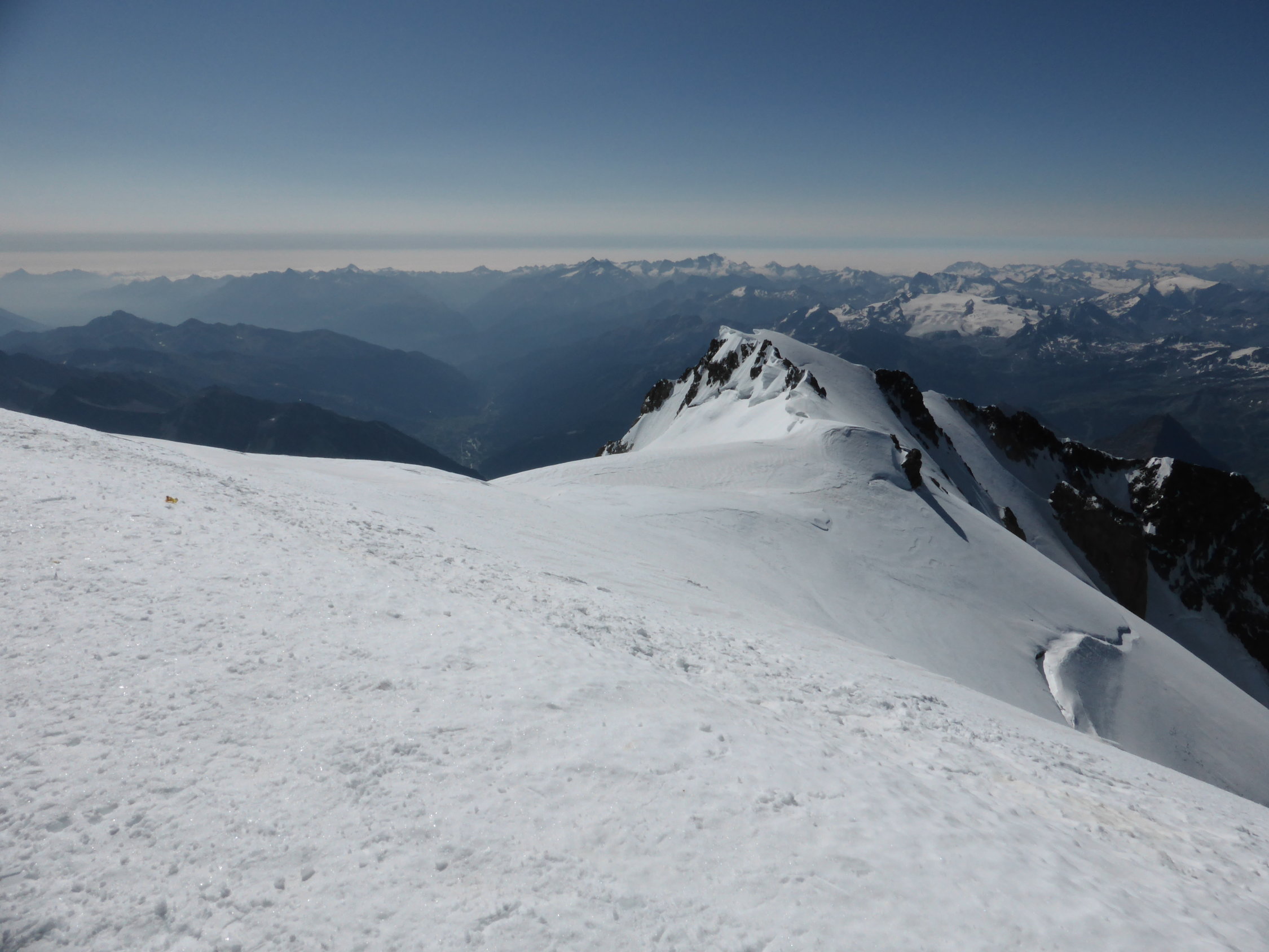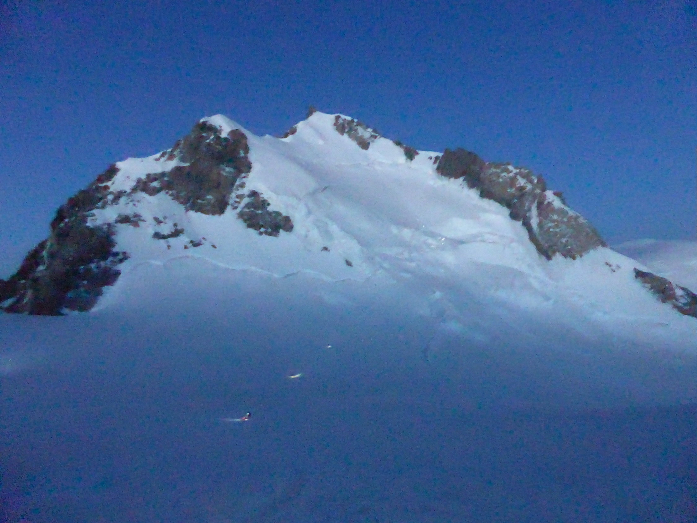 Die Dimesionen in diesem Gebiet sollten nicht unterschätzt werden. z.Bsp. wenn man vom Brenvapass aus "nur" noch eine Firnflanke vor sich hat, trennen immer noch 500Hm vom Gipfel! Oder die grösse der Schründe(siehe Foto).