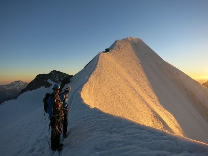 Oberer Teil dann zum Großteil toller Fels und einiges an fixem Material. Geniale Seillängen auf dem Grat nach dem Gratturm, die man aber nicht unterschätzen sollte, kostet noch Zeit und Kraft nach solch einer langen Tour. Eisnase wird wohl Geschichte sein, im Moment problemlos erst rechts dann links einer scharfen Eis- und Firnkante mit max 60° Neigung in 2 SL auf den flacheren Hängegletscher. Dort noch eine Spalte, die aber problemlos überklettert werden kann.