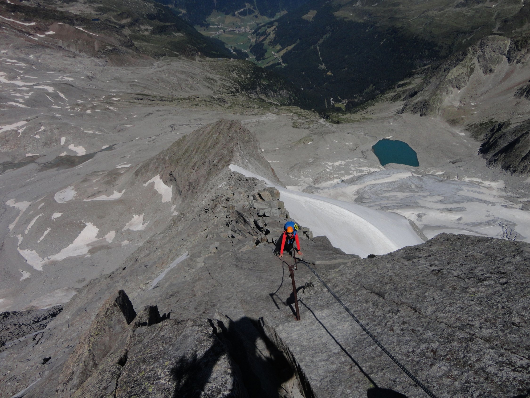 Kletterpassagen bis II, teilweise exponiert, in schönem Granit, jedoch nicht immer alles ganz fest. Die drei schwierigeren Stellen (Abstieg in die Scharte sowie plattiger Aufschwung unterhalb des Vorgipfels, frei etwa III+) sind durch Fixseile entschärft. Der anspruchvollste Teil der Tour ist die Überschreitung des Grauen Nöckls. Seil war dabei, konnte aber im Rucksack bleiben.
