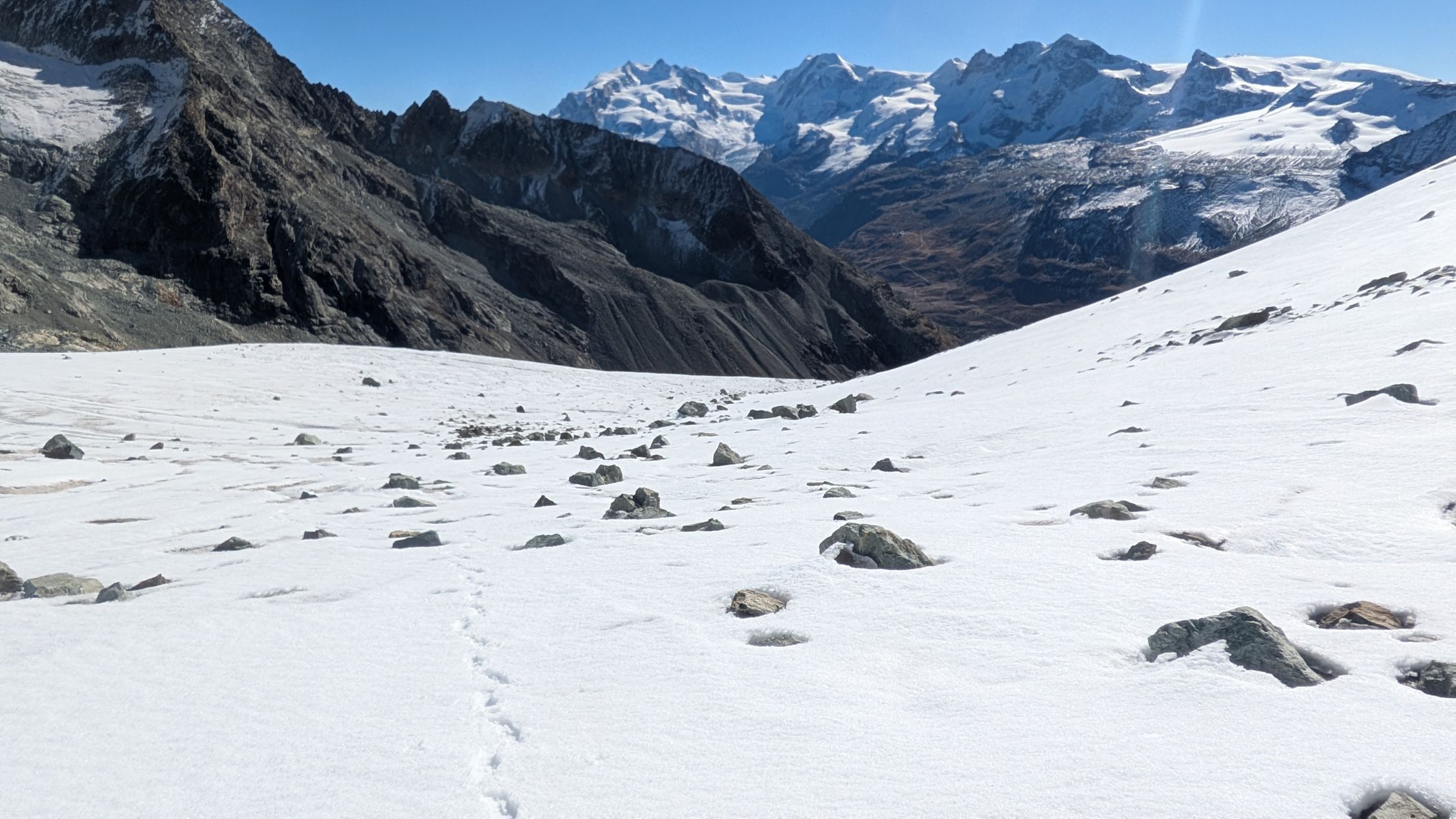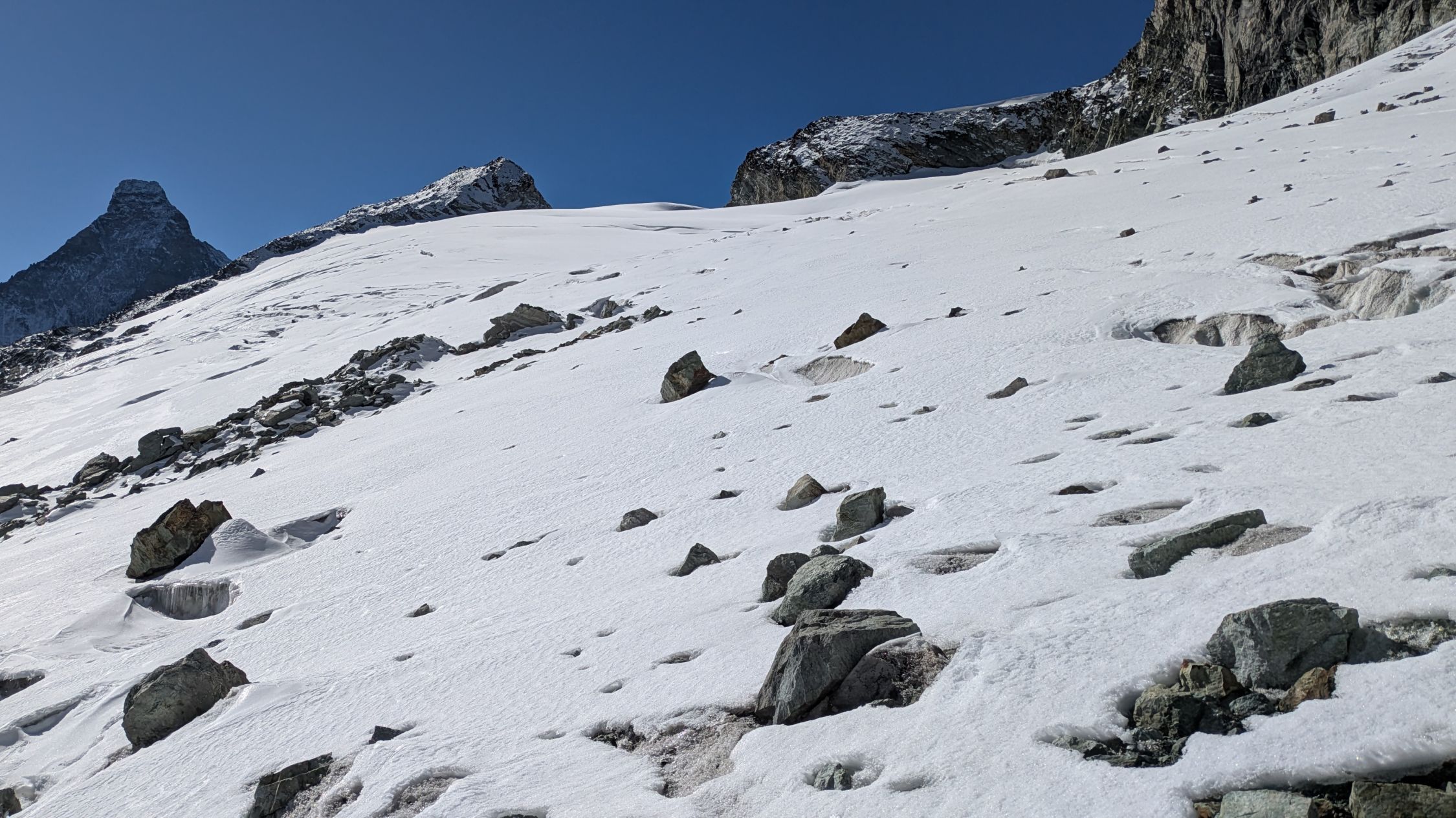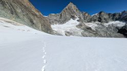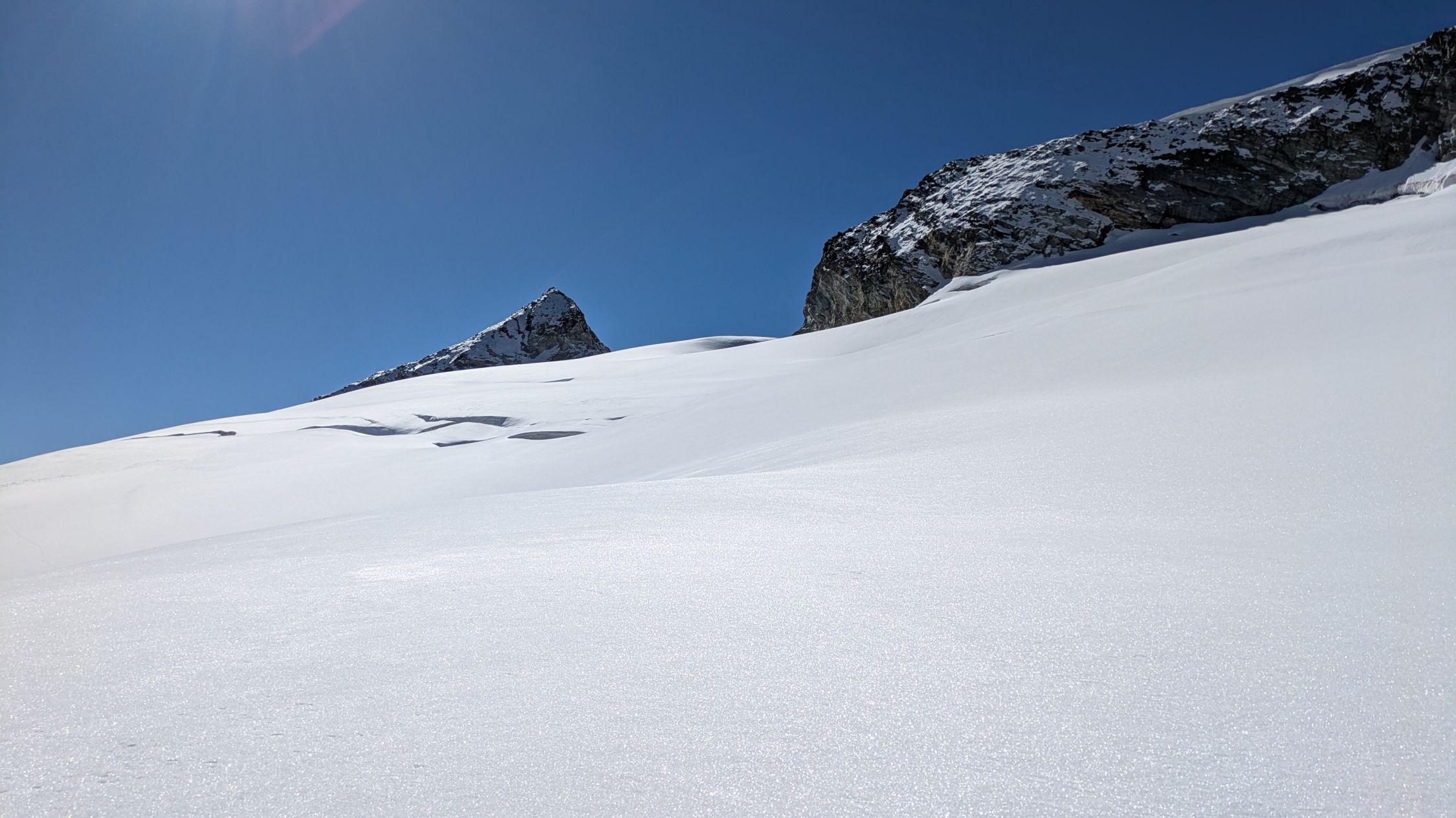 Der Gletscher ist zum Teil frisch eingeschneit, unten tragend oben pulvrig und am Gipfelhang bricht man zwischen den Steinen ein.