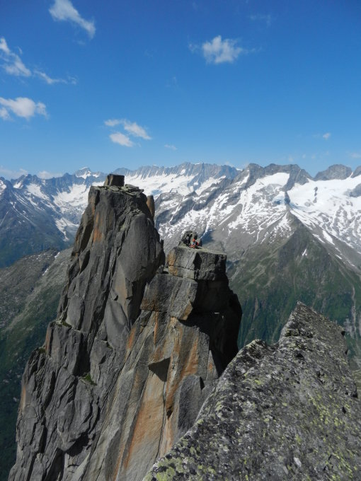 Die Kletterei am Grat haben wir so angetroffen, wie sie im "extrem Ost" beschrieben ist. Die Traverse am Turm V zwischen S28 und S29 hatte früher einmal viele Schlaghaken. Diese Haken wurden entfernt. Am besten geht's, wenn der Vorsteiger vom Stand ca. 3m abgelassen wird und dort unten mit der Traverse beginnt. Der Nachsteiger pendelt dann einfach nach. Ähnlich ist die erste SL am Gipfelturm, also die SL zwischen S31 und S32. Dort gibt es zwei Varianten: 1) Der Vorsteiger wird ca. 5m abgelassen, pendelt nach rechts zu einem Riss und klettert diesen hoch bis auf den Grat. 1.5m unterhalb des Grats hat's einen BH. An diesem kann der Nachsteiger dann hinüber pendeln (diese Variante ist so im Topo). 2) Man seilt ca. 20m ab und pendelt ca. 15m nach rechts auf ein Band. Von dort führt ein Risssystem zu S32. Variante 2 ist wahrscheinlich empfehlenswerter.