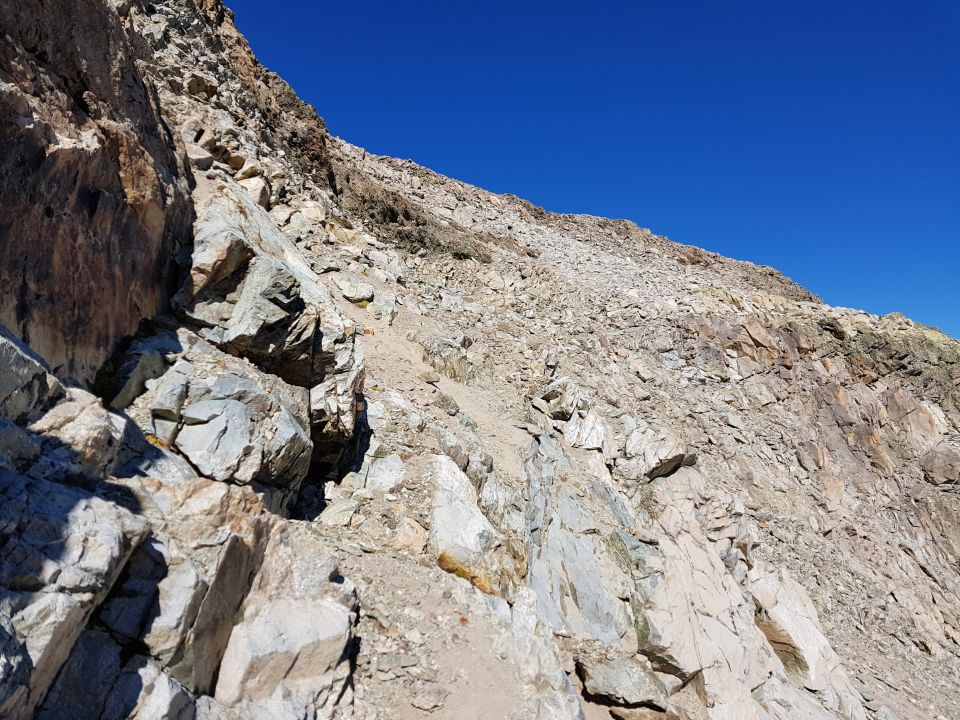 Ich folge direkt unter den Felsen der S-Wand auf einer Art Tierspur über ein paar sandigen Kiesrinnen nach E bis zu einem grasigen Abschwung, der sich bei ca. P2625 Hm befindet (T4). Hier hat man eine sehr gute Einsicht zur etwas anspruchsvolleren Überquerung. Wenn ich gut hinschaue, erkenne ich drei Bänder. Es gilt das höhere zu nehmen! Ich steige somit gleich kurz ausholend nach NW hoch, um den Einstieg im höheren Band vorzunehmen. Gleich am Anfang entdecke ich hier ein schwarzes 10 Meter Seil, der an einem Stein angemacht ist. Interessant ist die Tatsache, dass es an dieser Stelle gar kein Seil nötig ist? Zudem muss ich eher schauen, dass ich nicht darüber stolpere… Aber wenn man das Seil schon nicht zum Halten brauchen kann, dann wenigstens als Markierung für den Einstieg in diese Passage. Wer ihn sieht, liegt somit am richtigen Einstiegsort! Klar, die Passage ist ausgesetzt und ein Ausrutscher fatal, doch das Gelände ist bei trockenen Verhältnissen nicht besonders schwierig.
