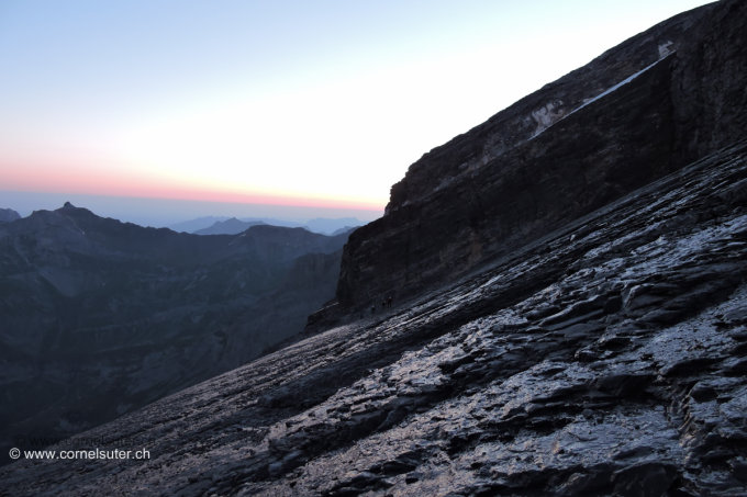 Ab der SAC Fründenhüte 2561m südlich abwärts zum Schutt bedeckten Fründengletscher, nun nach Westen nicht zu Tief haltend zum Einstiegsband. Die Traversierung im Band trocken. Der weitere Aufstieg bis zum Kamin trocken. Hier hat es noch ein wenig Schnee zum übersteigen. Danach geht es auch trocken weiter bis zu den Schutt bedeckten abwärts geschichteten Felsplatten, hier muss mit viel Geschick diese Platten nach Westen gequert werden, man gelangt zu einem weiteren Platten Bereich welcher nicht so stark mit Schutt bedeckt ist, aber diese Platten waren pflotsch nass…. ein geübtes Auge erkennt in den Platten ein leicht ausgedehntes Band, weniger steil als die Platten, welches hinüber zum Doldenhorngletscher führt.