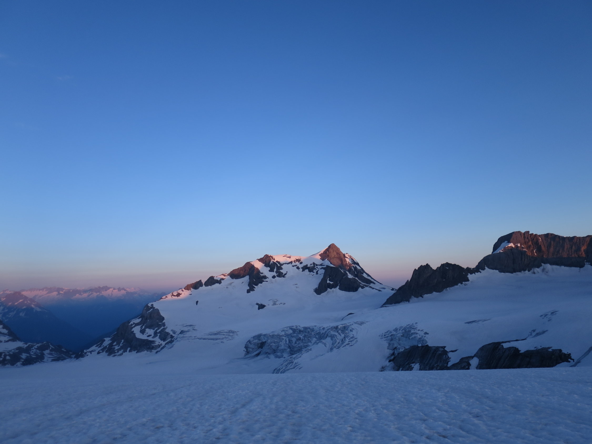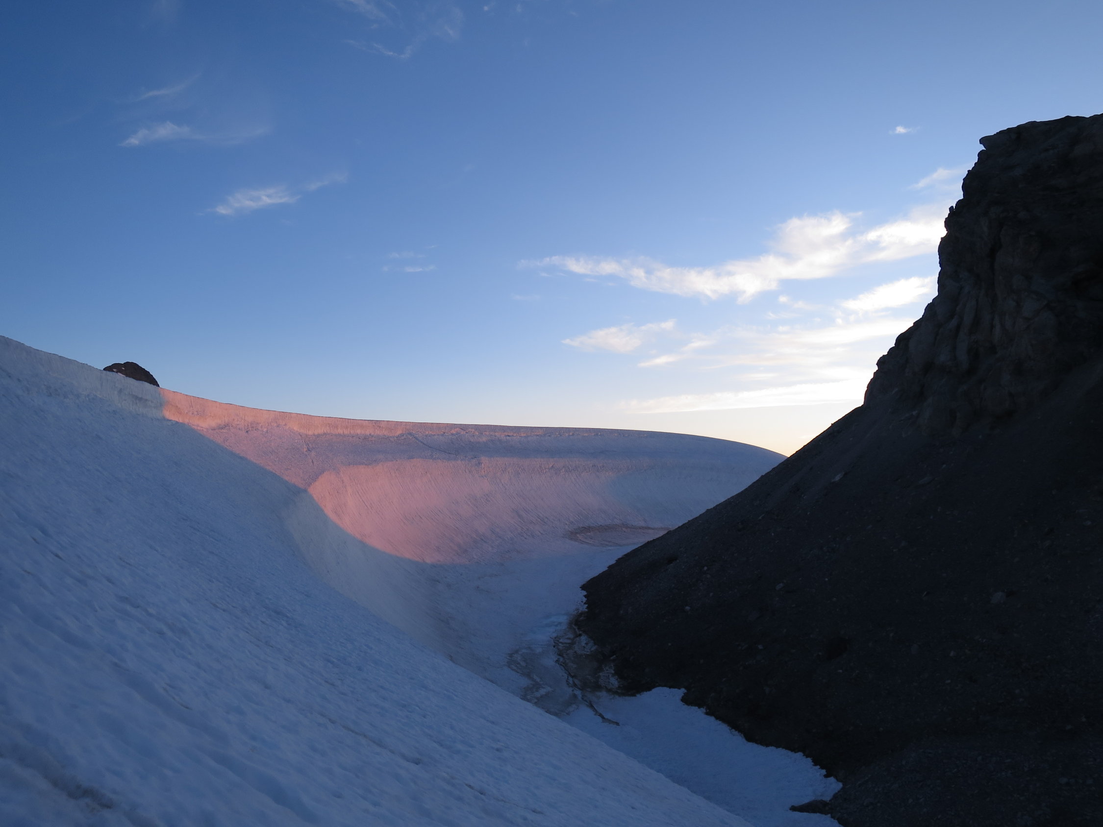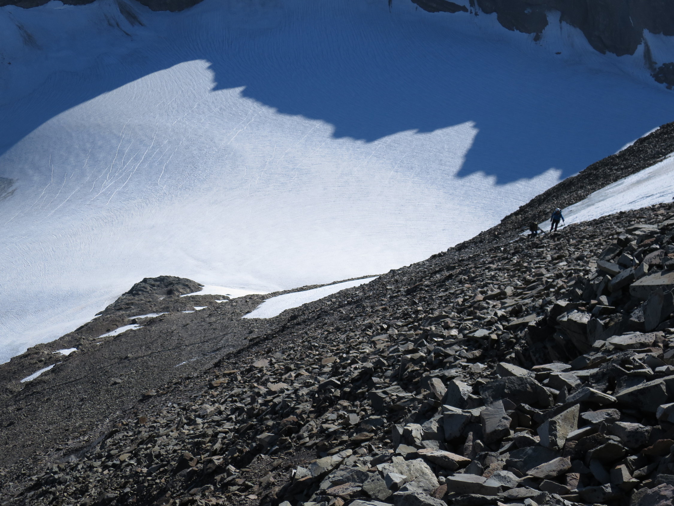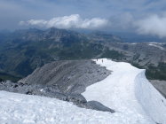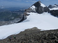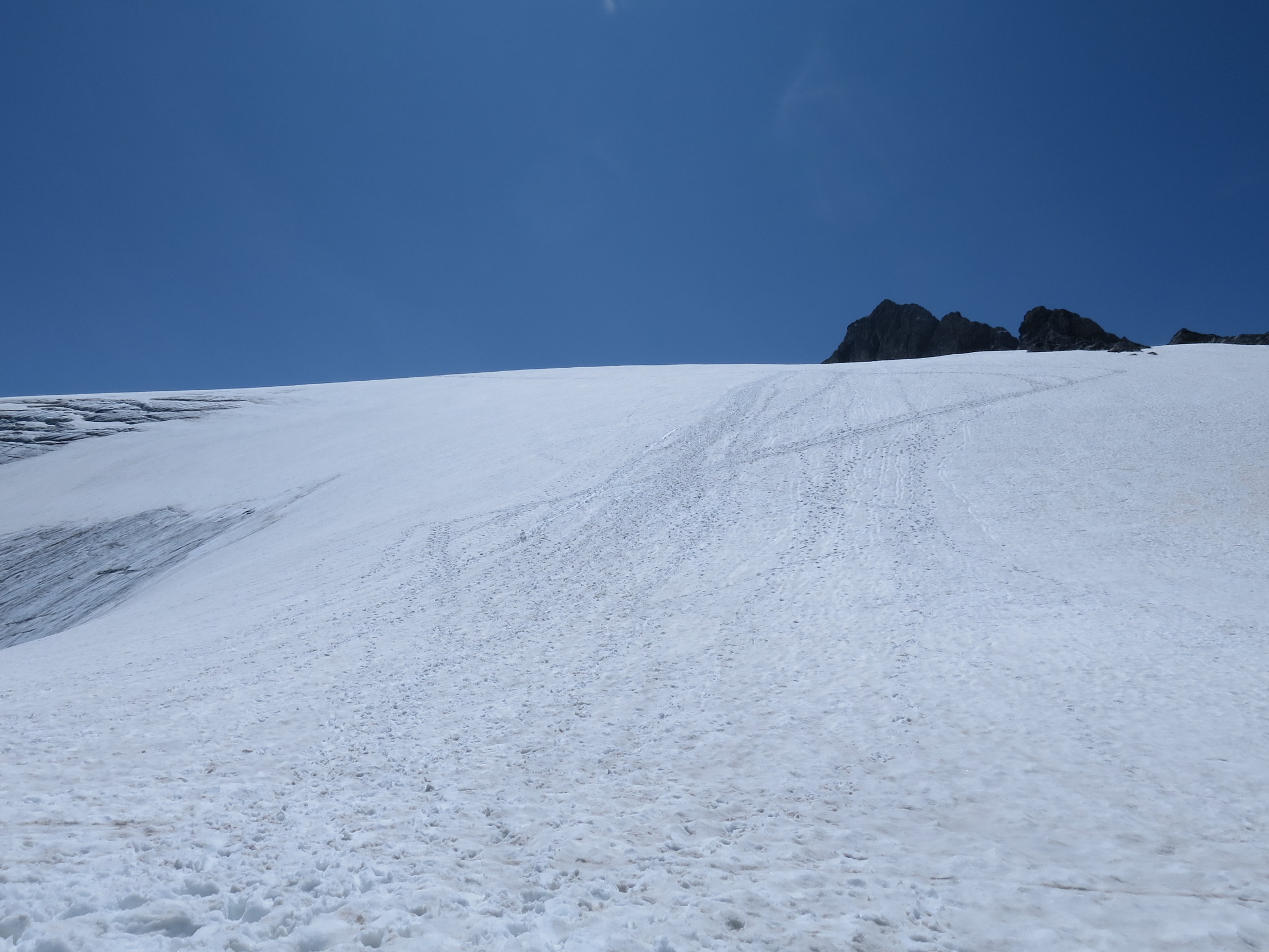 Gute Verhältnisse, Spalten und Bergschründe sind mehrheitlich gut zugeschneit, ein wenig Vorsicht ist geboten am Fusse der Nordflanke des Gross Schärhorns: dort öffnet sich der Bergschrund. Aufstieg durch die N-Flanke durch Geröll; oben auf der Schulter schneebedeckt, ebenso die zu traversierende S-Flanke. Oberer Teil des Gipfelbereichs schneefrei und trocken. Gletscher probllemlos begehbar, Iswändli komplett schneebedeckt. Einzelne Schneefelder im Abstieg zum Klausenpass verkürzen den Abstieg.