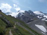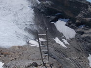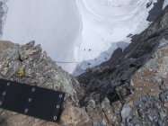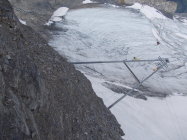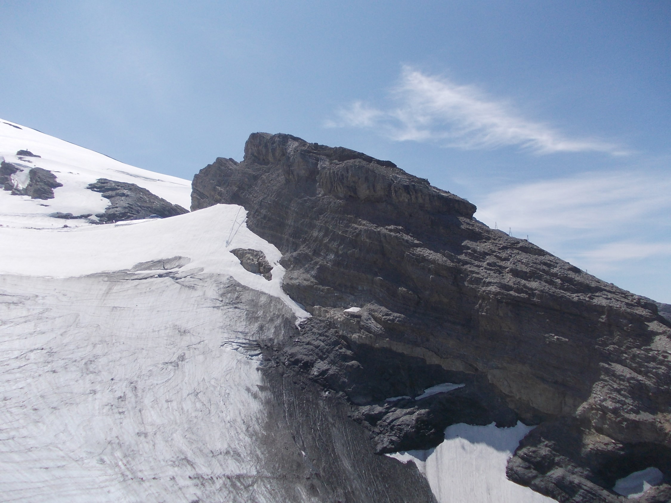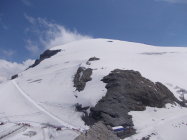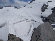 Die Gletscherquerung ist schon weitestgehend aper. Steigeisen sind dort momentan zumindest hilfreich. Die Schneezunge reicht noch genügend weit zum Einstieg hinauf, derzeit auch noch kein Bergschrund. Möglicherweise könnte das bei weiterer Ausaperung problematischer werden. So gesehen halte ich eine Besteigung des Rotstöckli in den Monaten Mai bis etwa Anfang Juli für die wohl geeigneste Zeit.