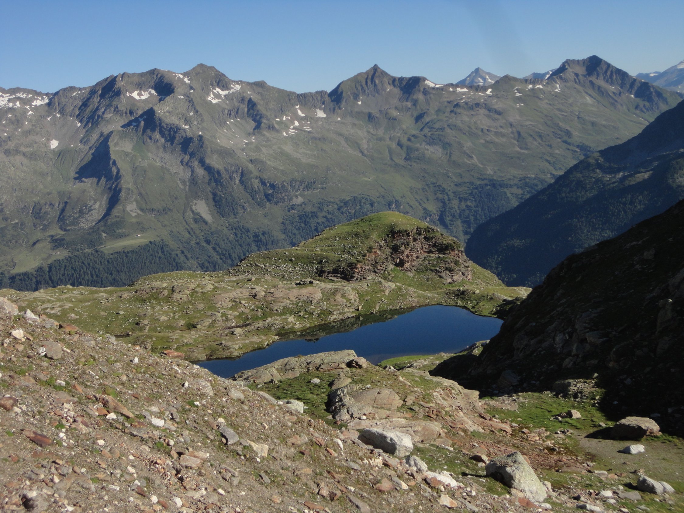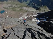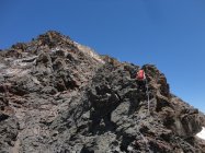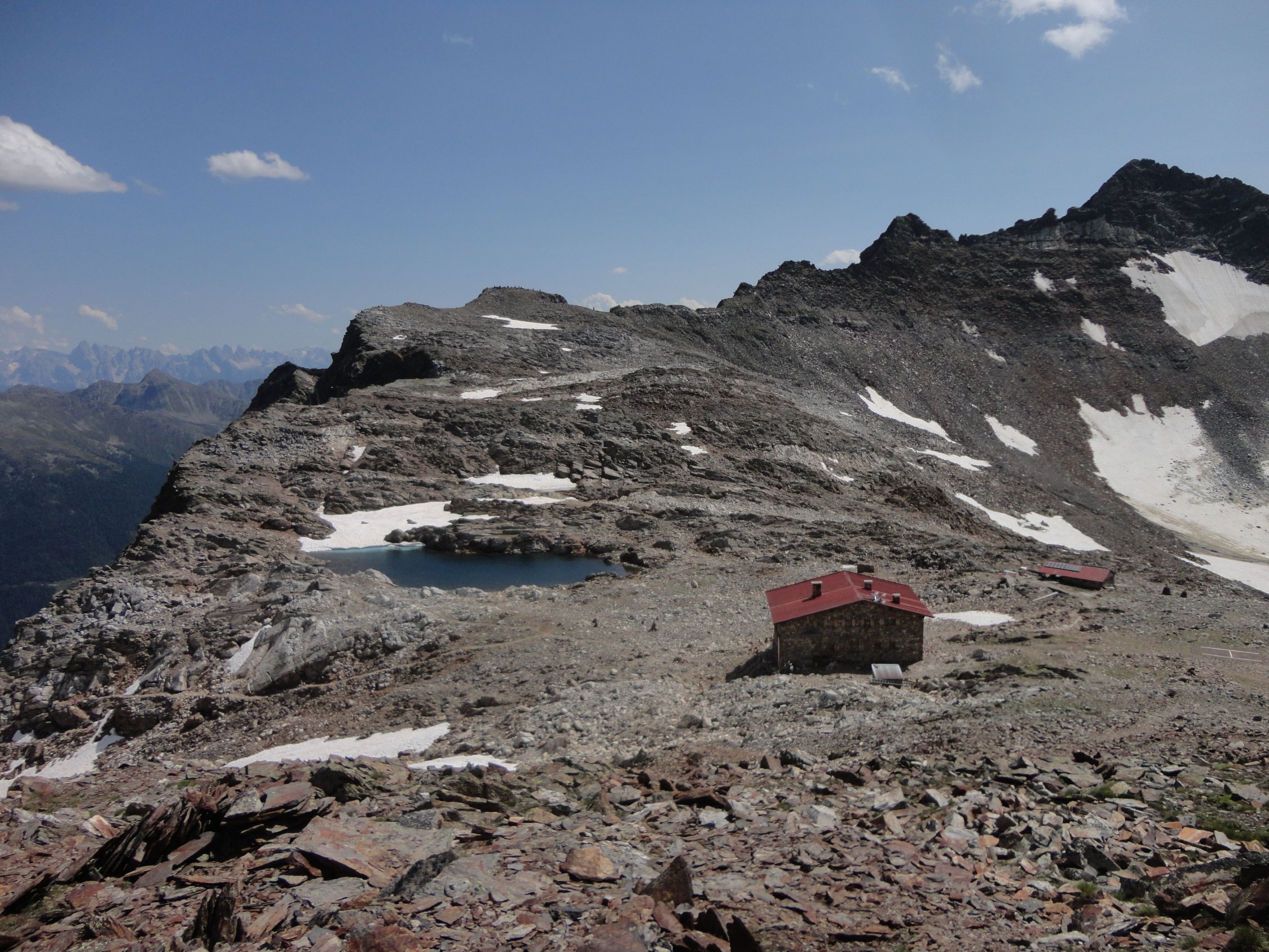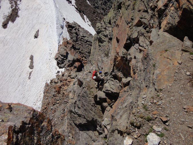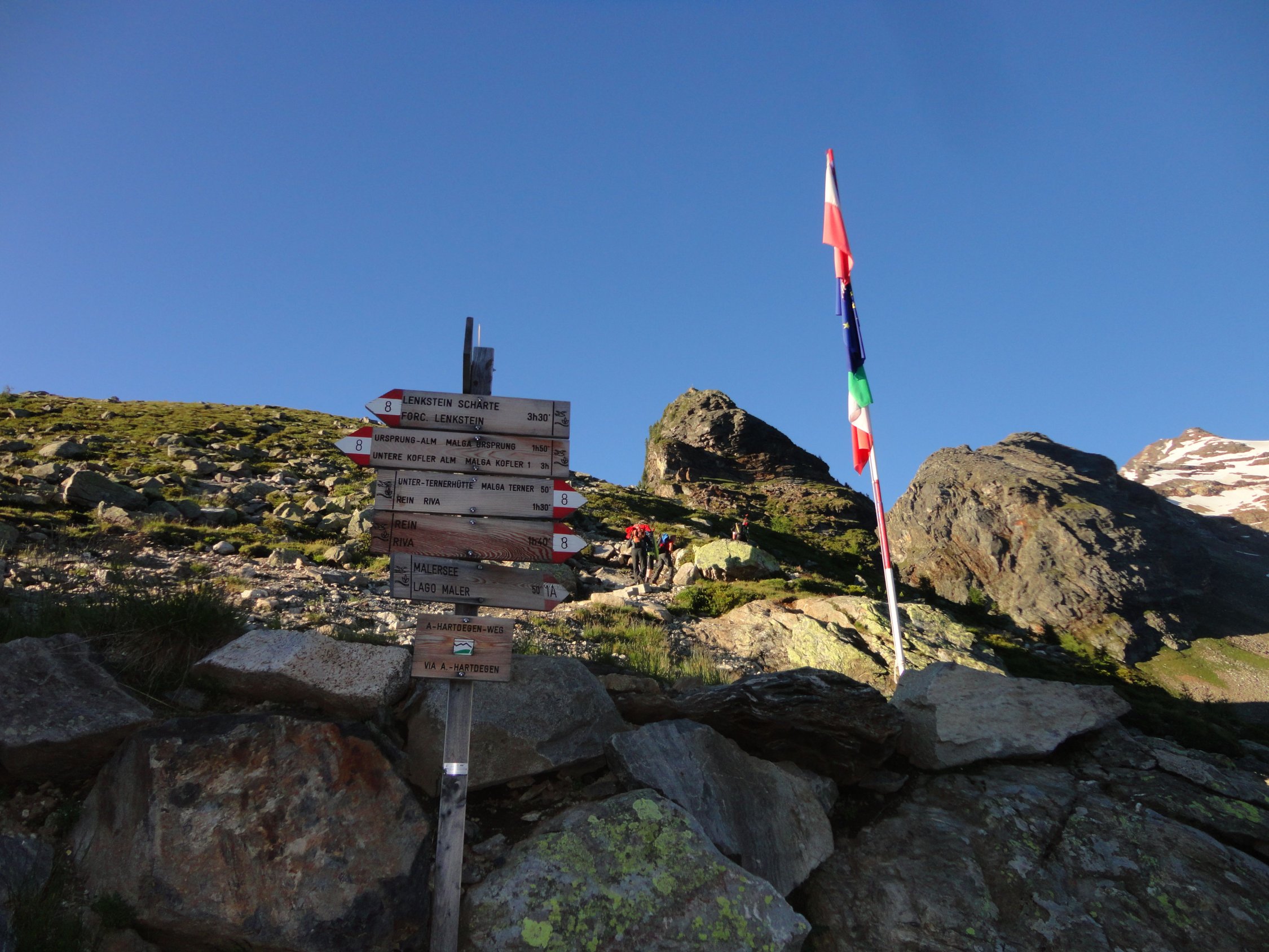 N-S-Überschreitung zum Magerstein ab Kasseler Hütte Von der Kasseler Hütte (2.276 m) auf bez. Weg Richtung Malersee, der zunächst einige Zeit bergab führt, nach Überschreitung einer Klamm jedoch wieder ansteigt. Kurz nachdem man einen kleinen Gebirgsbach überquert hat, erreicht man eine Weggabelung mit Wegweiser Malersee nach rechts. Hier biegt man jedoch links ab und folgt den Steigspuren (rote Markierungen und Steinmänner). Auf einer Höhe von etwa 2.800 m gelangt man auf einen breiten Blockgrat, dem man unschwierig bis zu einem auffälligen Steinmann folgt. Kurze Gletscherquerung nach Osten zum Gratansatz und auf dem Nordgrat in teils brüchigem, sandigem Gelände (I) zum Gipfel des Schneebigen Nocks (3.358 m). Abstieg Richtung Südosten auf markiertem Steig durch die bröselige Flanke und zuletzt über eine kettengesicherte Passage in die Scharte zwischen Schneebigem Nock und Fernerköpfl (II). Im Firn hinüber Richtung Fernerköpfl und in plattigem Gelände auf den Vorgipfel. Von hier nochmals steiler drahtseilgesicherter Abstieg (II) auf einen Firngrat und auf diesem zum Fernerköpfl (3.249 m). Kurzer Abstieg im Blockgelände auf den westl. Rieserferner und über den Gletscher mit Umgehung des Frauenköpfls auf den Magerstein (3.273 m). Zurück bis kurz vor den Gipfel des Fernerköpfls, Abstieg auf markiertem Weg zur Rieserfernerhütte (2.798 m) und durch das Gelttal hinunter in´s Tauferer Tal, welches man etwas 4 km vor Rein in Taufers erreicht (Aufstieg insges. ca. 1.400, Abstieg 2.100 hm).
