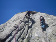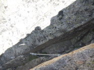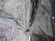Alles trocken. Sehr schöne Tour. Absicherung gut+ trifft nicht ganz zu, v.a. in der 1.SL leicht knifflige Stellen bis mehrere Meter über Haken. Zusätzliche Absicherung dort z.T. nicht möglich. Originelle Abkletterstelle im oberen Bereich. Dort hängt ein Fixseil, frei geklettert löst sich die Stelle gut auf, man muss sich am Einstieg nur "klein machen", um zur Schuppe darunter zu gelangen.