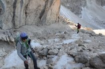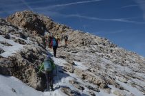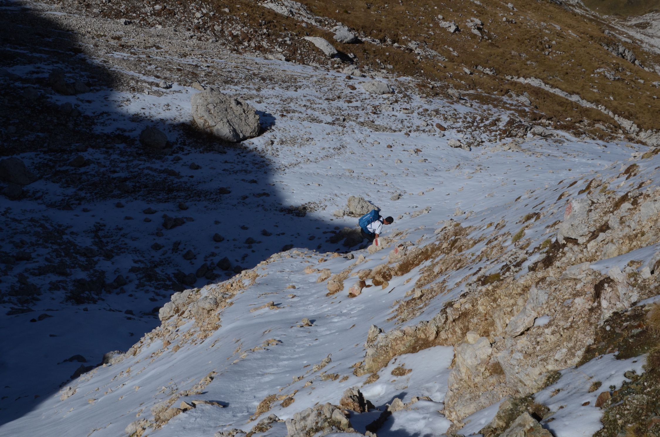 Beste Bedingungen bis kurz vor dem Gipfel. Kurz davor, weil auch nordseitig, liegt sehr viel Hagel noch liegt. Dieser ist zum Teil geschmolzen und hat sich zu Eis gebildet.