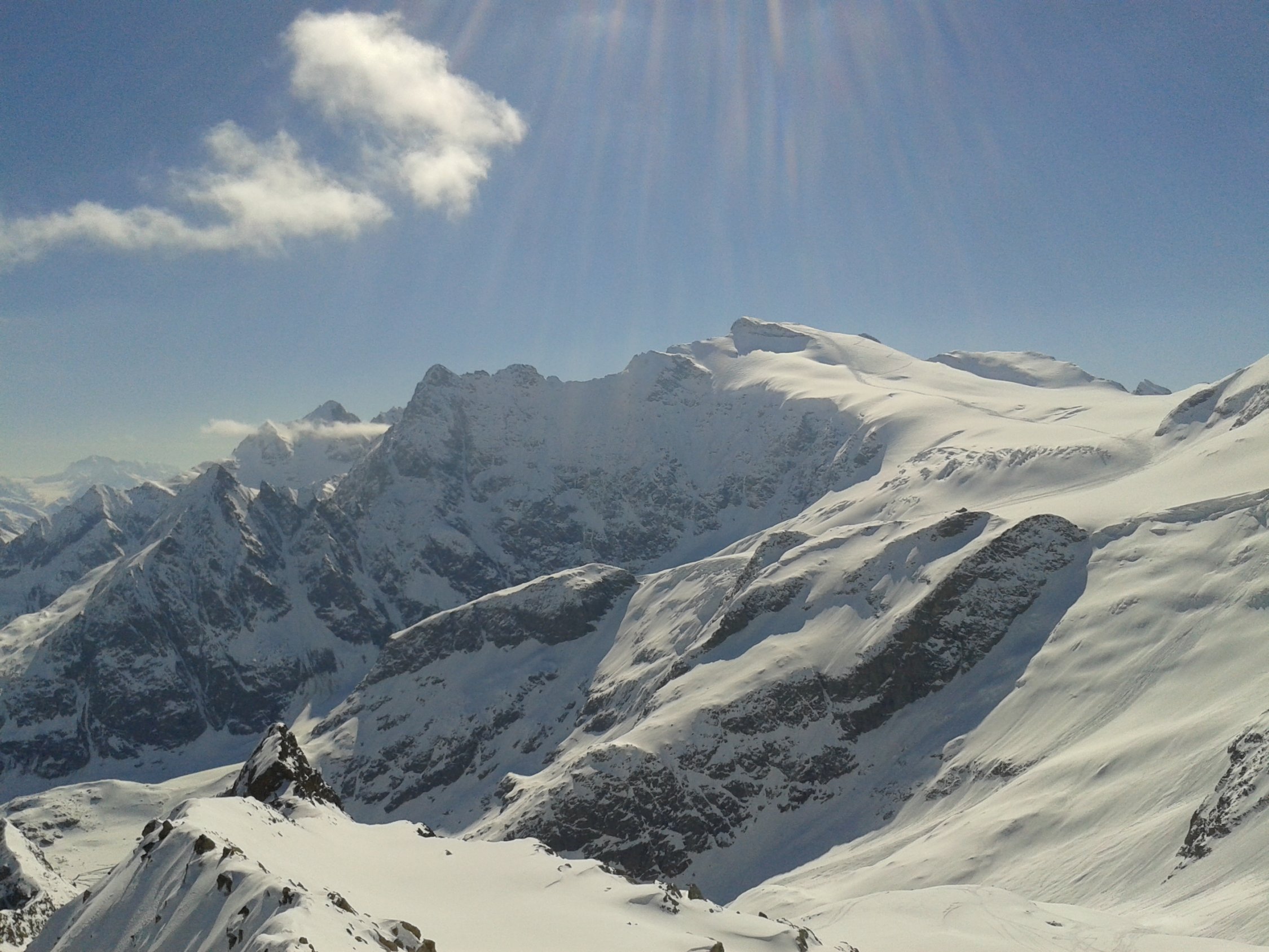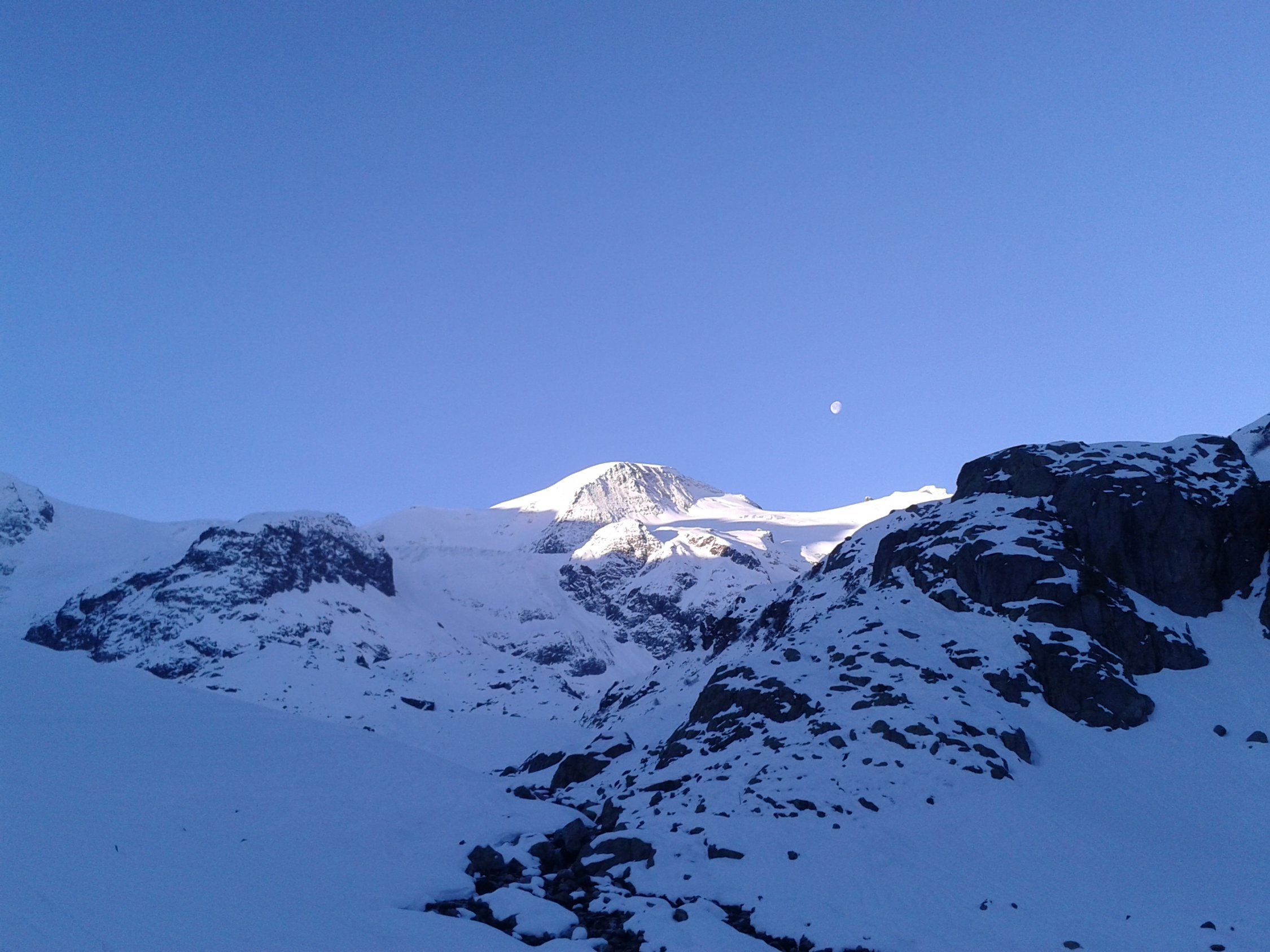 es gab reichlich Schnee in der letzten Woche. Das Gebiet war winterlich und flächendeckend tief verschneit. Um 6 Uhr war schon sehr viel Los und viele Leute waren unterwegs. Es war eine klare Nacht und der Aufstieg ging sehr gut. Auch das kurze steilere Stück über die Felsen zum Gipfelhang konnte problemlos mit den Ski gemacht werden. Die Sonne hat den vielen Schnee aber bis um die Mittagszeit schnell aufgeweicht. Der nass werdende neuere Schnee ergab eine Kraftraubende Abfahrt.