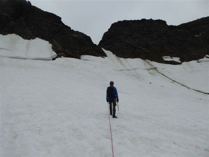 Ochsentaler Gletscher noch gut eingeschneit. Allerdings machen sich im untersten Gletscherteil die heißen derzeitigen Tage schon bemerkbar. In wenigen Tagen ist hier mit Blankeis zu rechnen. Von der "Grünen Kuppe" her hat sich ein neuer Weg etwabliert. Man quert unter den 2 ersten markanten Wasserfällen nach rechts und steigt dann durch Schutt(Steigspuren, Steinmänner) an den ganz rechten Gletscherrand. Dann Anstieg wie üblich. Derzeit werden hier die Steigeisen montiert. Man kann jedoch auch über den üblichen Weg hinauf, dieser ist jedoch schon blank u. teils Schuttübersäät.