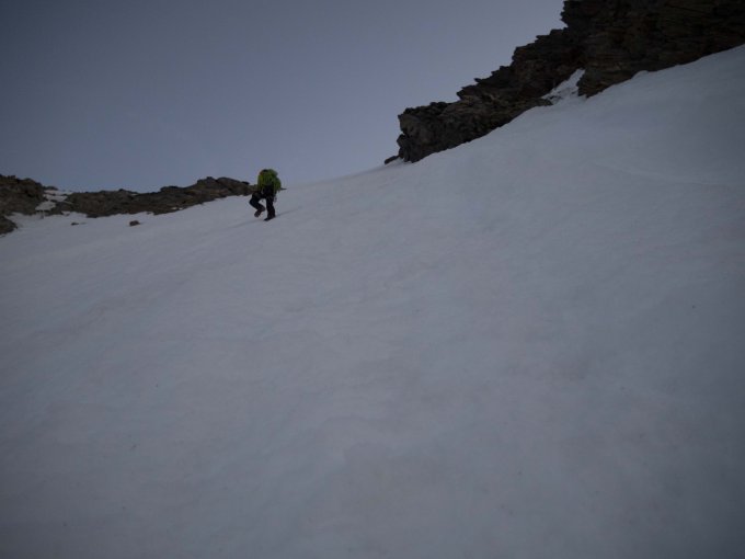Der Einstieg ins Südwandcouloir ab dem Strahlegggletscher ist ohne Mondlicht nicht ganz einfach zu finden. Die exakten Abzweigkoordinaten sind 652 945 / 158 220.