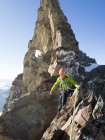 Der Grat besteht aus vielen einzelnen Türmen, die man am besten alle direkt überklettert. Steilenweise lohnt es sich die Türme auf der Rückseite nicht abzuklettern, sondern sich gegenseitig abzulassen bzw. abzuseilen. In den Flanken ist der Grat sehr brüchig.